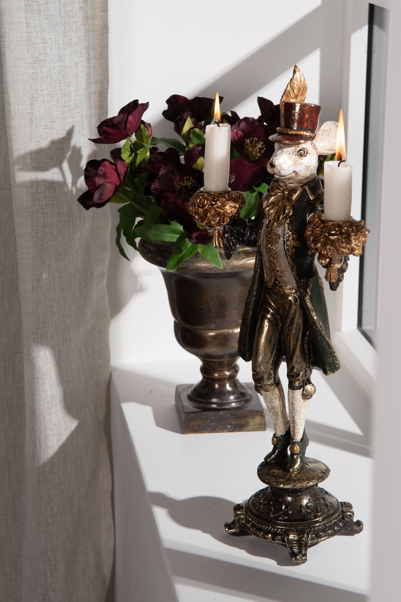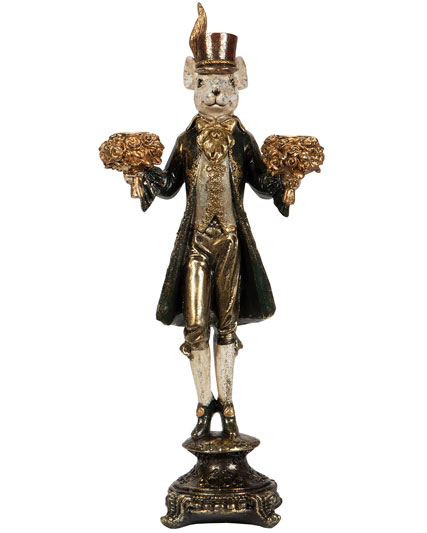Høy og staselig to-armet lysestake. Av alle ting er det en mus med hatt, frakk og ellers flott antrukket, som holder lysene. Se på detaljene - den er jo bare herlig!