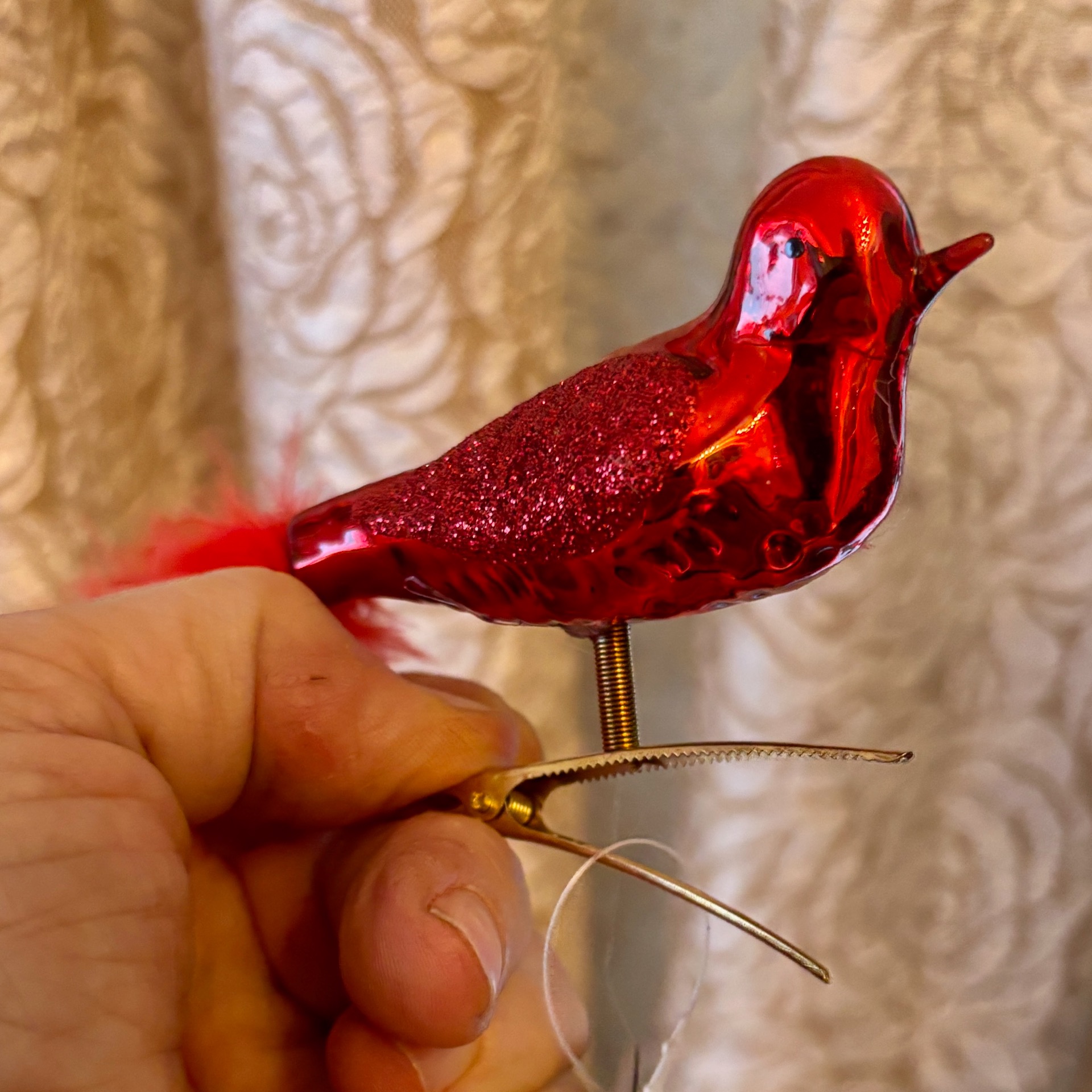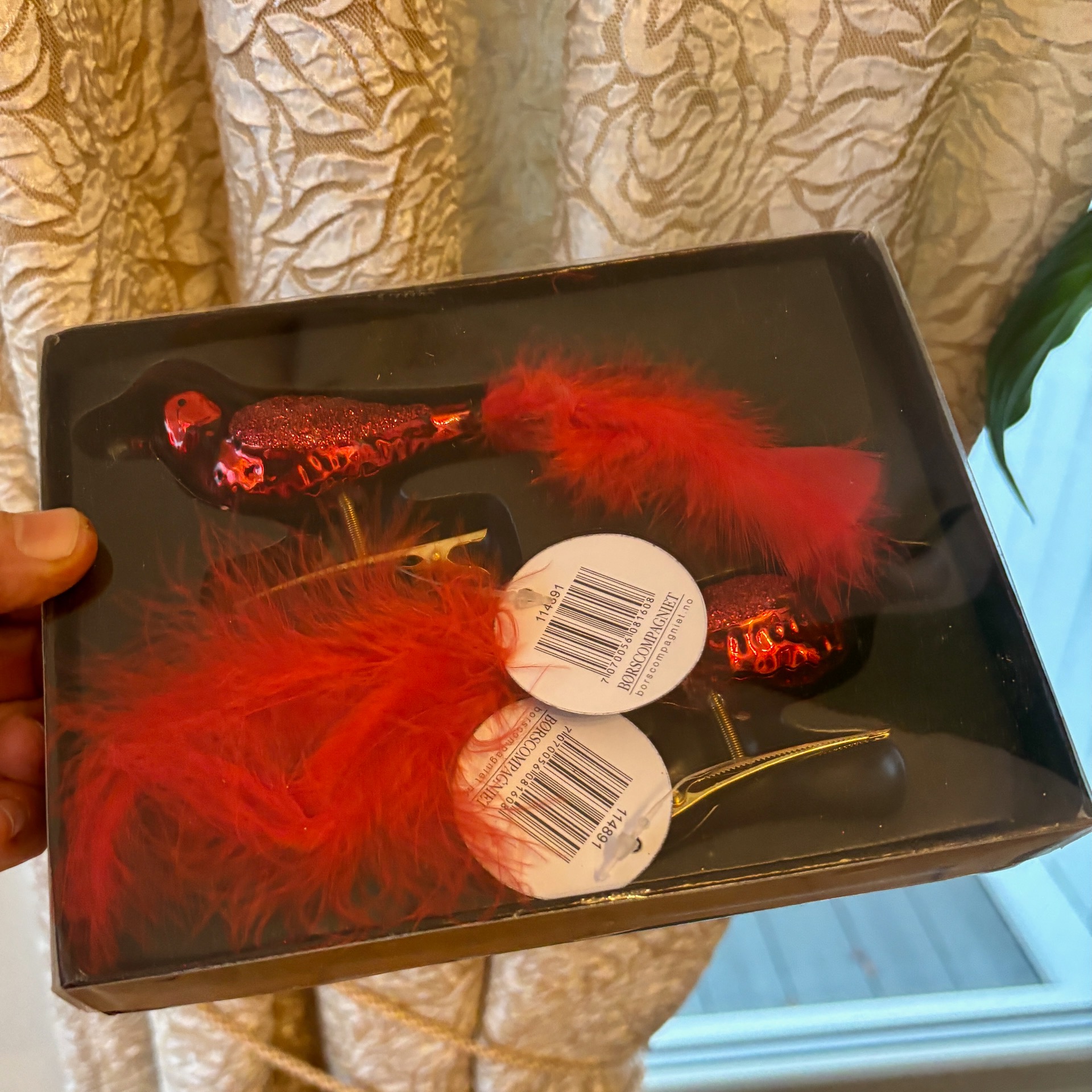 2-pakk med røde fugler med stor fjær-pyntet hale og med gullfarget klype. En fin pynt til juletreet!