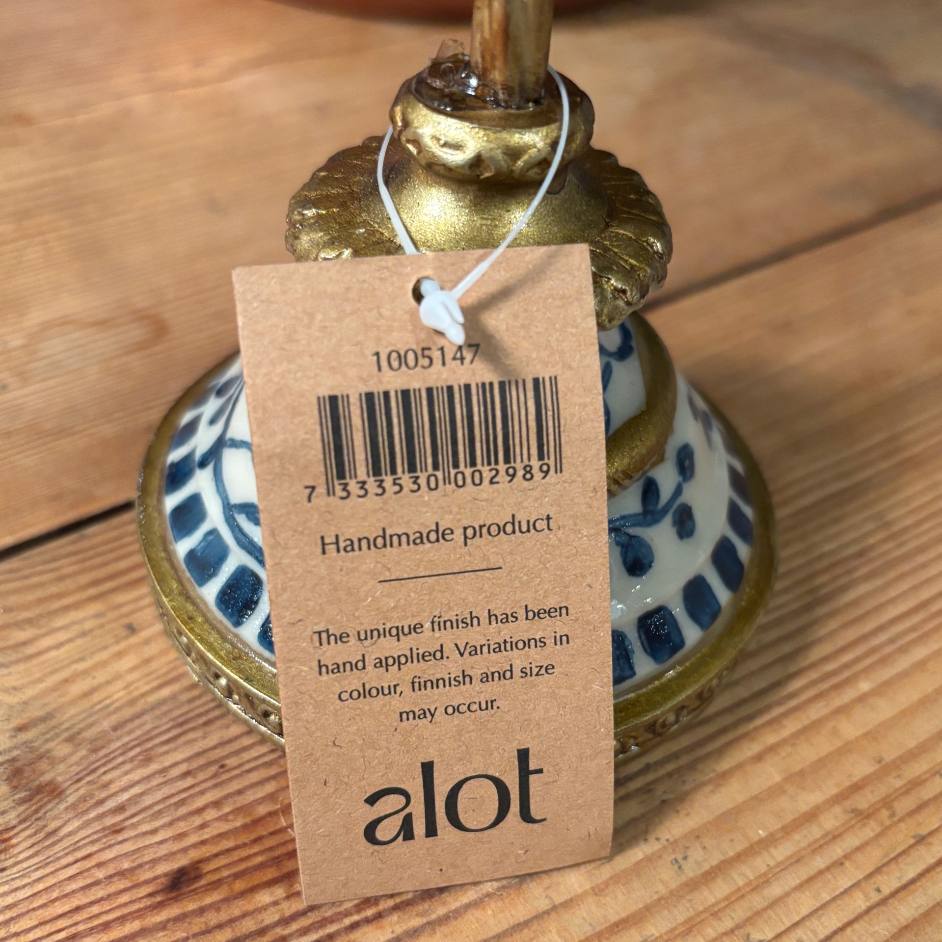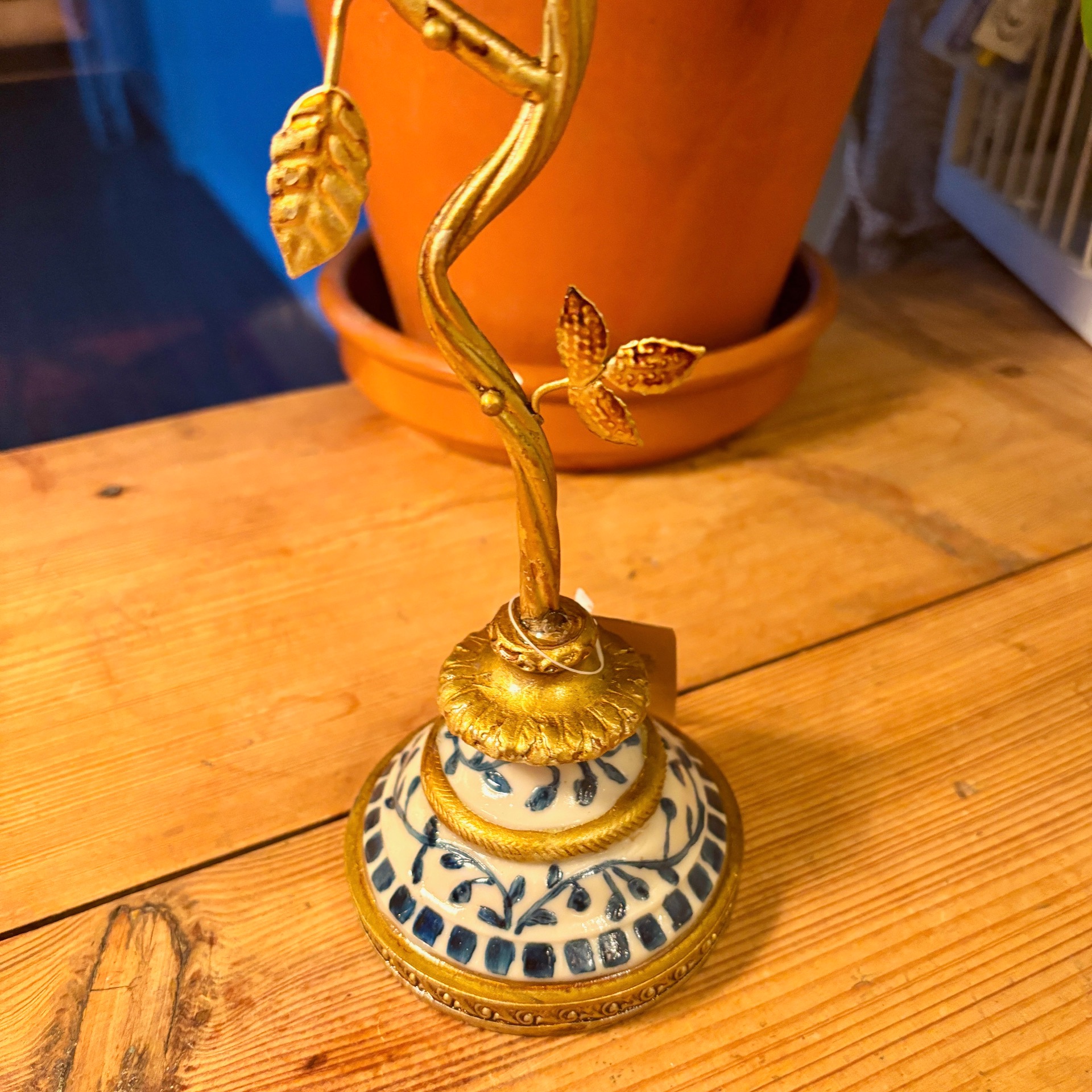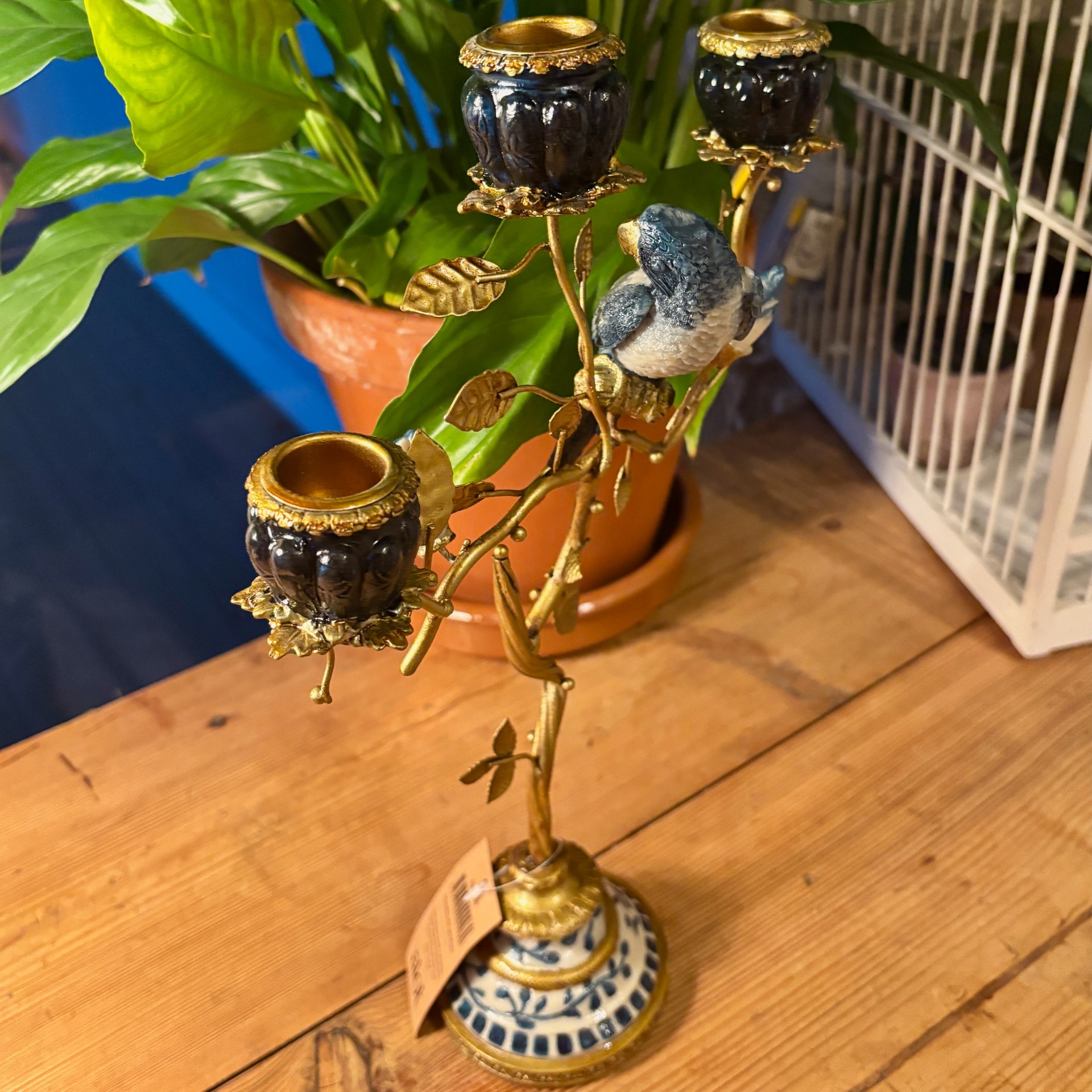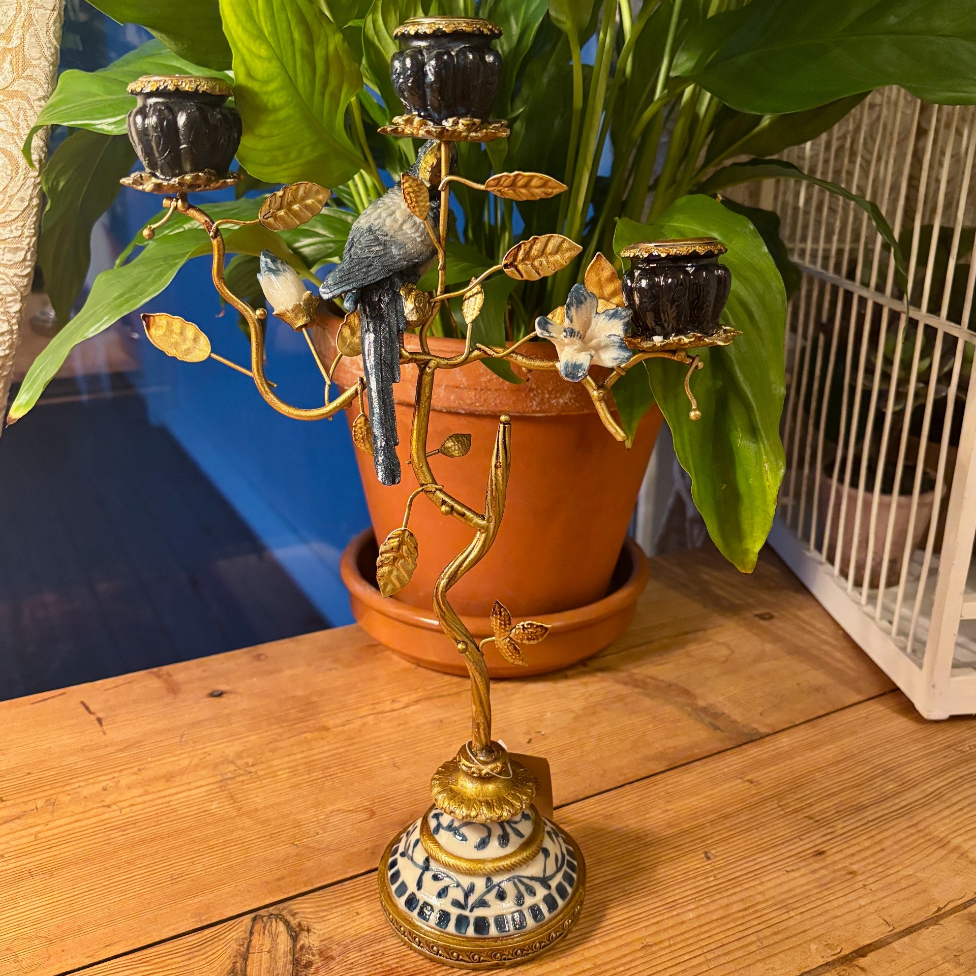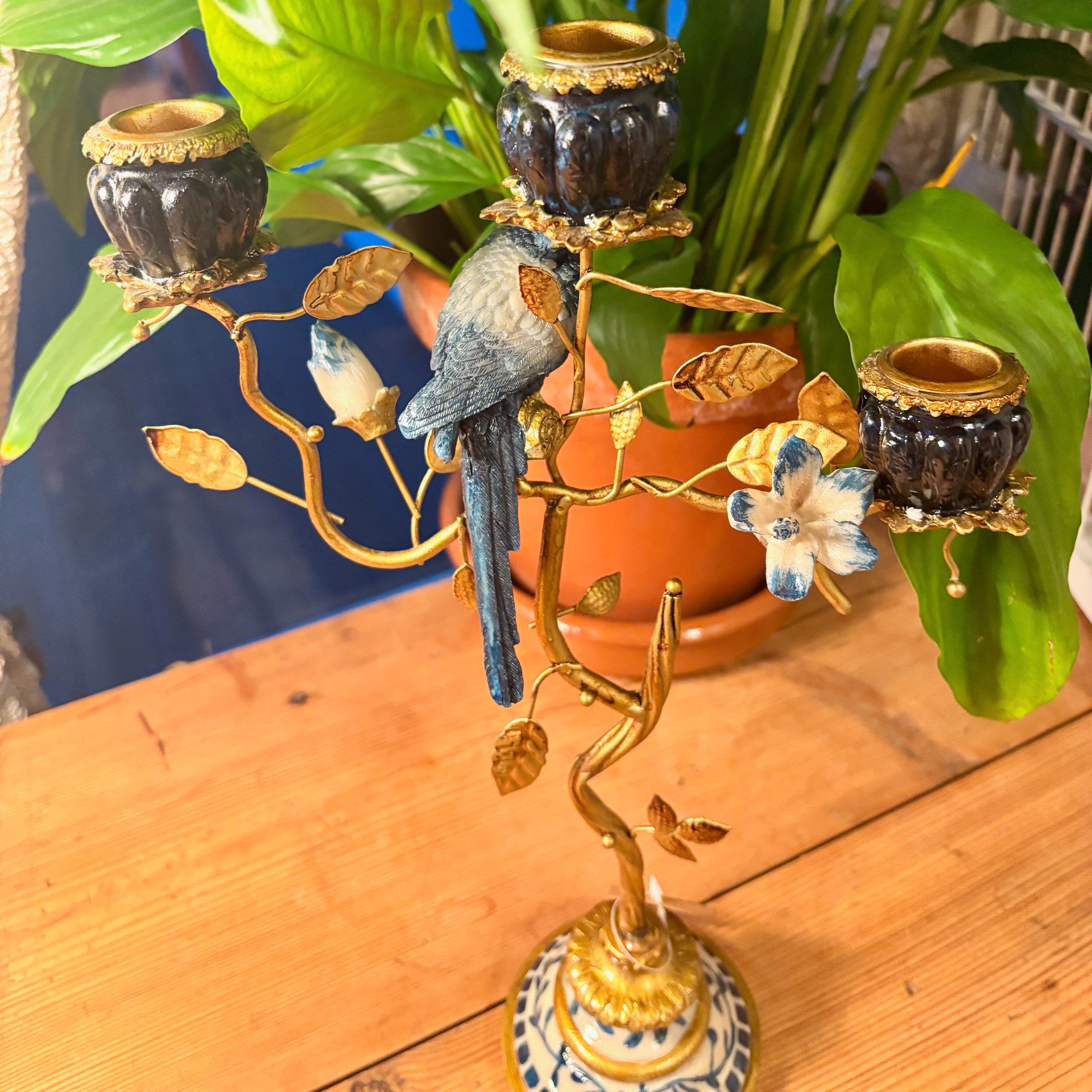 Hvis du liker interiør som er litt "too much", så vil jeg tro at du liker denne herligheten her av en lysestake! Den er laget i polyresin og metall. Lysholdere har nydelig blå holdere med gulldekor, fuglen sitter på en gren og det er en knopp og en blomst på staken. Kikk også på foten - nydelige detaljer! Lysestaken er håndlaget - sånn som denne kan ikke lages i masseproduksjon (laget i Østen).