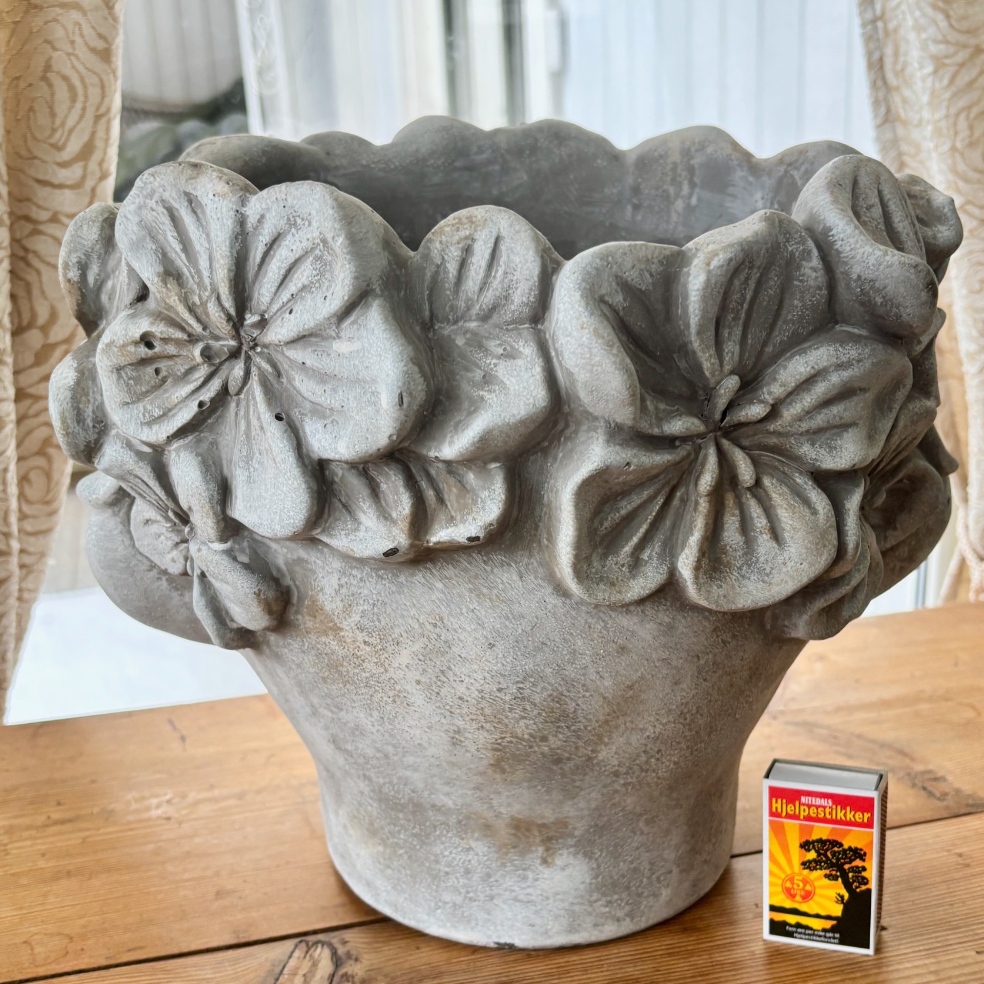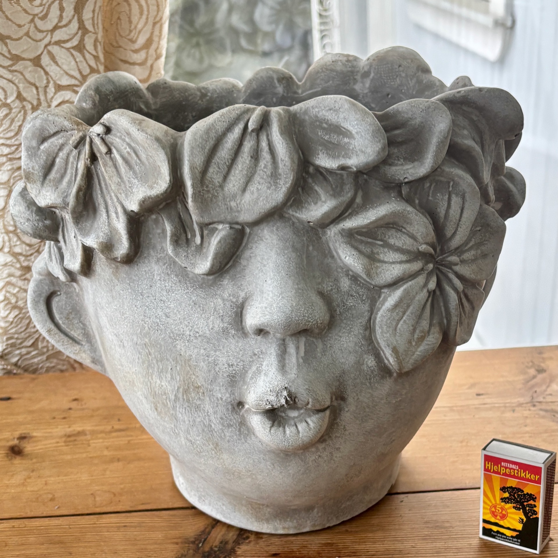 Stor og tung sement-potte og navnet er Adam. Nettbutikken har hatt denne inne før, men da i langt mindre utgave. Denne er såpass stor, så den kan kun hentes på Nesbru i Asker - den sendes ikke. Det kommer opp automatisk forslag om levering til kr 99,- på ordren, men det gjelder ikke i dette tilfellet (får ikke slått av det valget, dessverre). Passer godt til hage og terrasse, men når vinteren/kulda kommer, må denne inn. Frost og vann gir sprekk og knus.