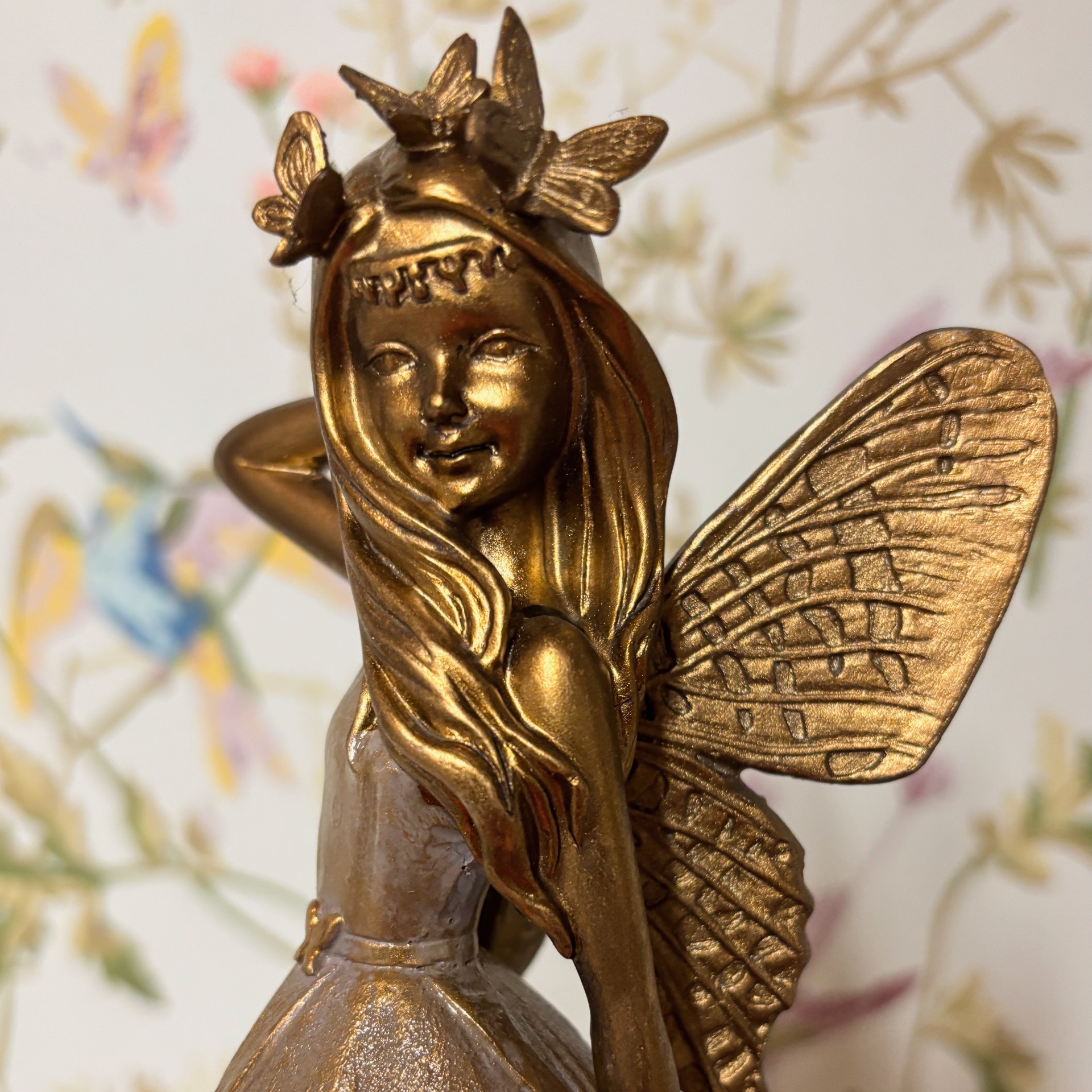Høyde er 23 cm, figuren er laget i polyresin og fargen er gull/brun. Kjolen går i gull/hvit-farge og sokkelen hun står på har et lite skinn av grønt.