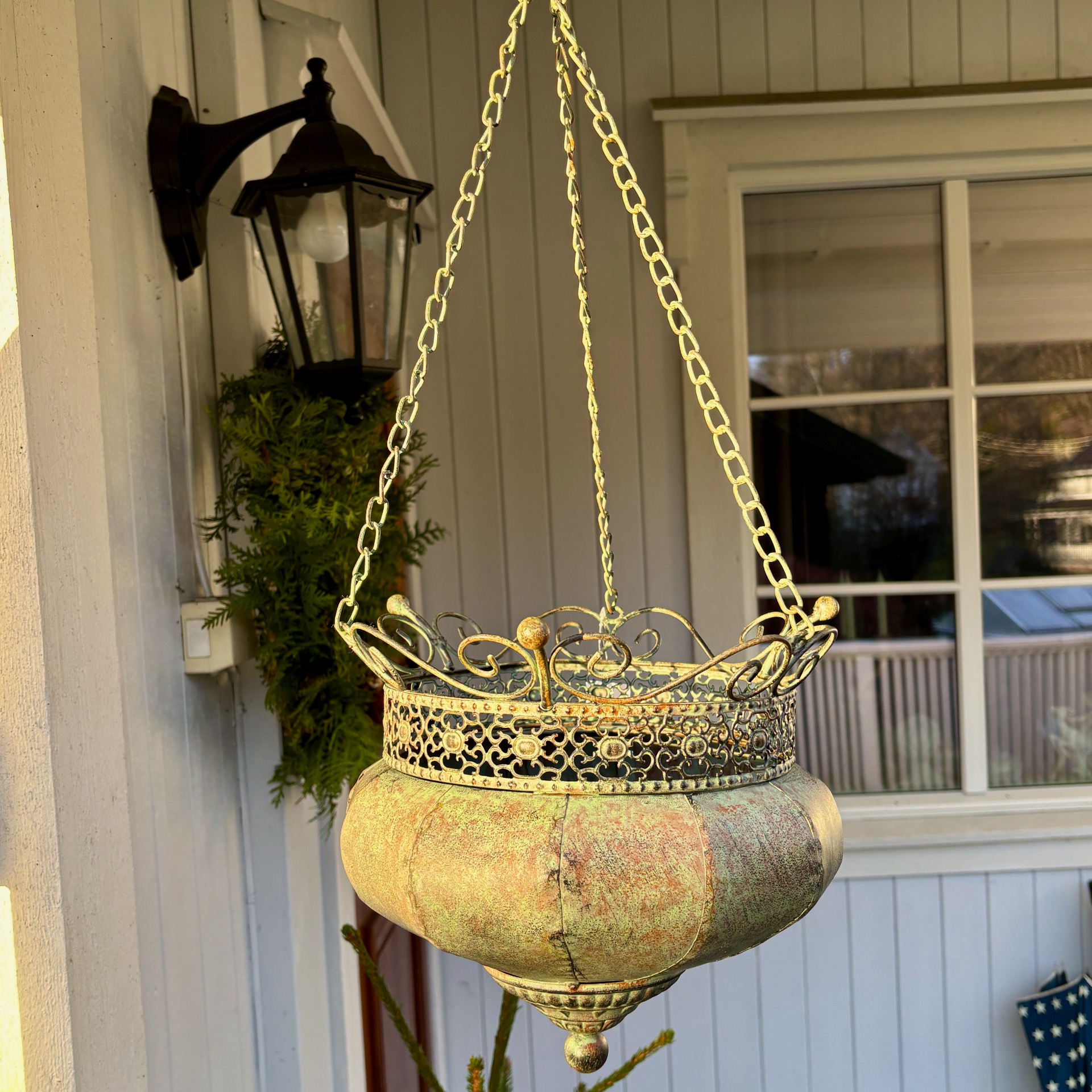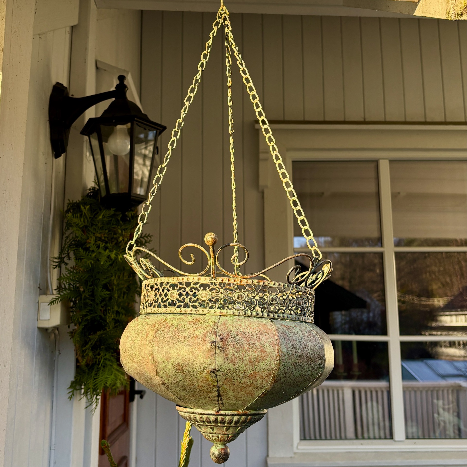 Er du ute etter en ampel som virkelig synes og i tillegg er vakker, så se her: Denne her er laget i metall, er i fargen antikk grønn og har en nydelig kant. Den henger i tre lenker med en god krok.