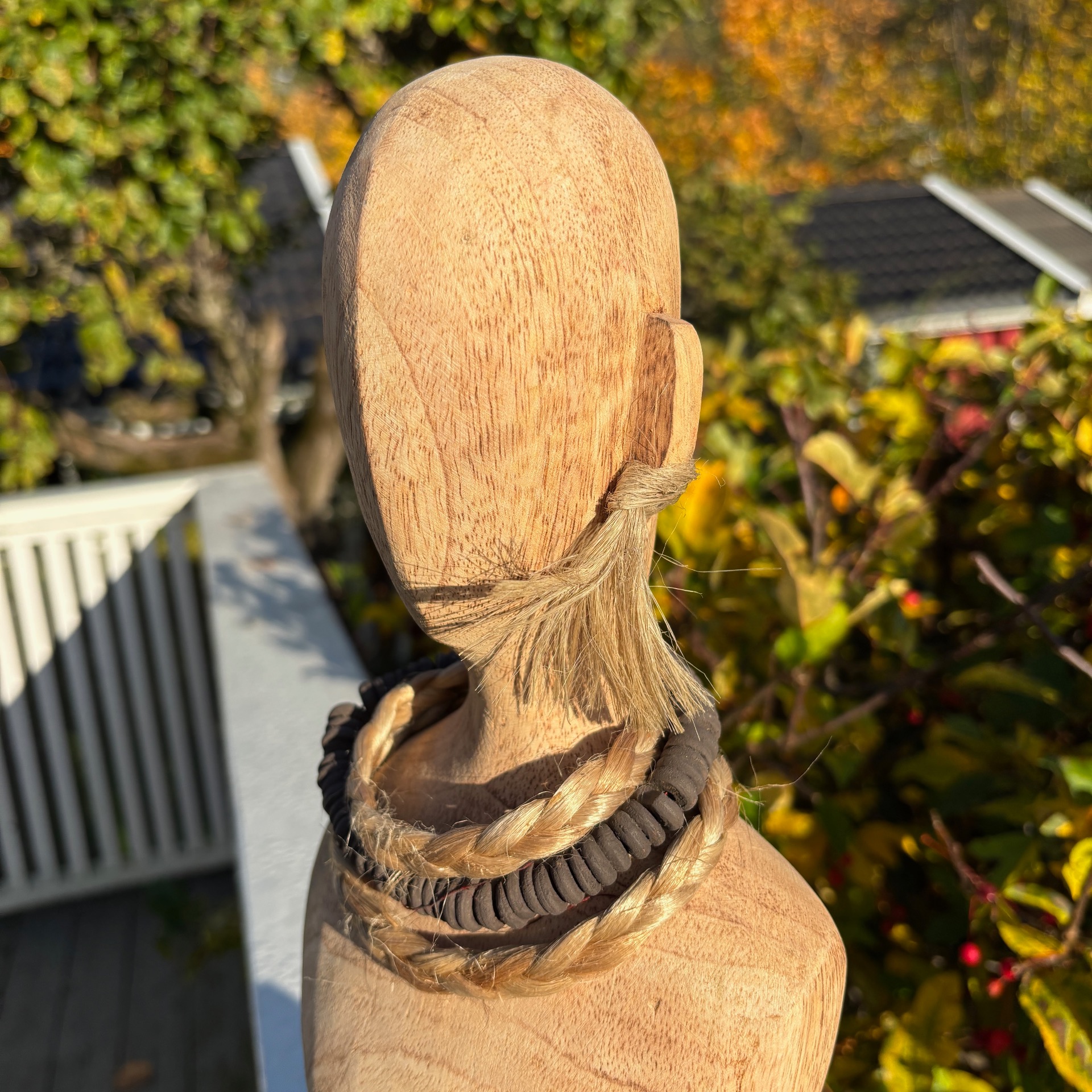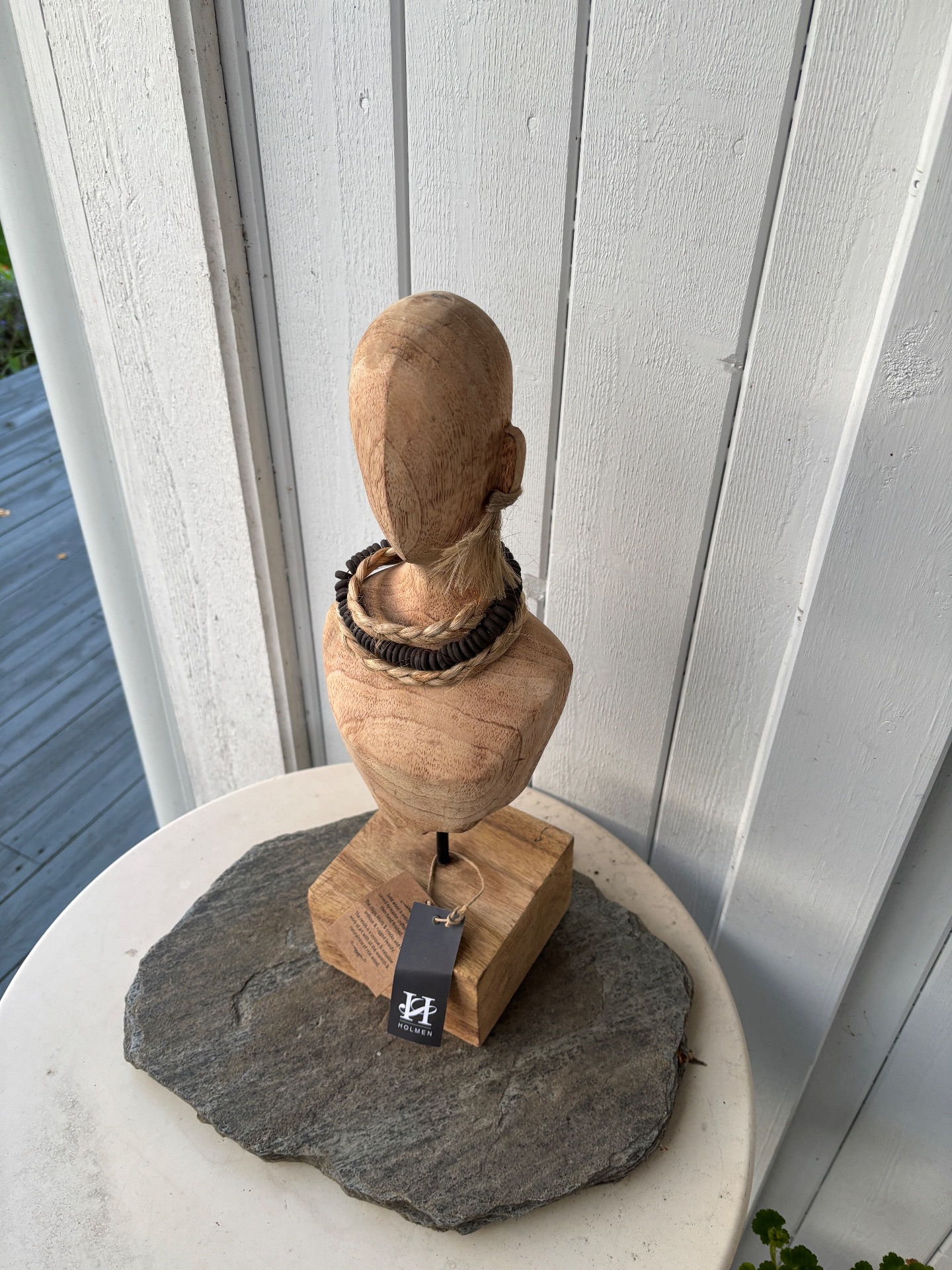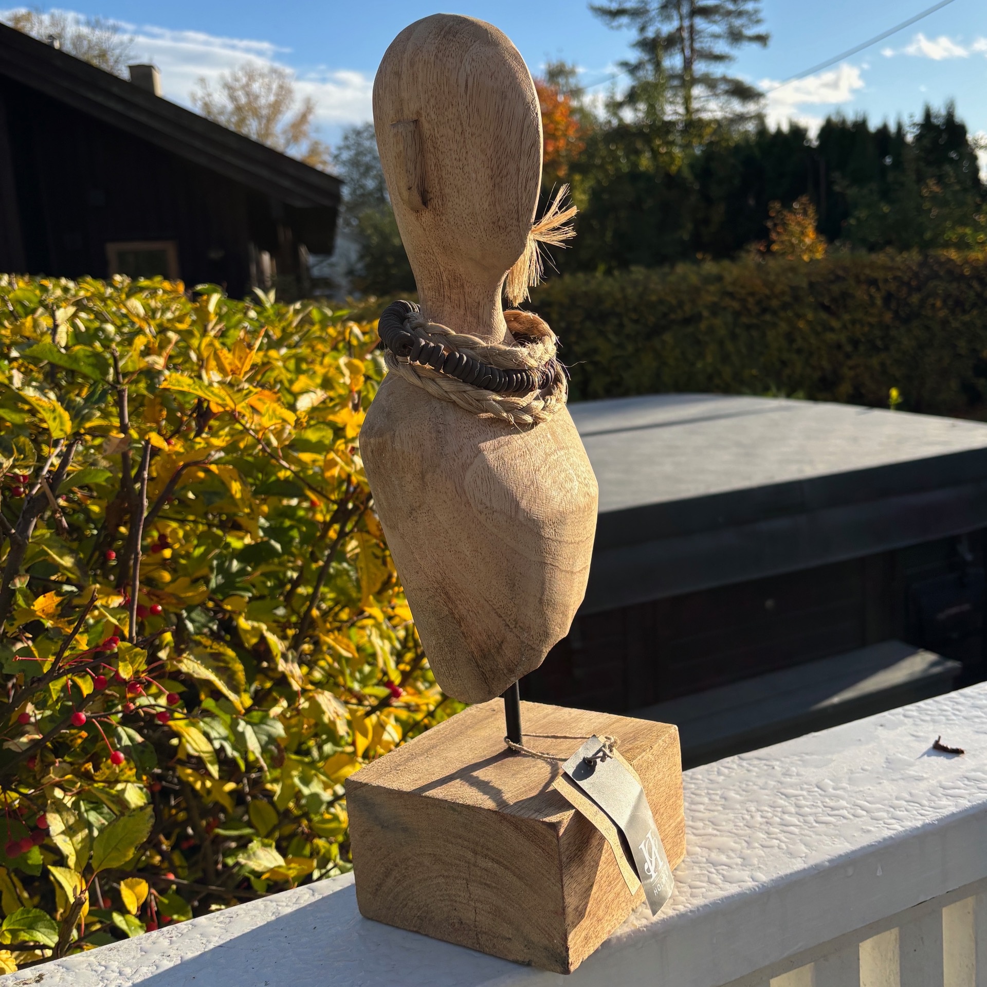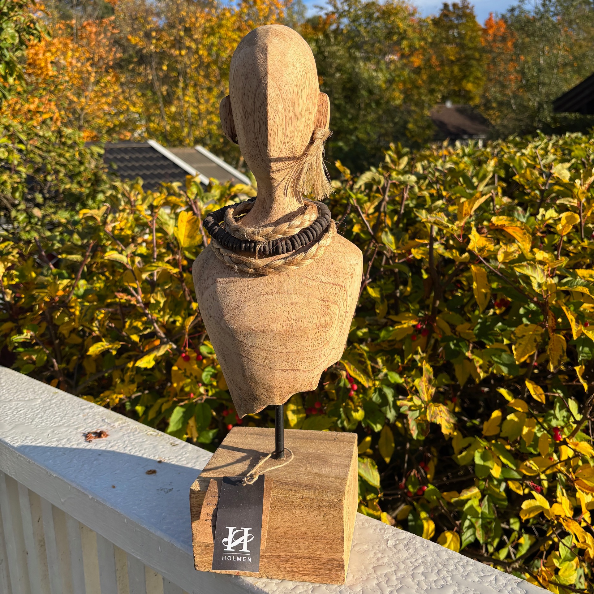Ganske høy figur i naturtre med løse kjeder rundt halsen (kan ikke tas av) og det ene øret har hengende, naturfarget pynt. Figuren står på en firkantet treblokk. Produsent er Holmen.