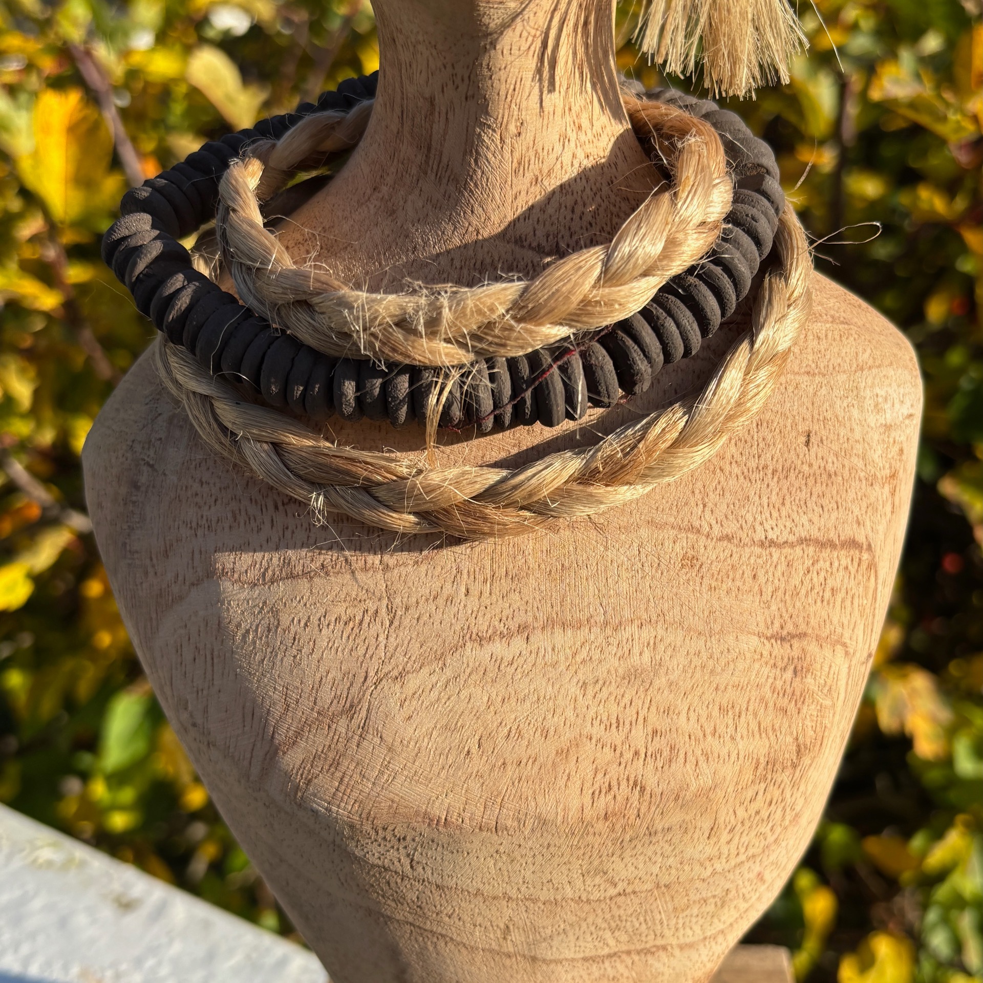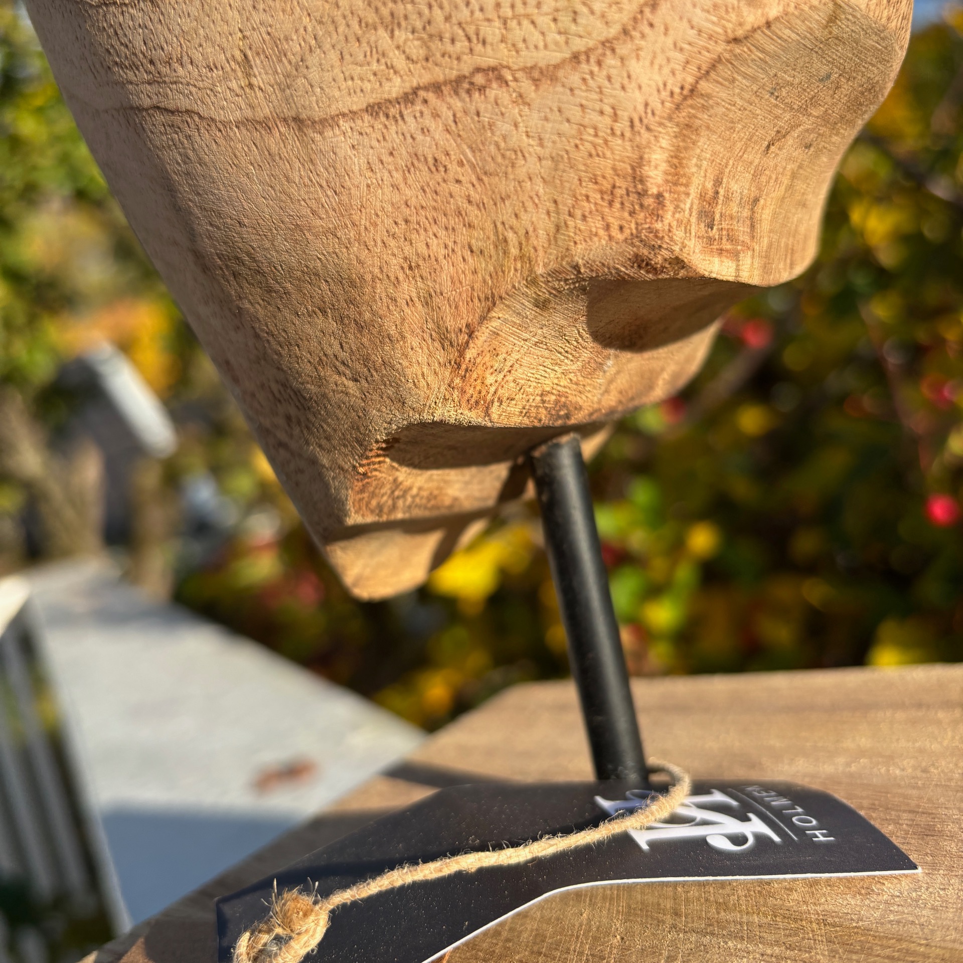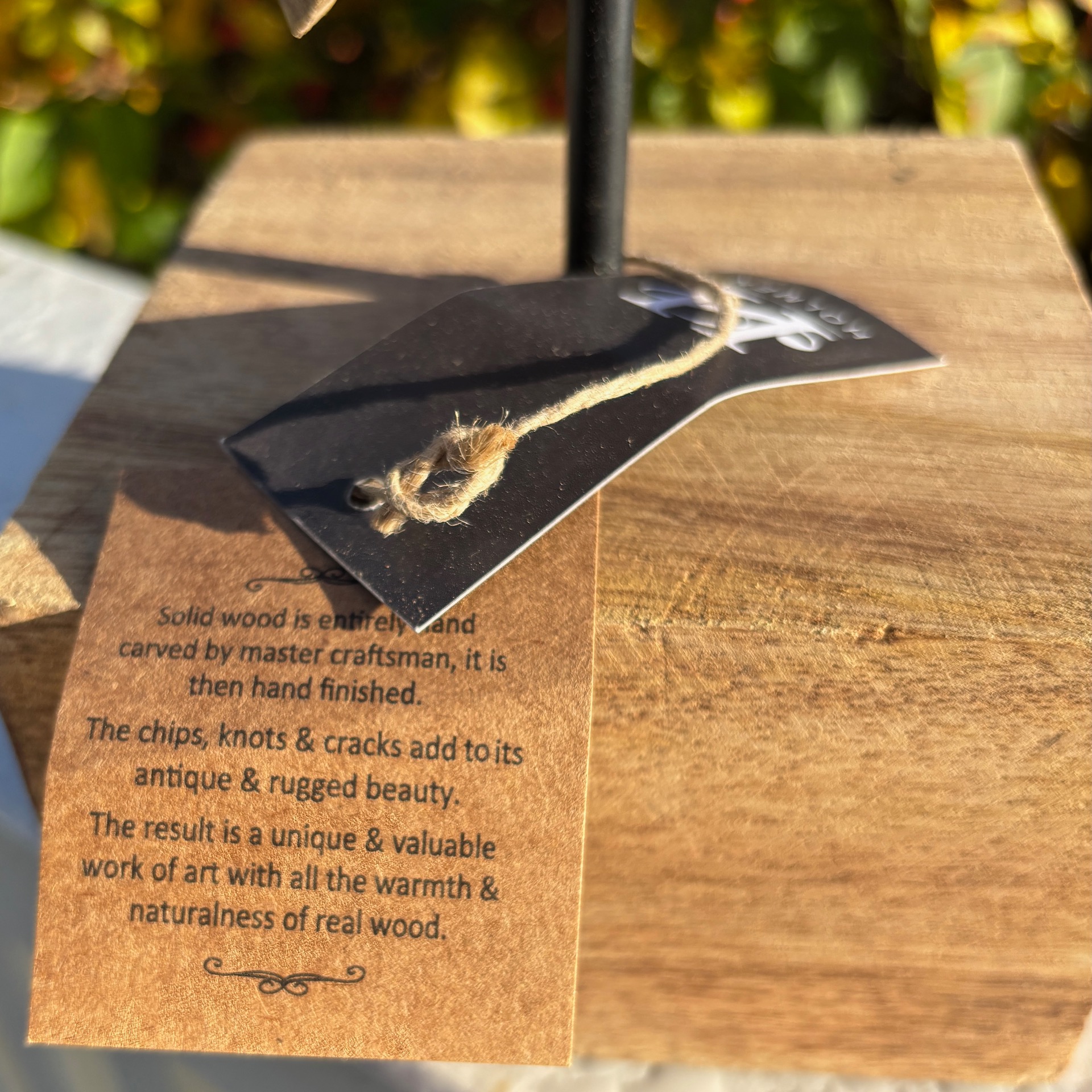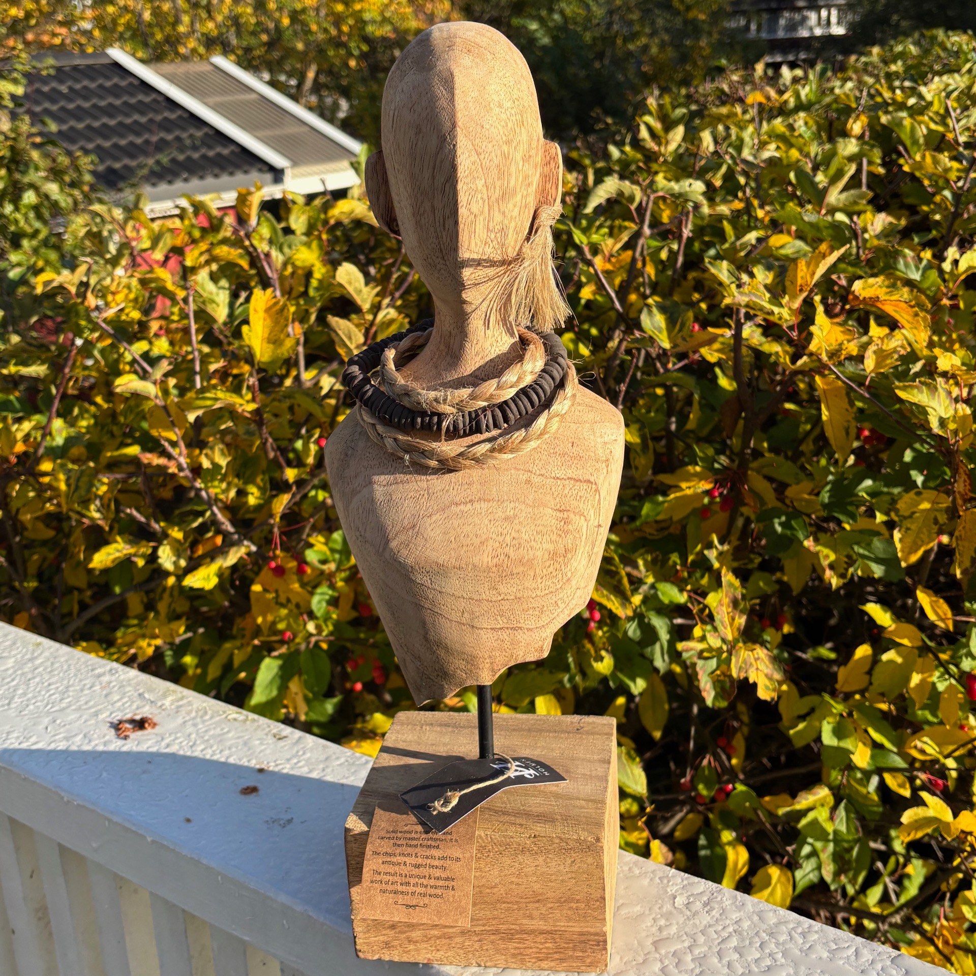 Ganske høy figur i naturtre med løse kjeder rundt halsen (kan ikke tas av) og det ene øret har hengende, naturfarget pynt. Figuren står på en firkantet treblokk. Produsent er Holmen.