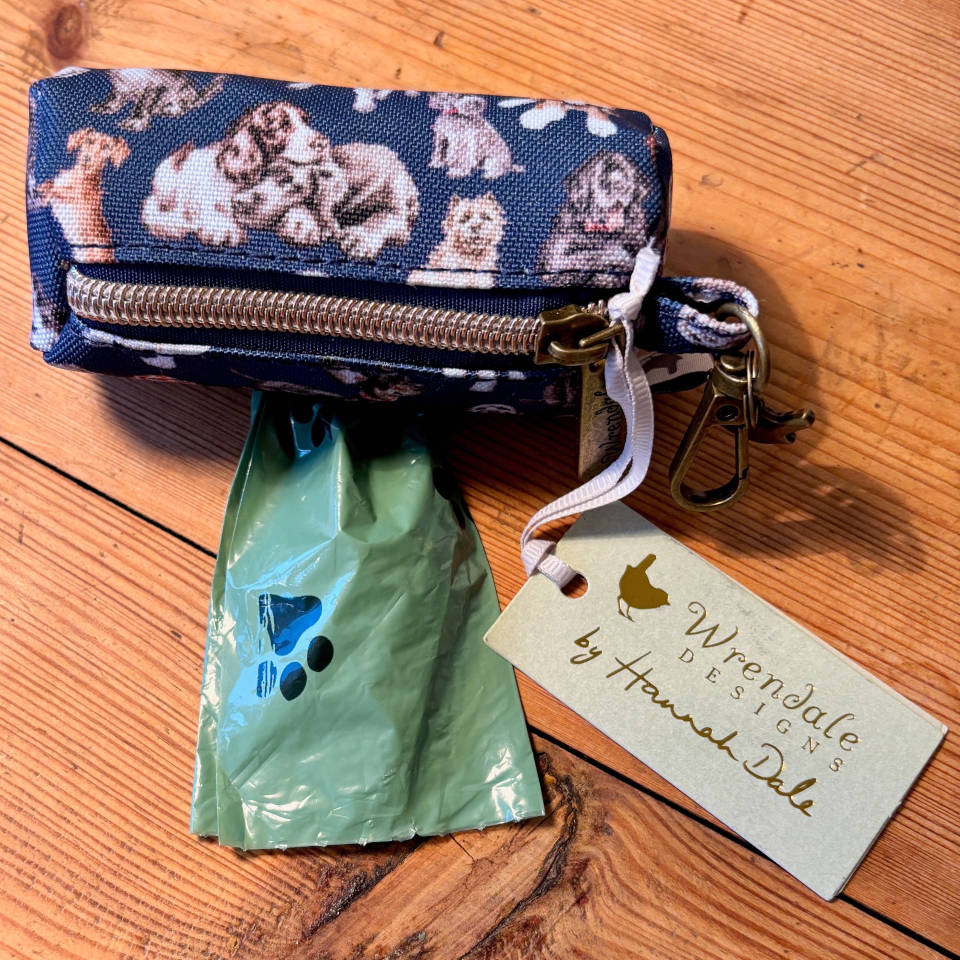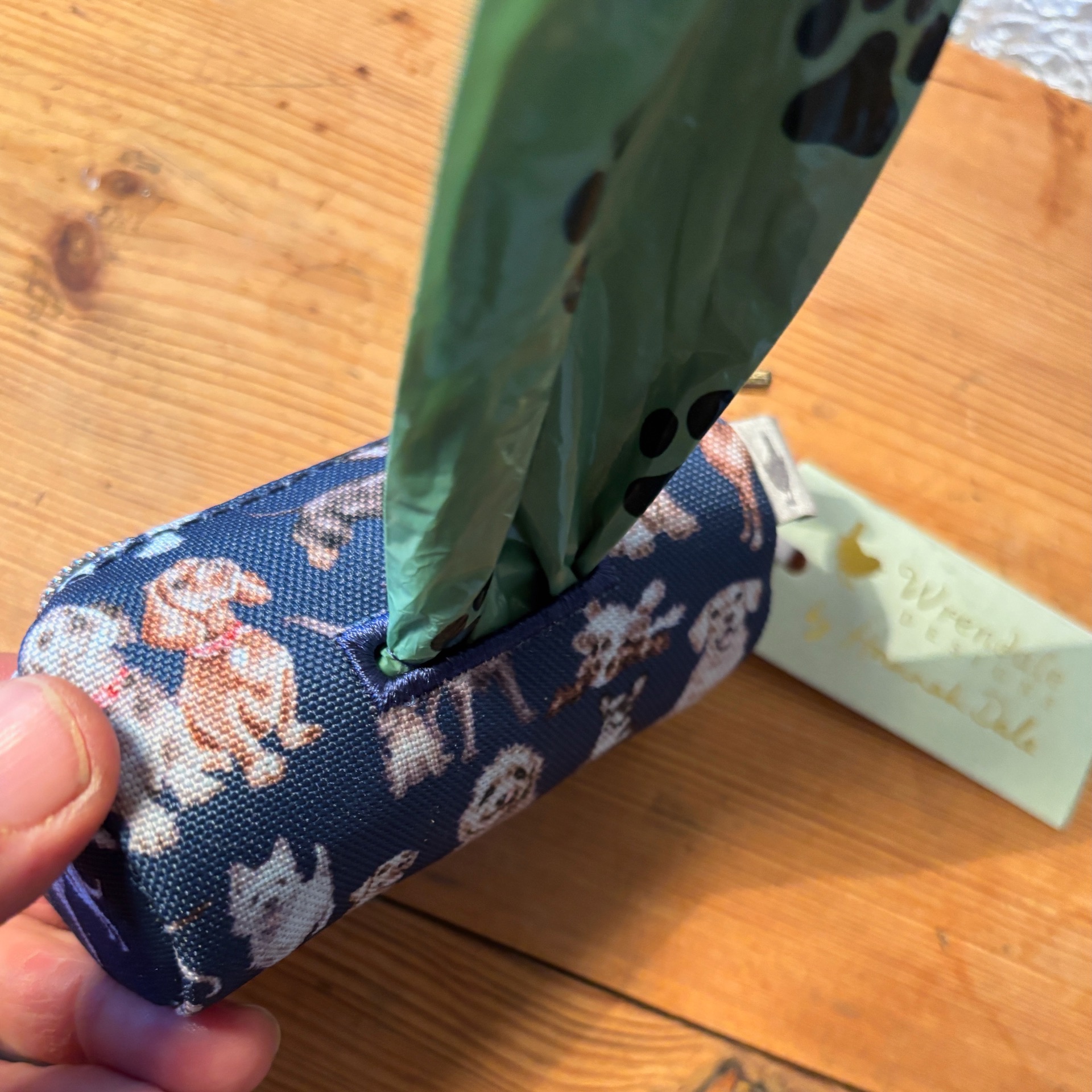 Stoffet er i 100% resirkulert polyester og innsiden helblå. Fronten har mørk blå bakgrunn med ulike hunder som motiv.
