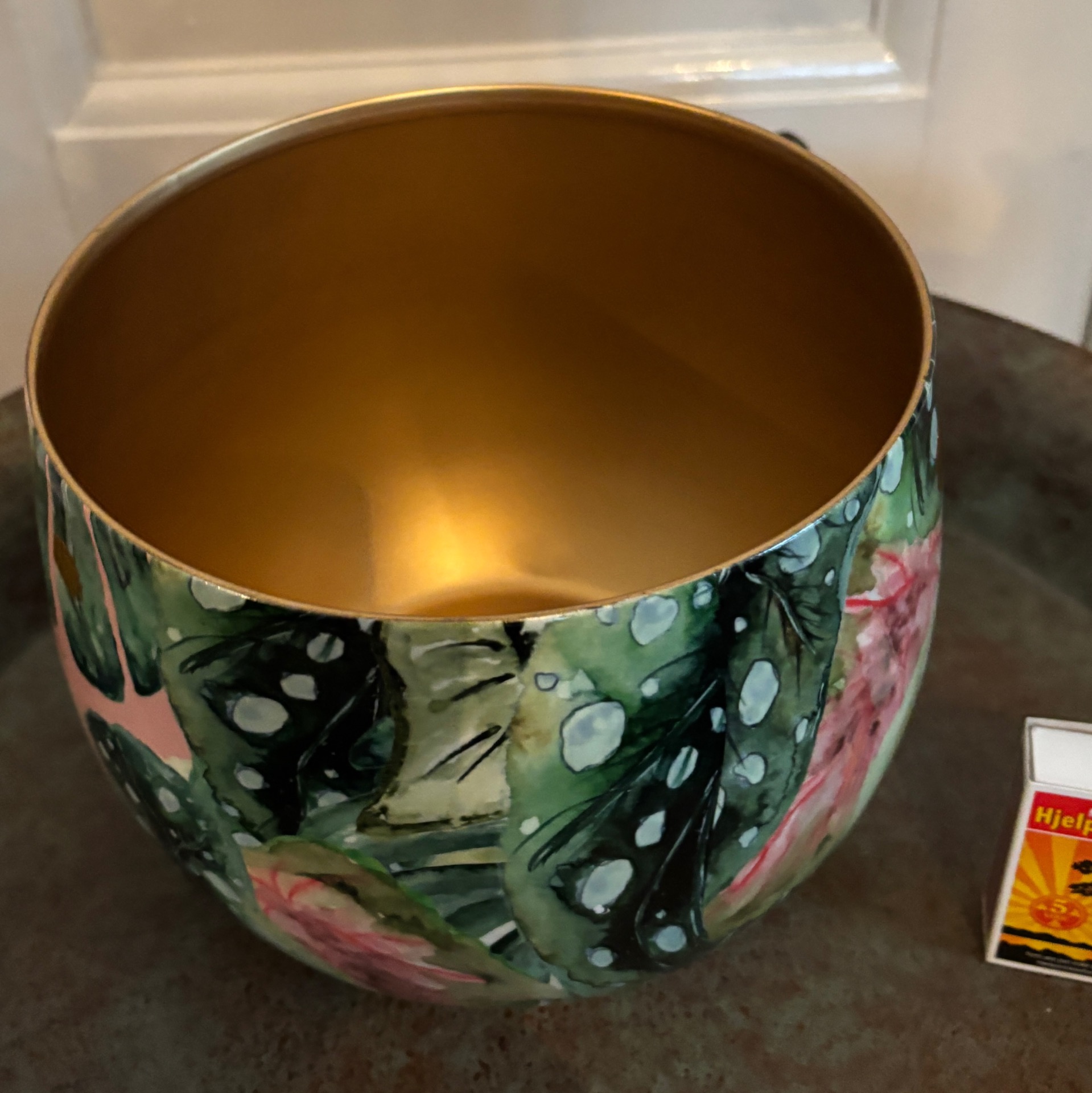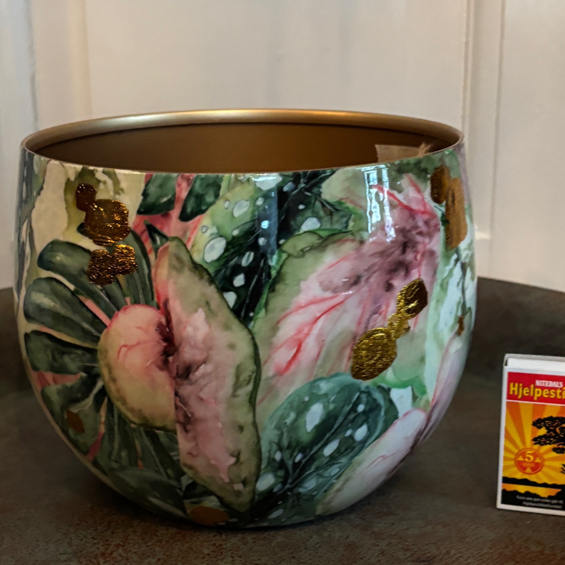 Potten er laget i helstøpt metall, gullfarget innvendig og et aldeles nydelig glasert motiv på utsiden med monstera-blader, litt gull, og ellers herlige, fine farger! Se bildene, så får du et inntrykk. Det er ikke mulig å ikke sukke henrykt når du ser denne (ihvertfall hvis du liker blomster og vakker utførelse!).