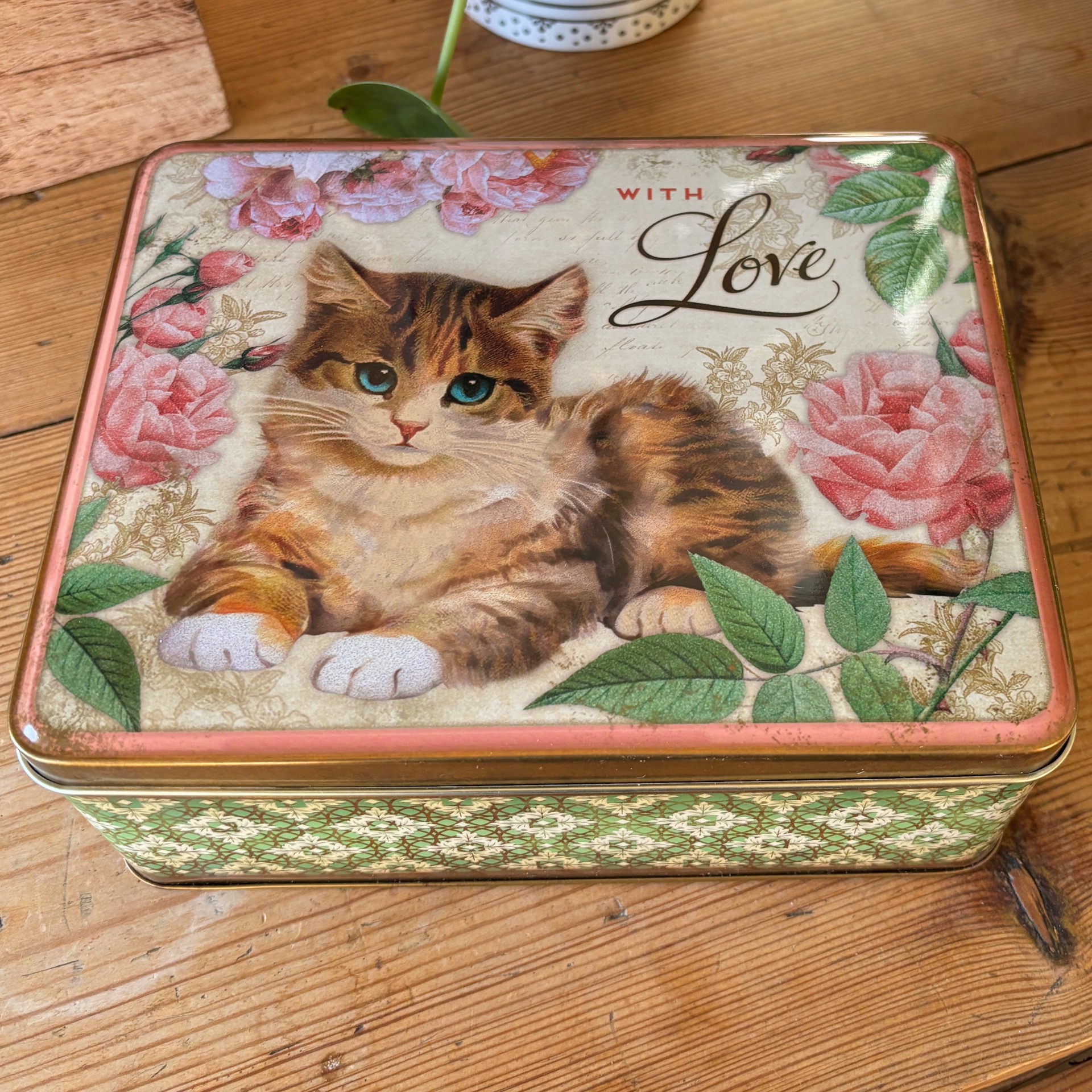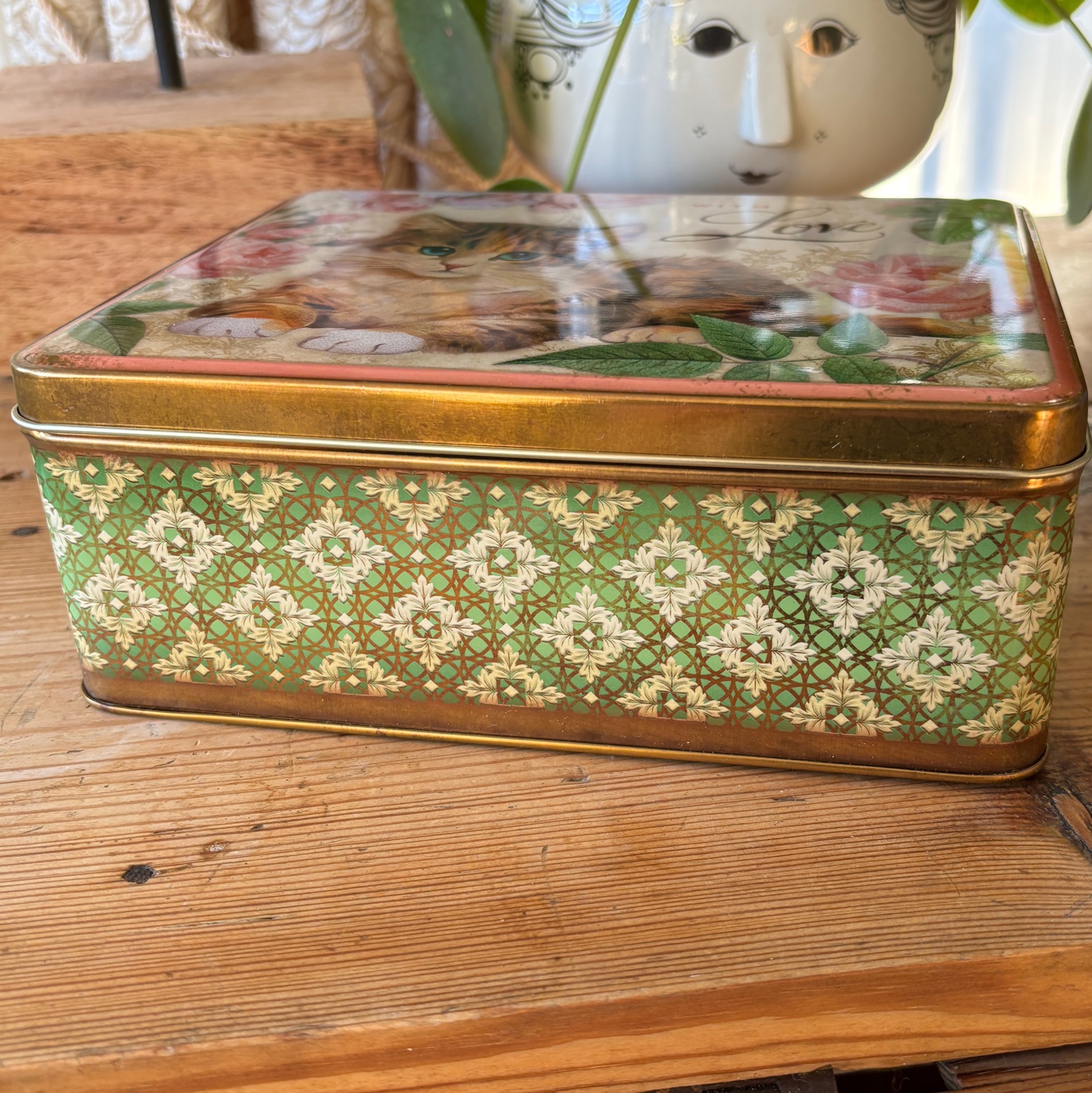 Nydelig, vakker illustrasjon av en svært så vakker kattepus. Denne boksen inngår i Elitetins Nostalgica-serie forøvrig. Boksen er 7 cm høy og bunn er 19,5 x 15,5 cm. Lokket sitter godt - det er ikke hengslet.