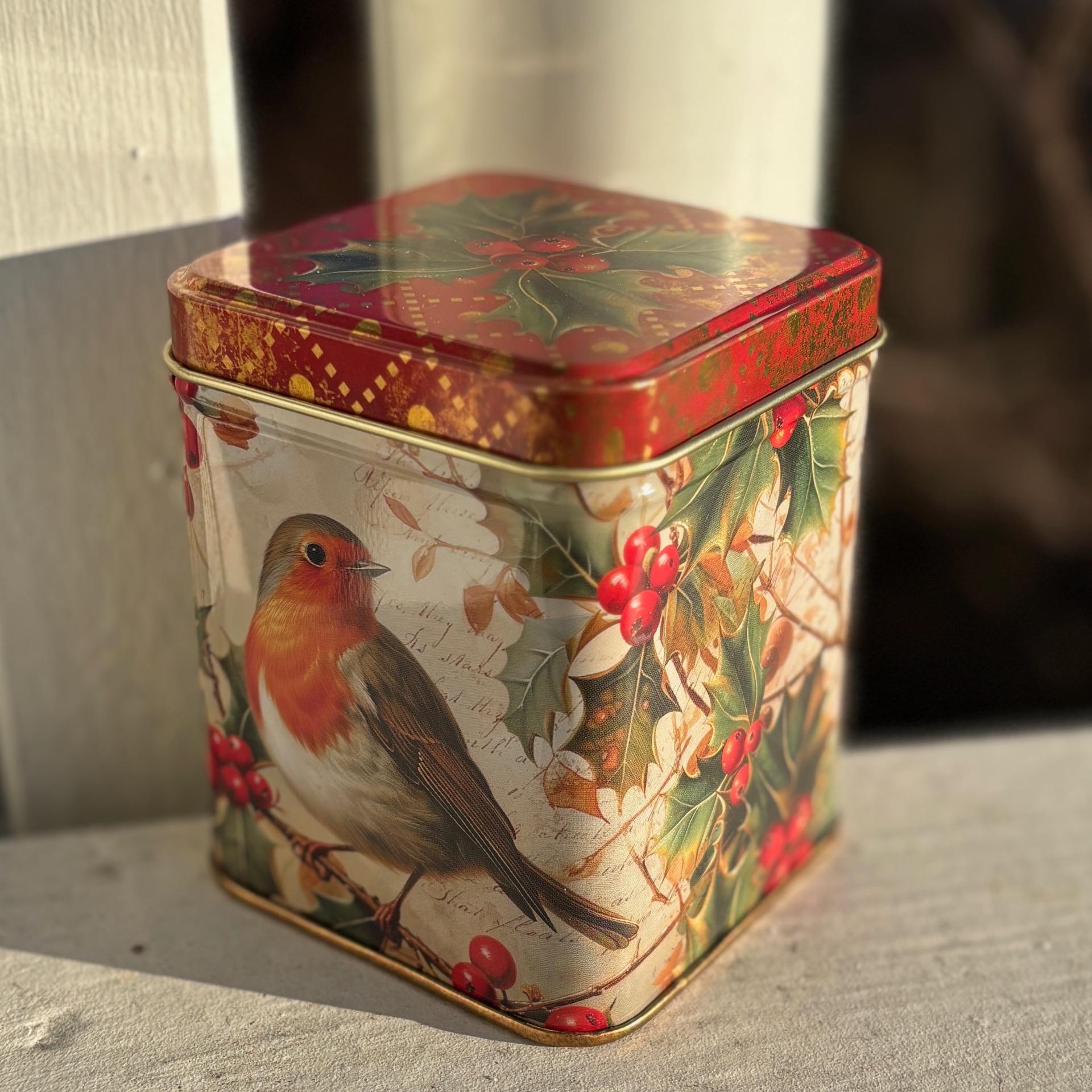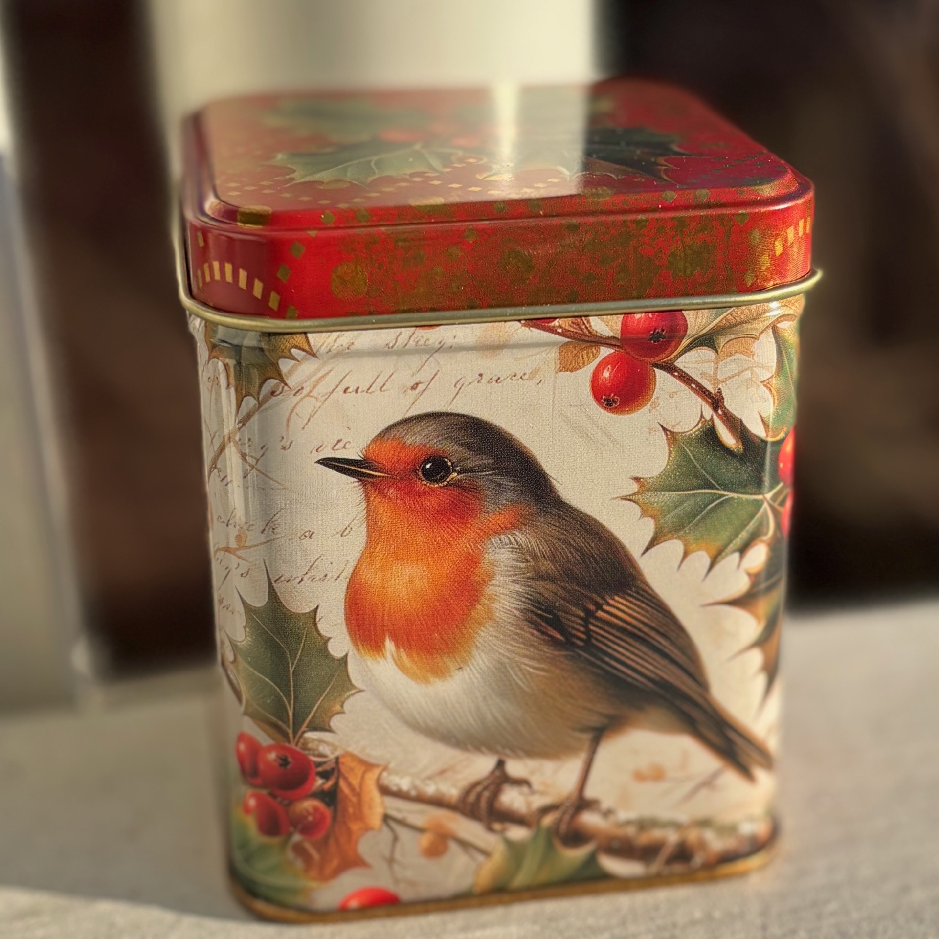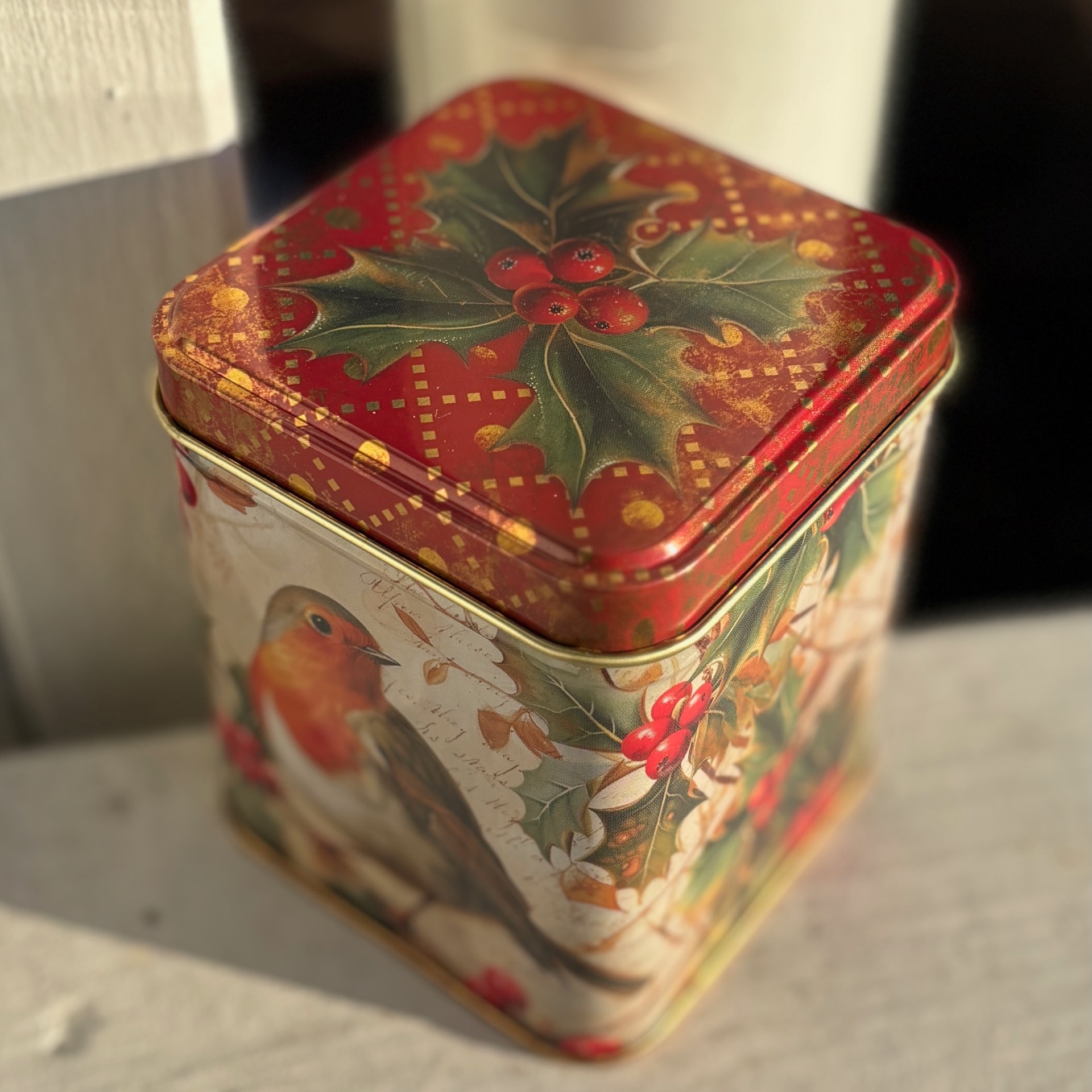 Vakker boks som prydes med rødstrupe og kristtorn - det oser "jul" av denne! Boksen er produsert av Elite Tin, som lager gode produkter.