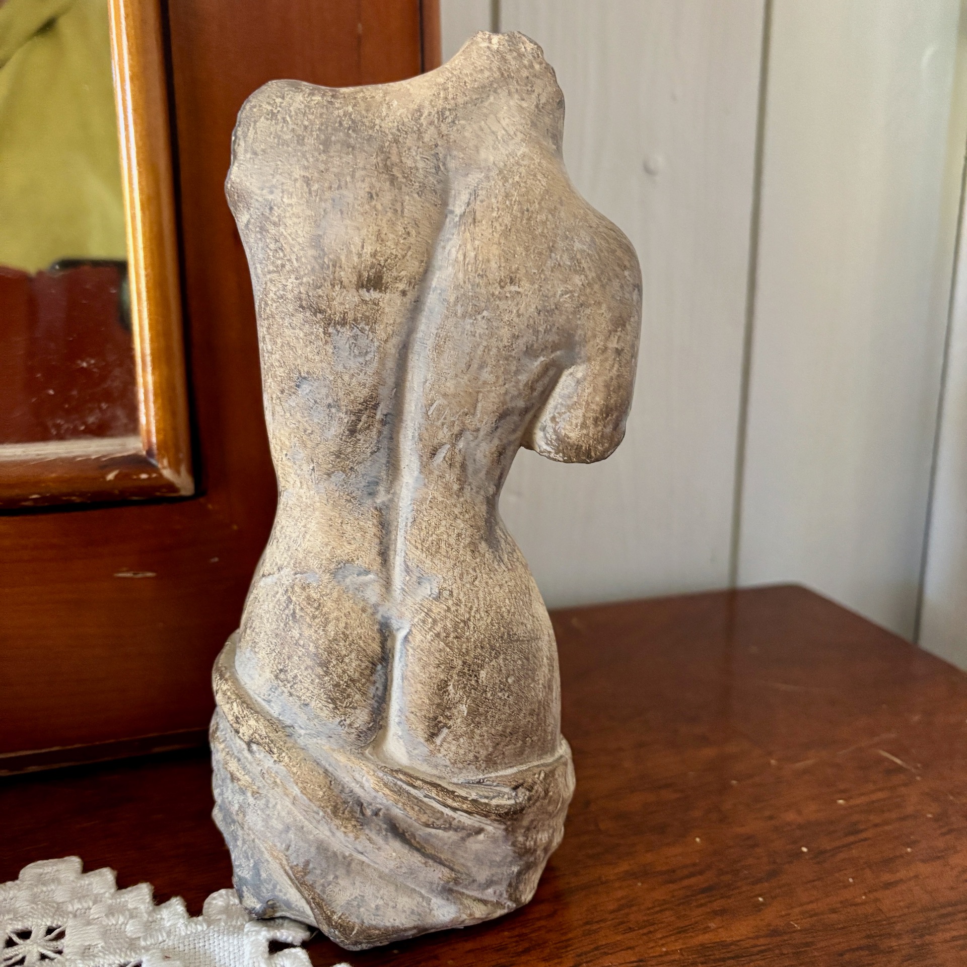 Relativt liten (høyde 19,2 cm) kvinnetorso i beige utgave. Bunn er e10x7,5 cm. Laget i sement-lignende materiale. Fint interiørelement :-)