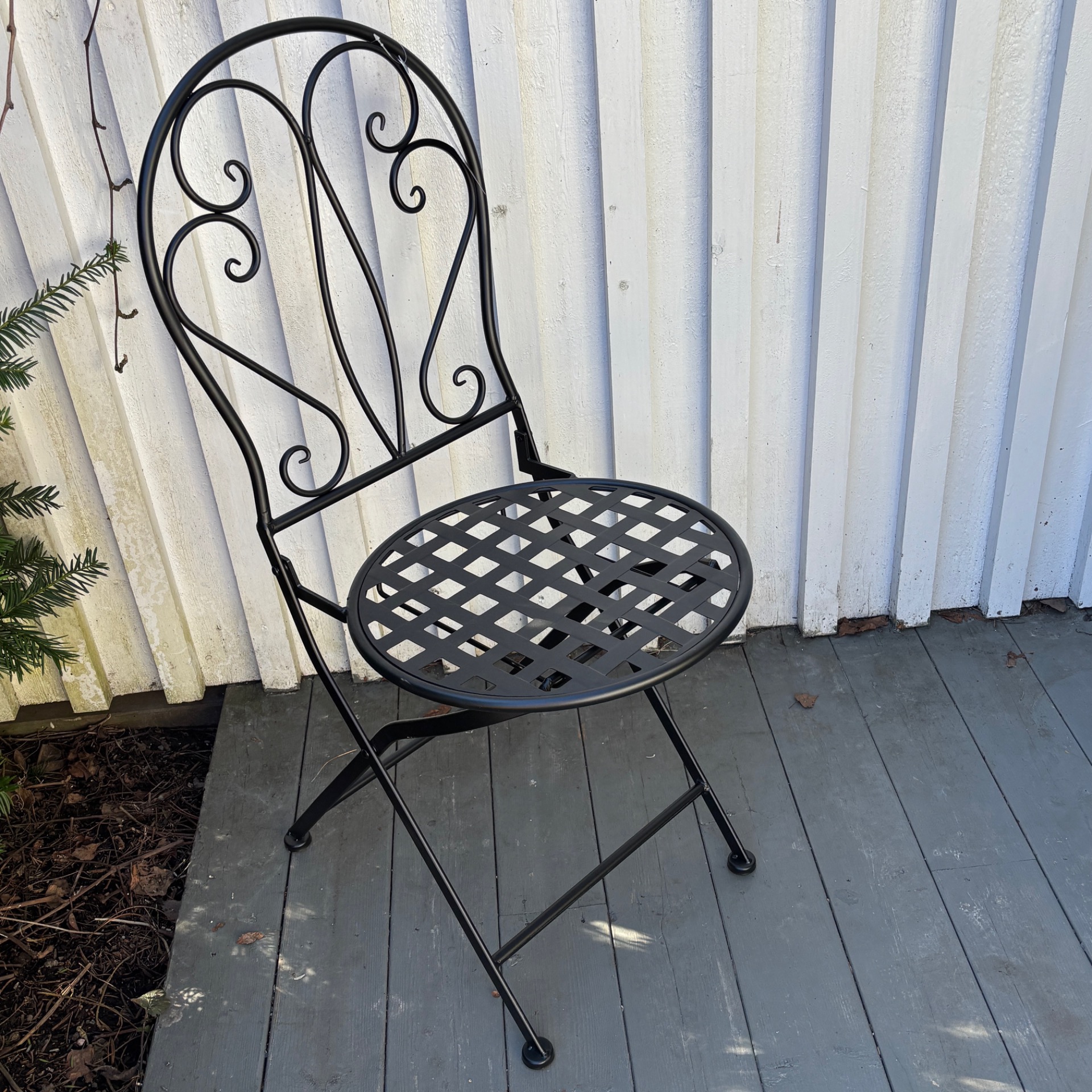 Sorte metallstoler i kvalitets-utførelse. De er sammenleggbare og med en rund pute på setet, har du en god stol. Nettbutikken har to ulike, runde mosaikkbord - hvor stolene passer perfekt. :-)