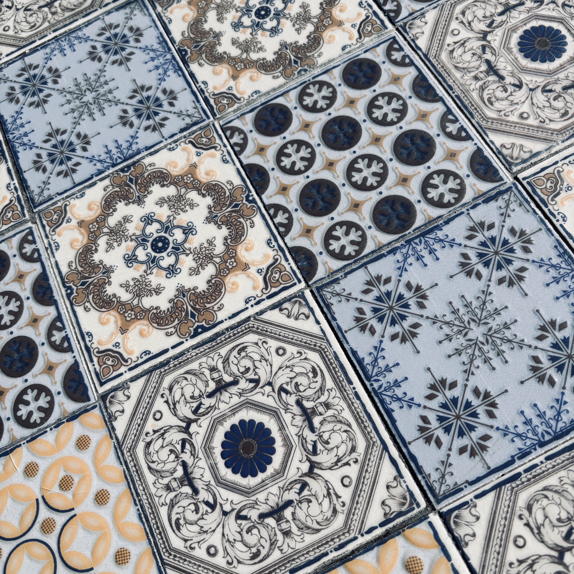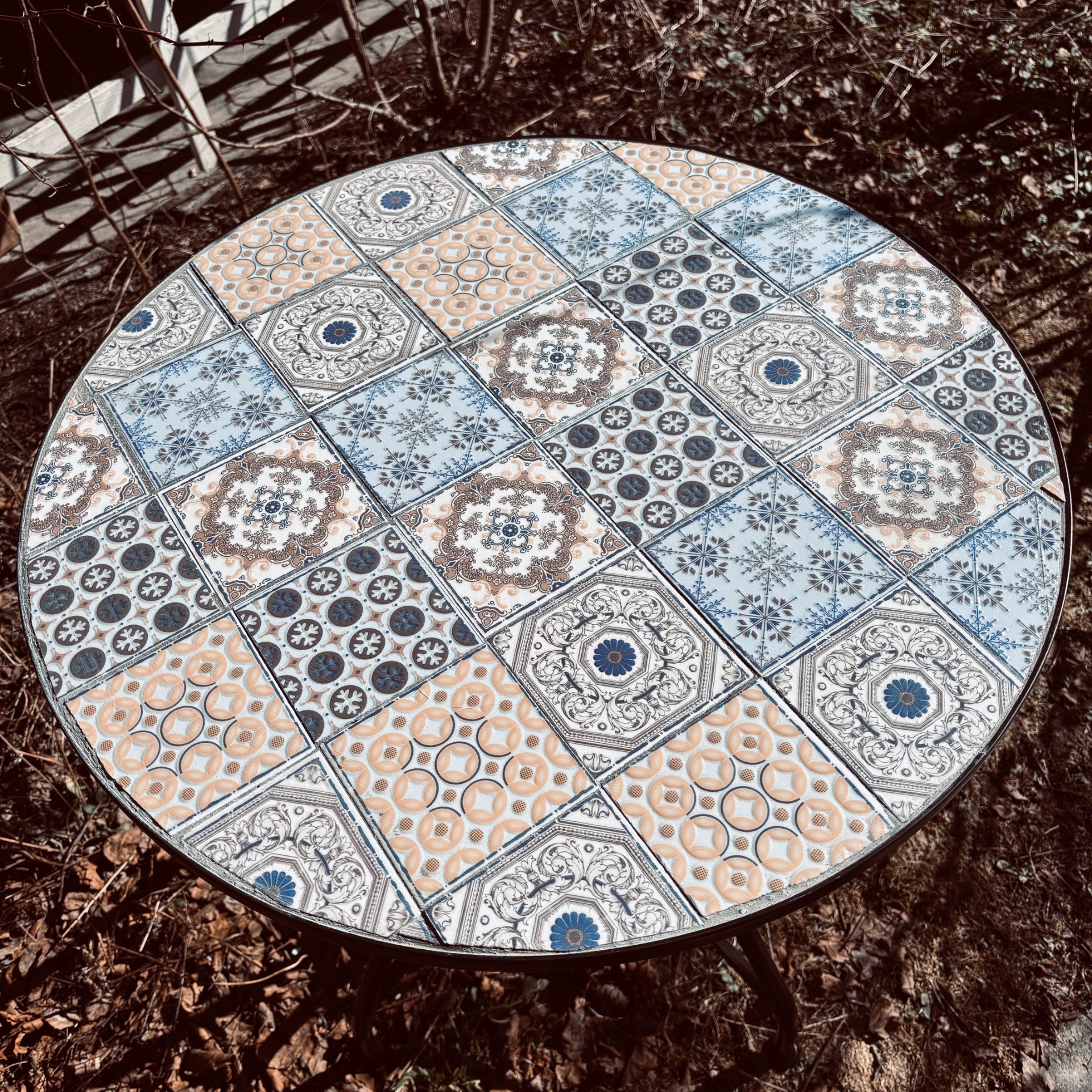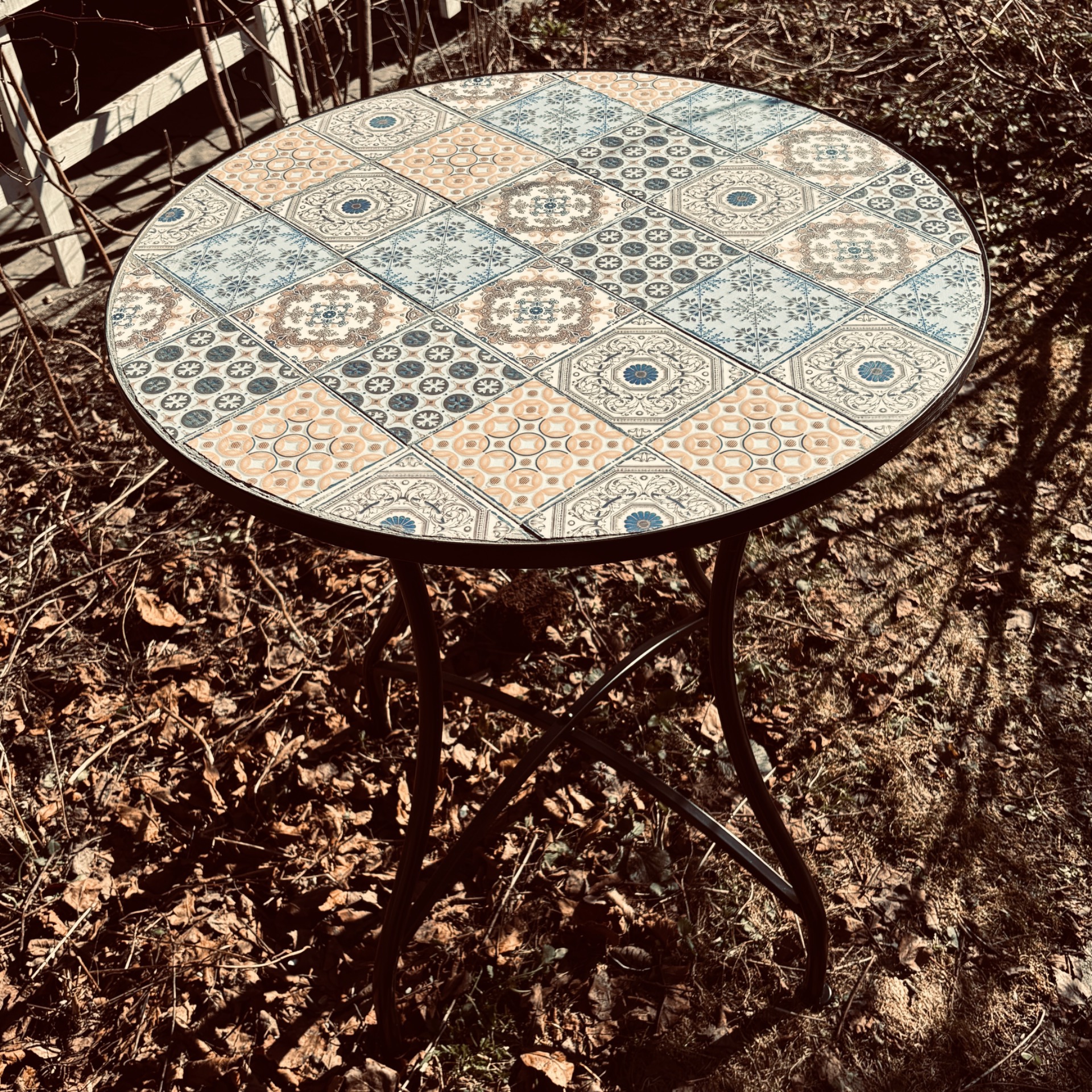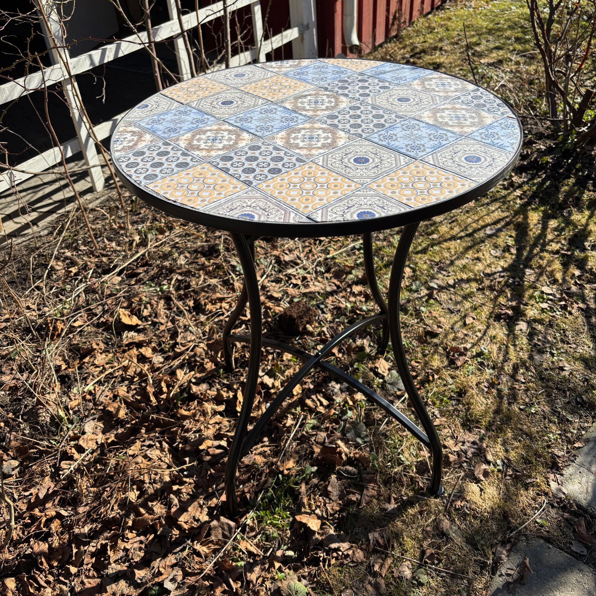 Rundt cafe-bord med sorte ben i metall. Håndlaget topp med lyse mosaikkfliser i avstemte farger.