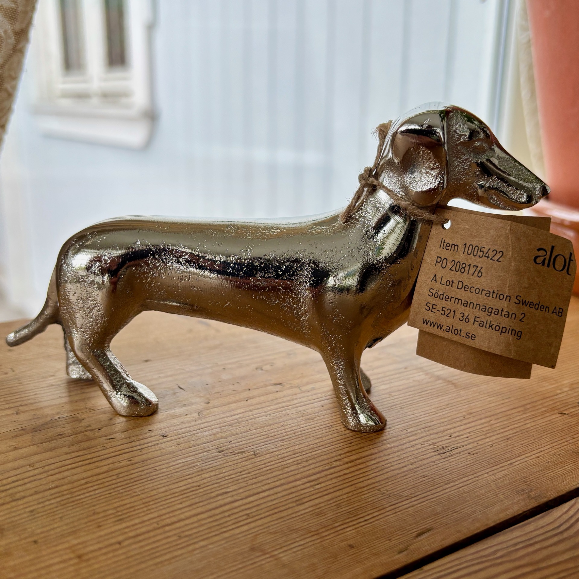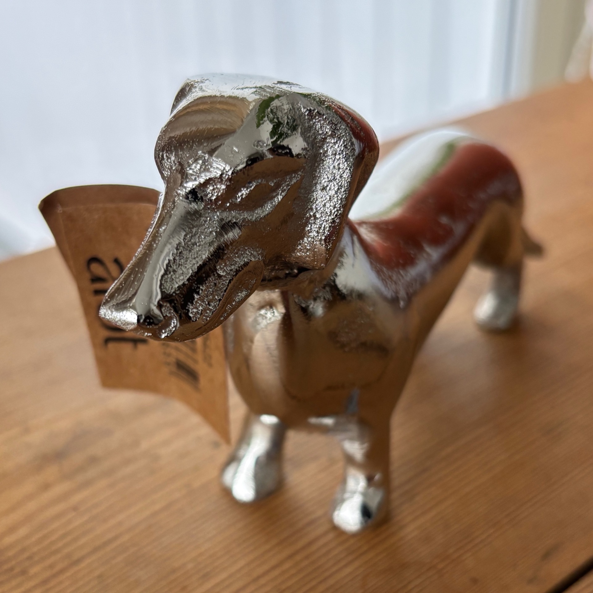 Sølvfarget dachs i metall - flott dekor-element. Den er 17 cm lang, høyde er 9 cm og bredde 4 cm.