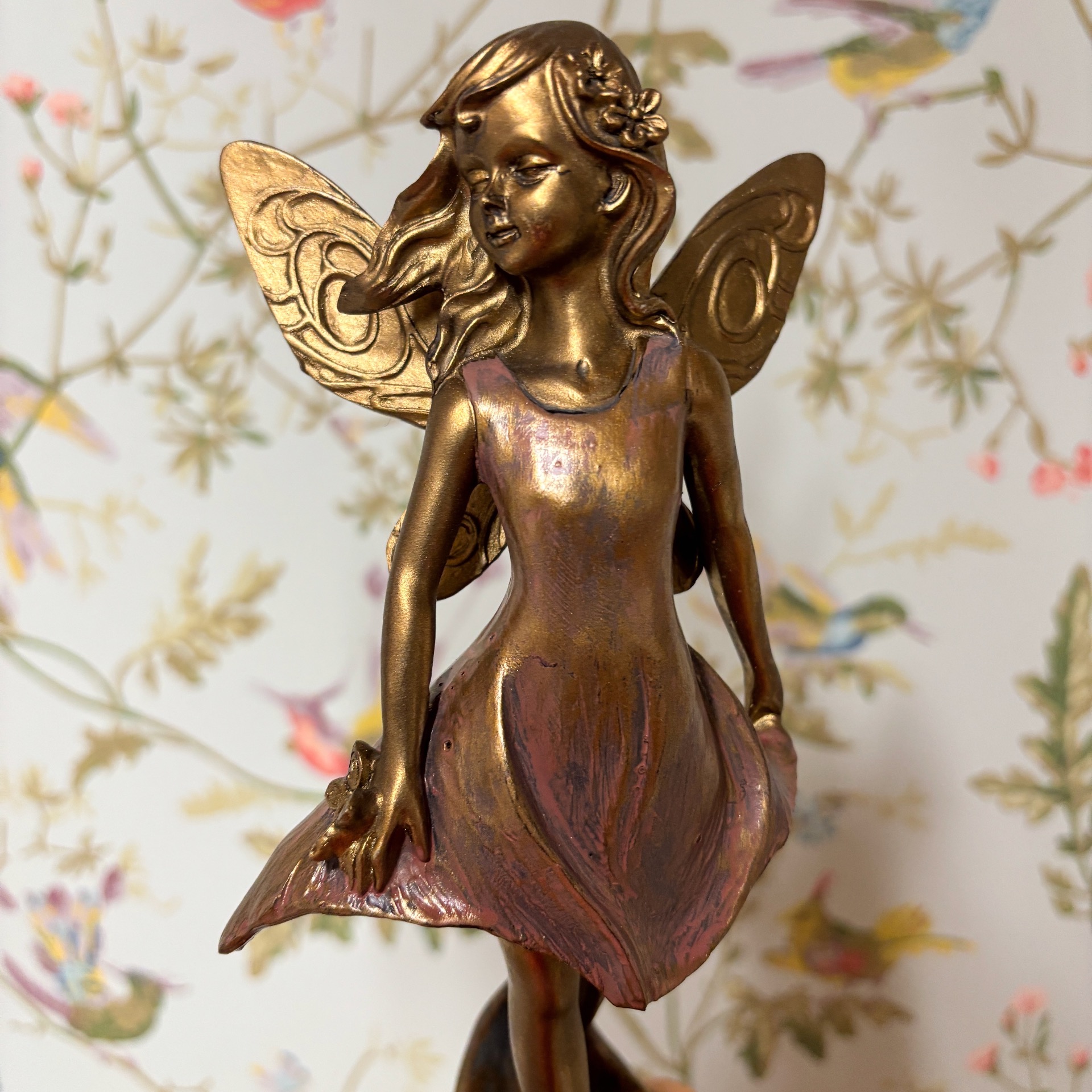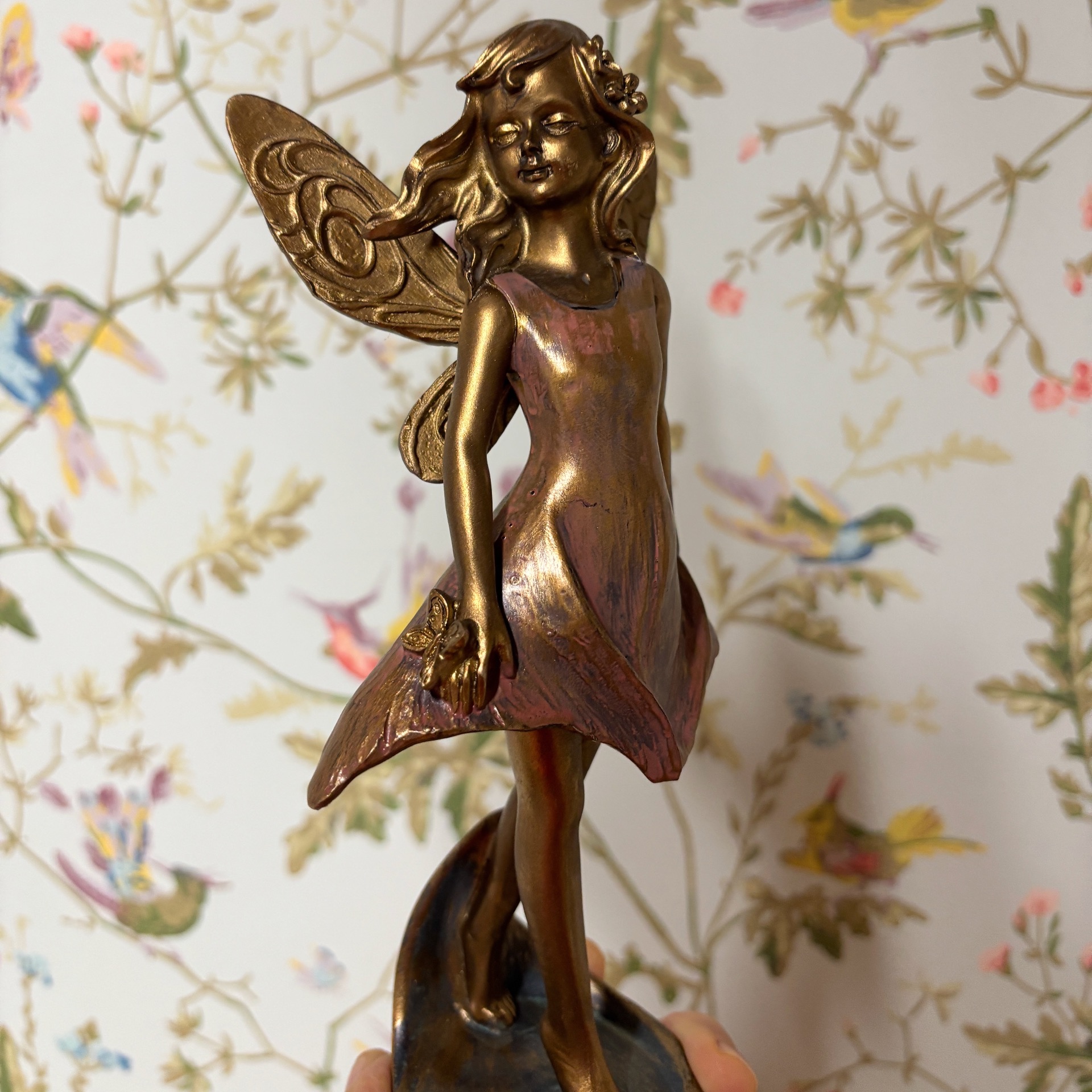 Pikefiguren viser en fe/alv/engel som ser ut som hun er midt i dansen. Fine detaljer og hun gjør seg absolutt ikke bort :-) Kjolen har sart, sart rosa farge og sokkelen hun står på, har et lite preg av grønt i seg.