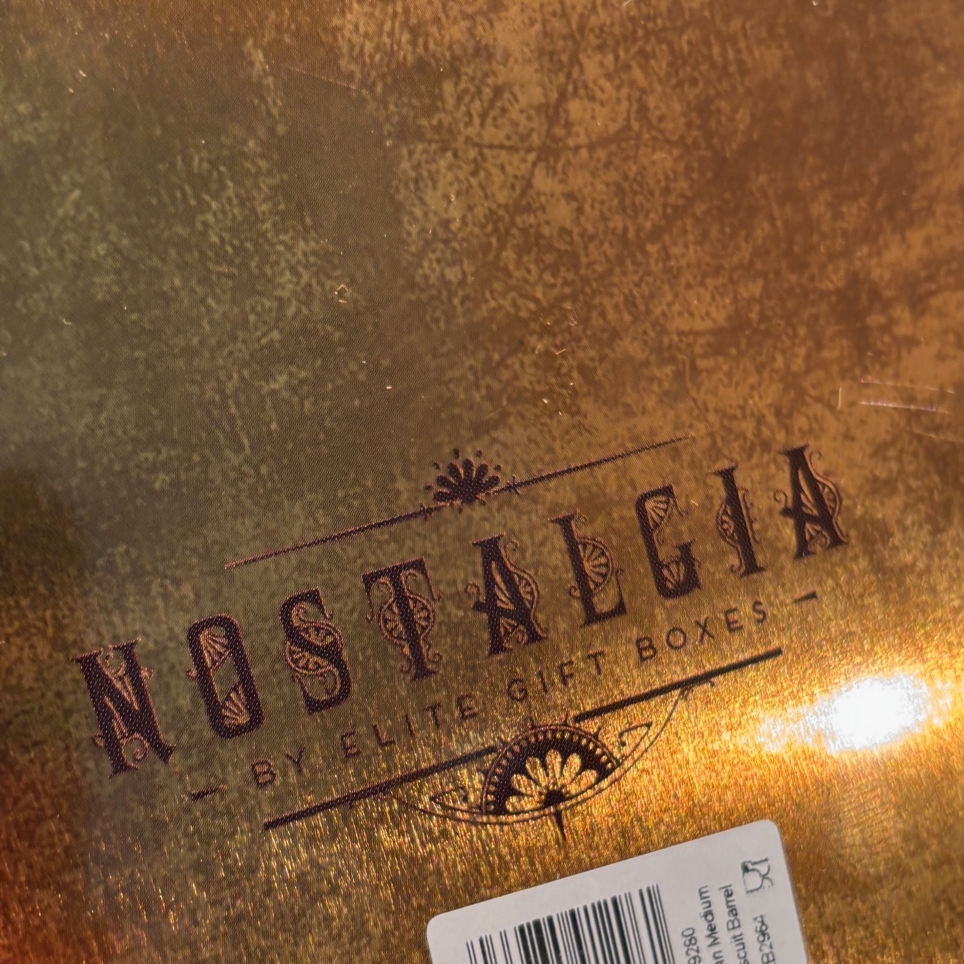 Boksen er 17,3 cm høy og diameter er 15 cm. Laget i metall av Elitetins, UK. Serien heter Nostalgica.