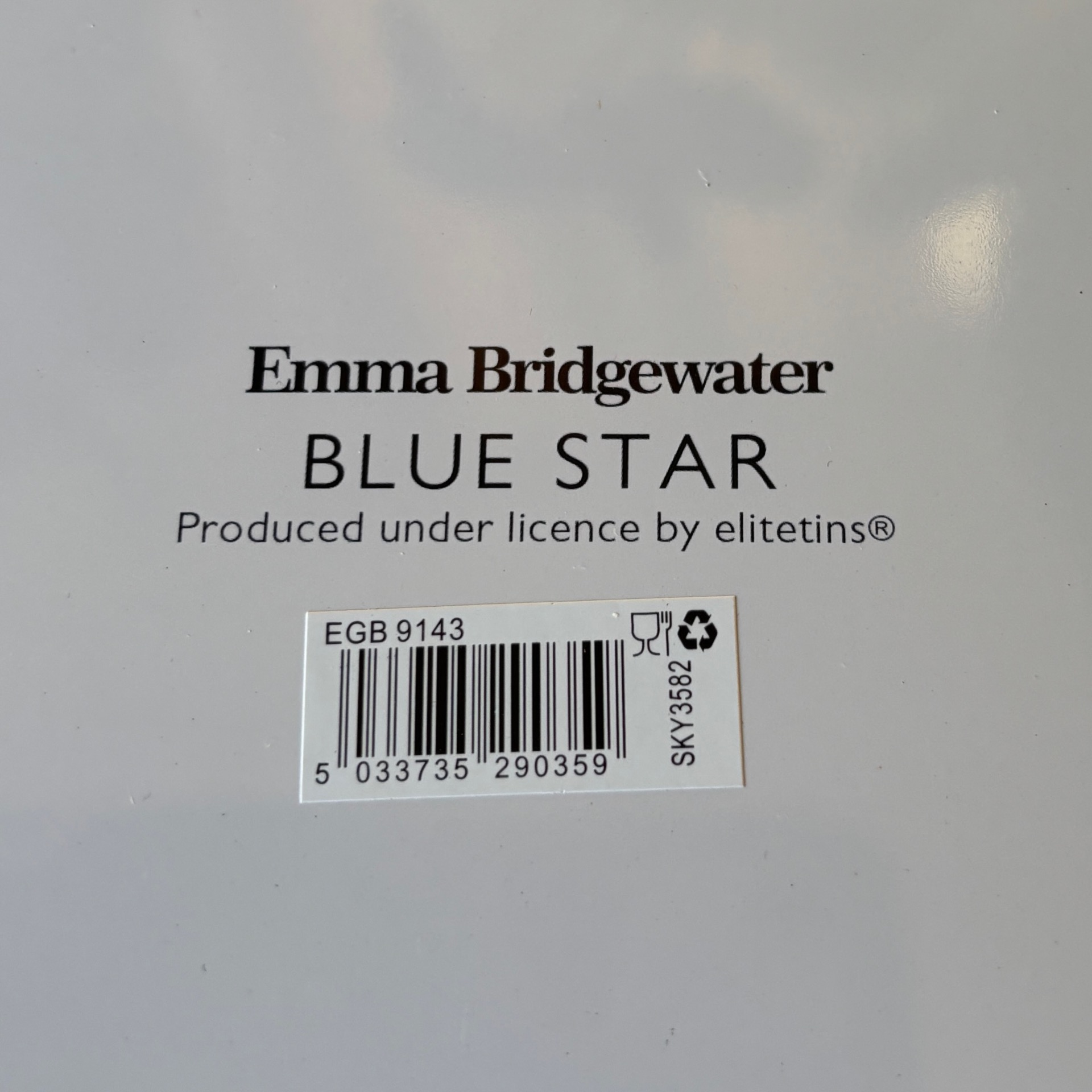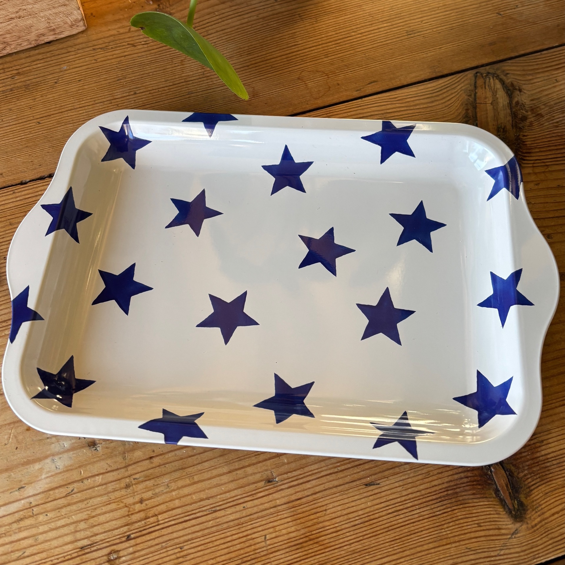 Metall-fat i hvitt med blå stjerner på - designet av Emma Bridgewater - produsert av Elitetin.