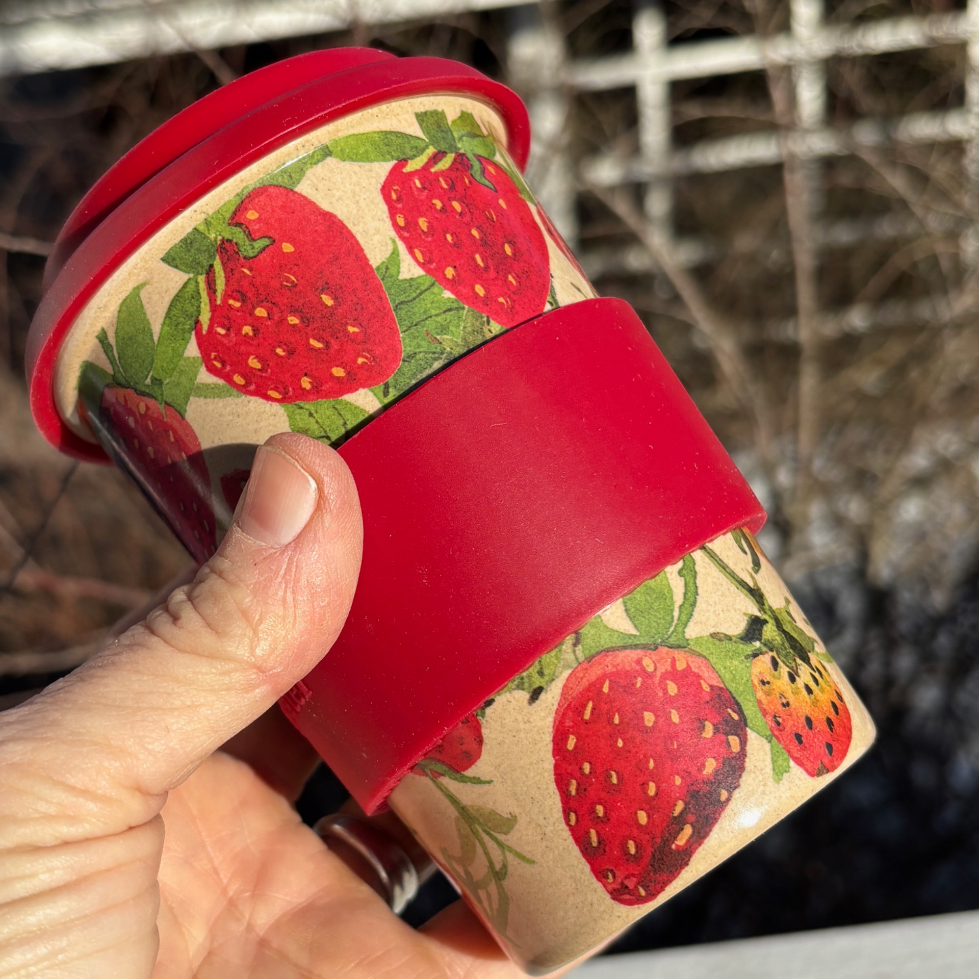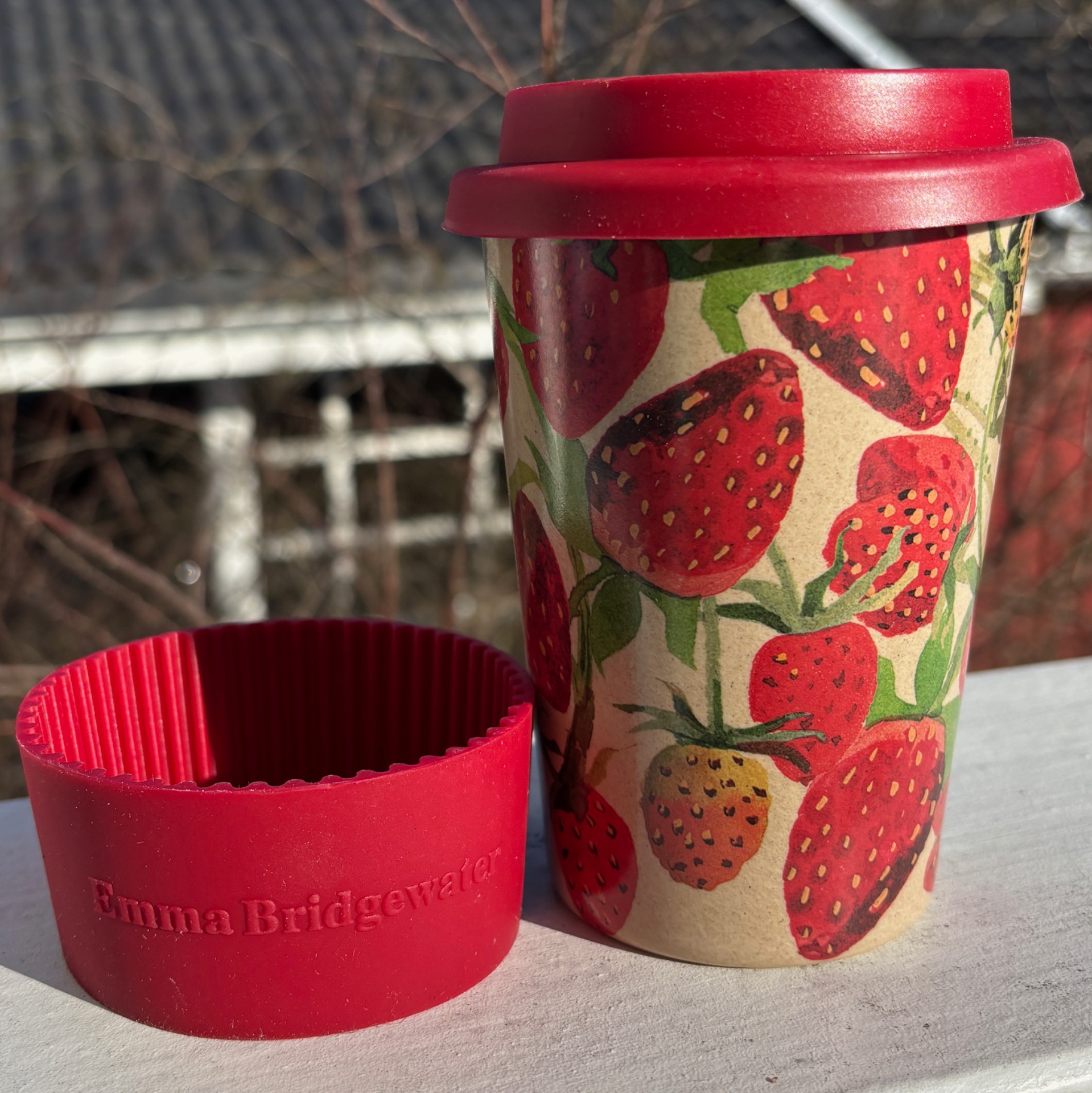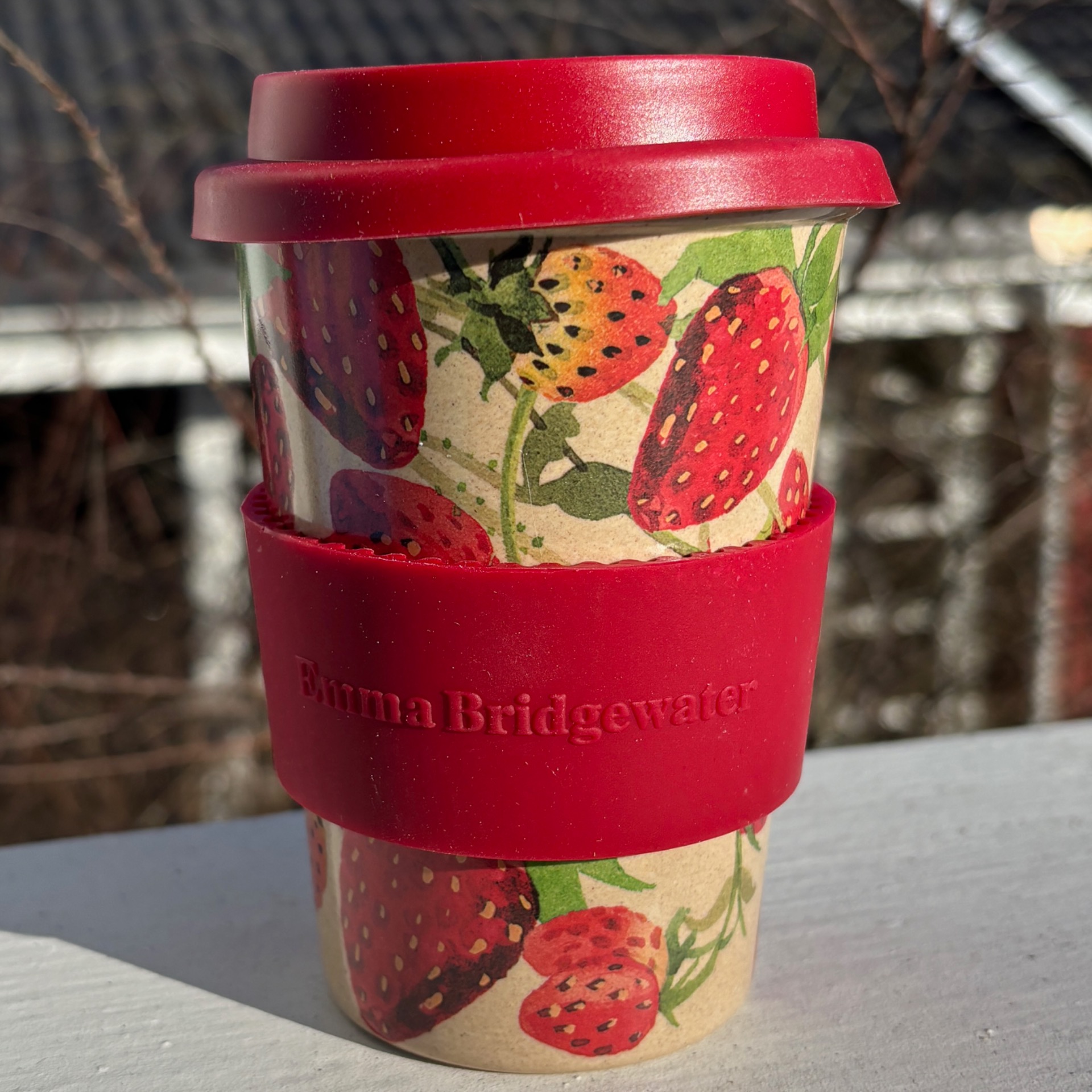 Sommerlig termokrus i knallrød utgave - med flotte jordbær som motiv, og gripekant og lokk i skikkelig rødfarge fra Emma Bridgewater. Koppen rommer 4 dl. Det leveres i papp-eske med vindu :-)
