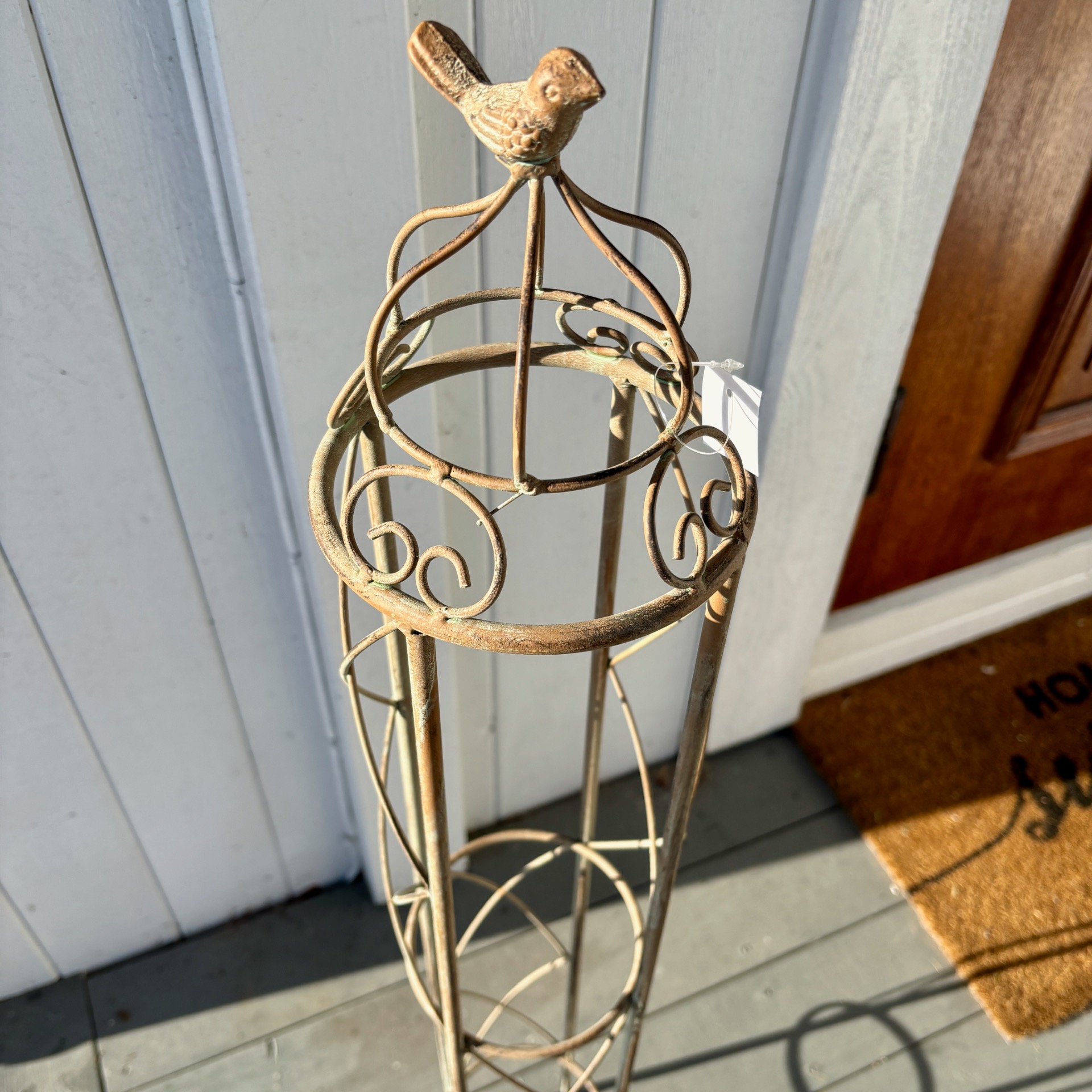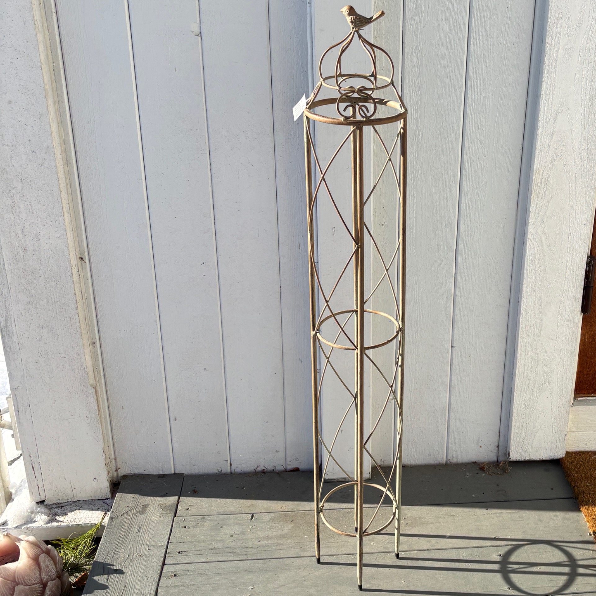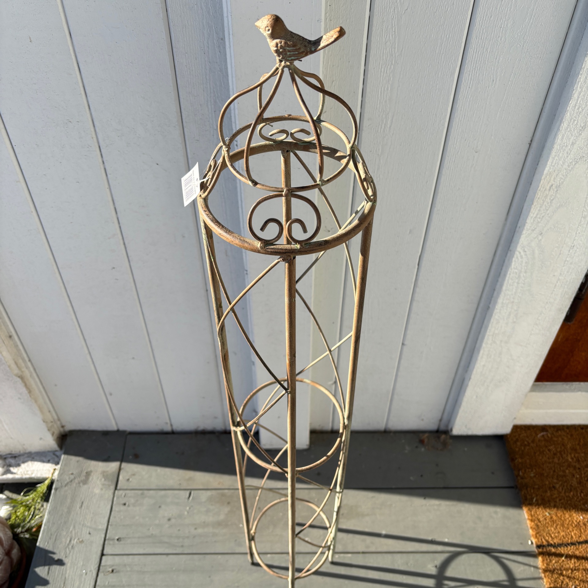 Rund espalier i fransk landstil i fargen brun&antikk grønn. Snirkler og flettefelt på to av sidene sidene og åpne felt på de to andre sidene, fugl på toppen - alt er som det skal være for å si at denne har klare hint til fransk landstil :-)