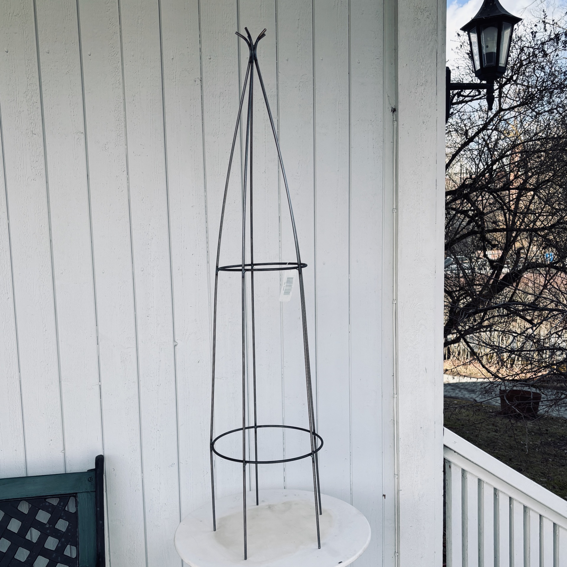 Rund obelisk-formet plantestøtte/espalier i kraftig metall. Den er hele 120 cm høy og diameter er 29 cm. (Ta mål, så ser du hvor høyt det er). En god støtte til store planter i blomsterbedet!