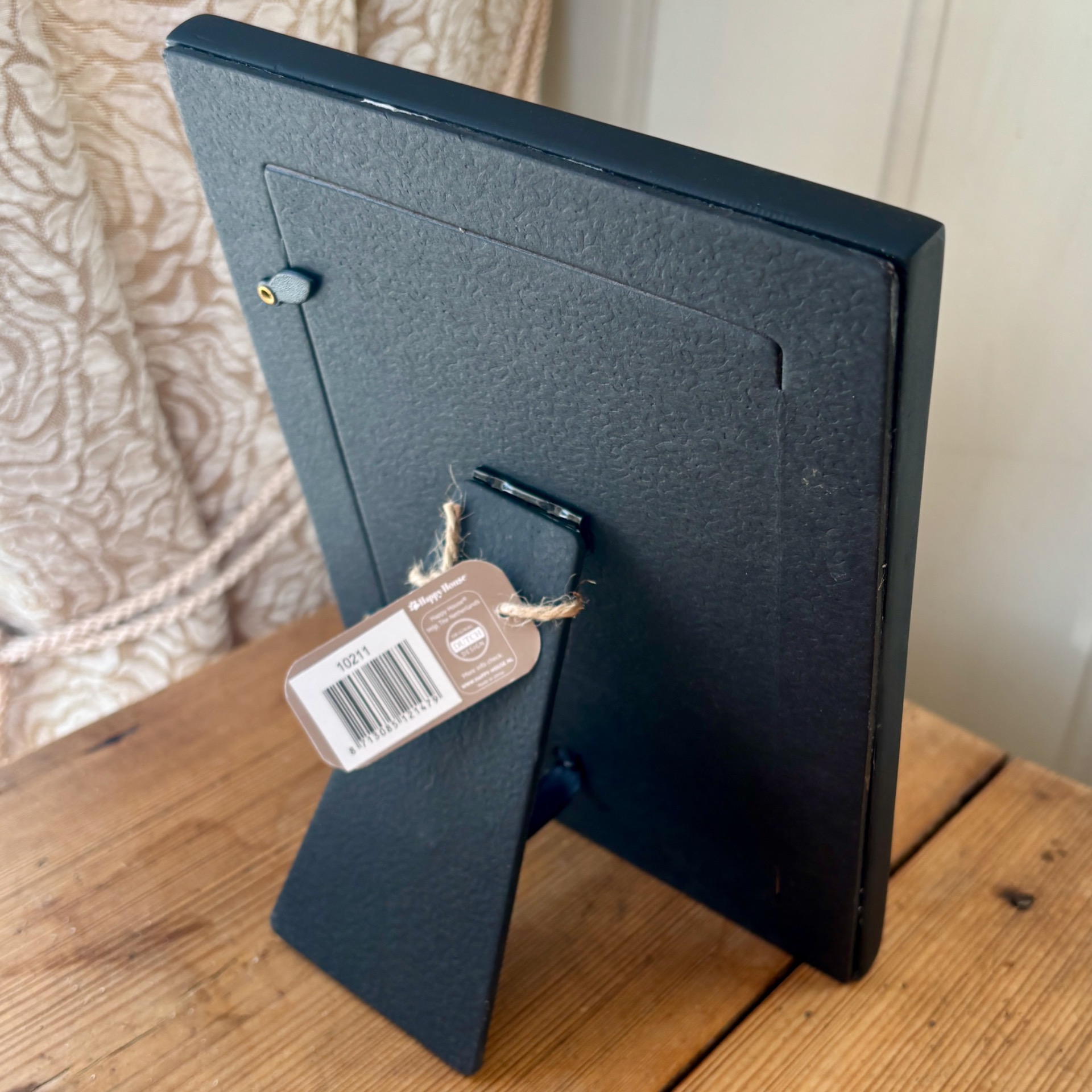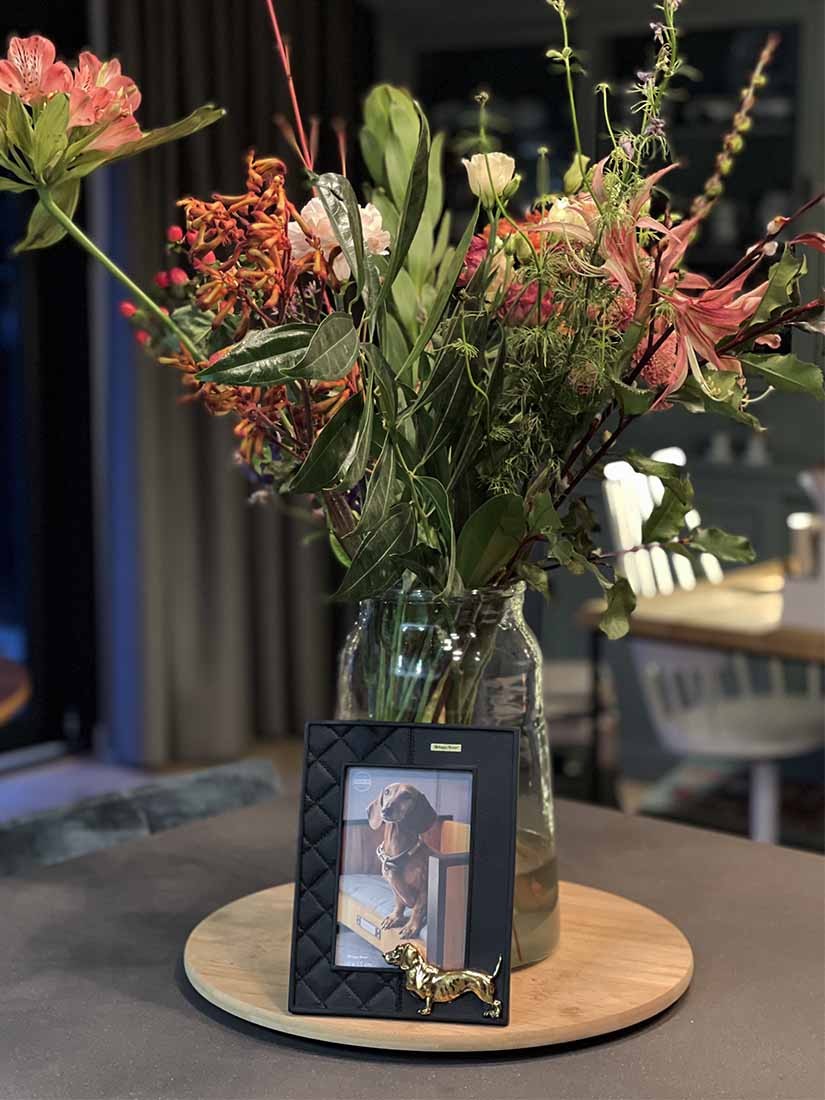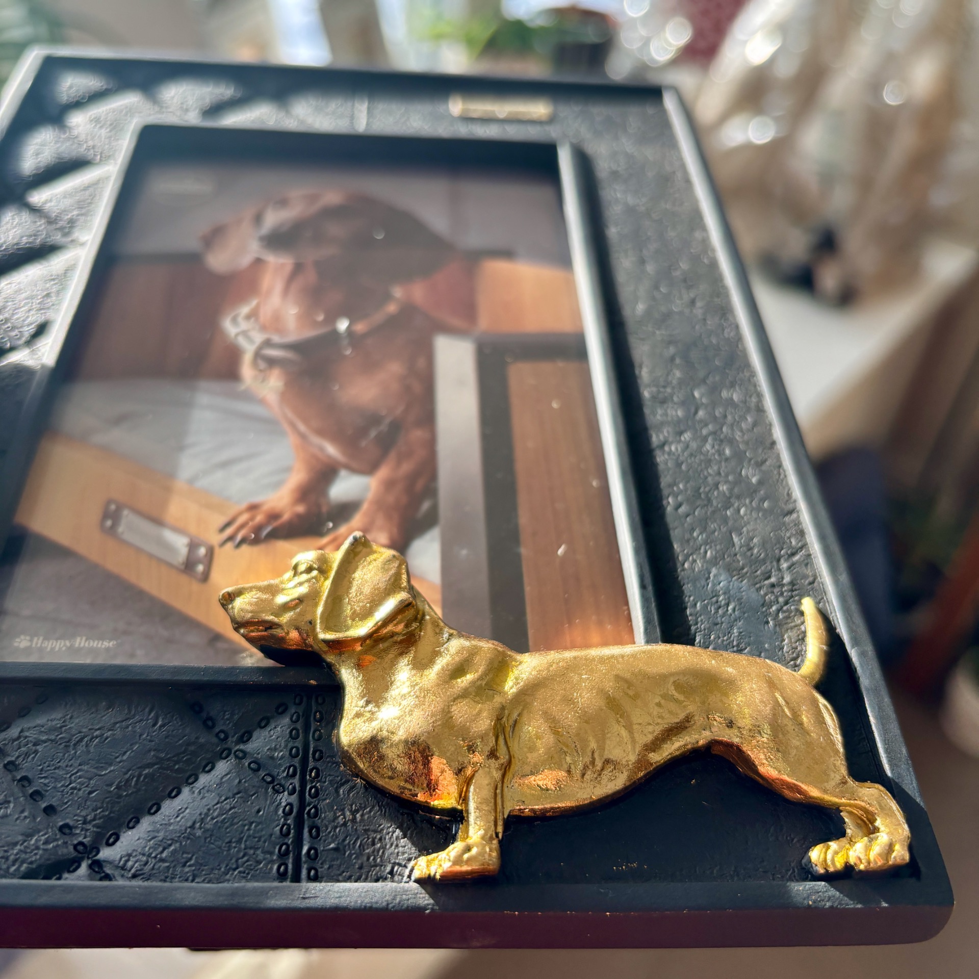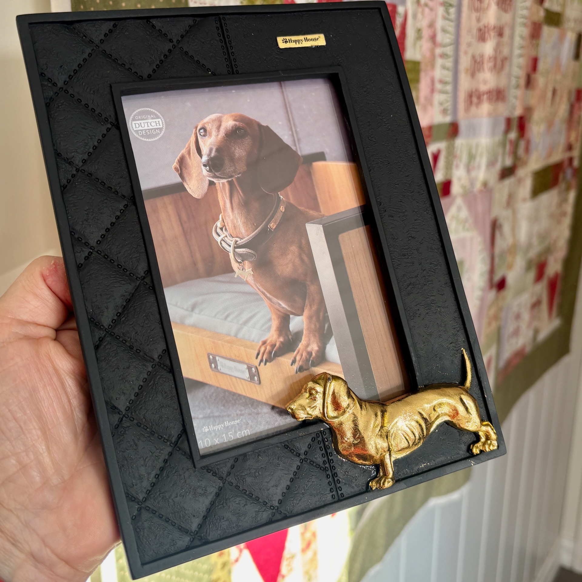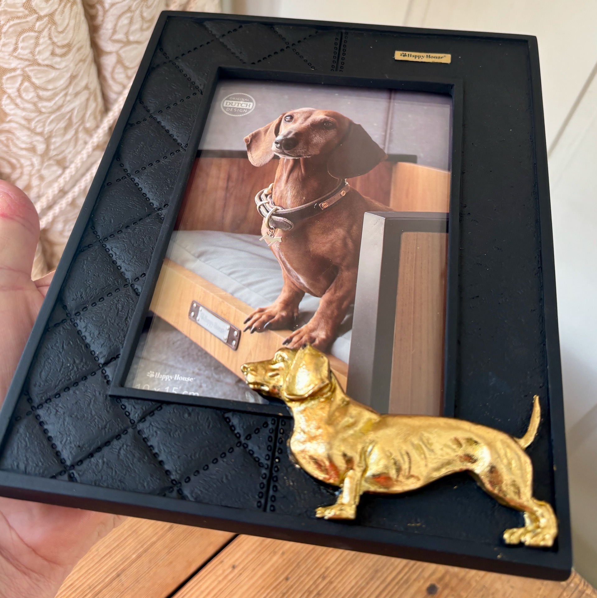 Forseggjort, sort bilderamme med gull-farget dachs nederst til høyre. Selve rammen er 20,7x16 cm. Selve bildet du kan sette inn passer i str 10x15 cm.