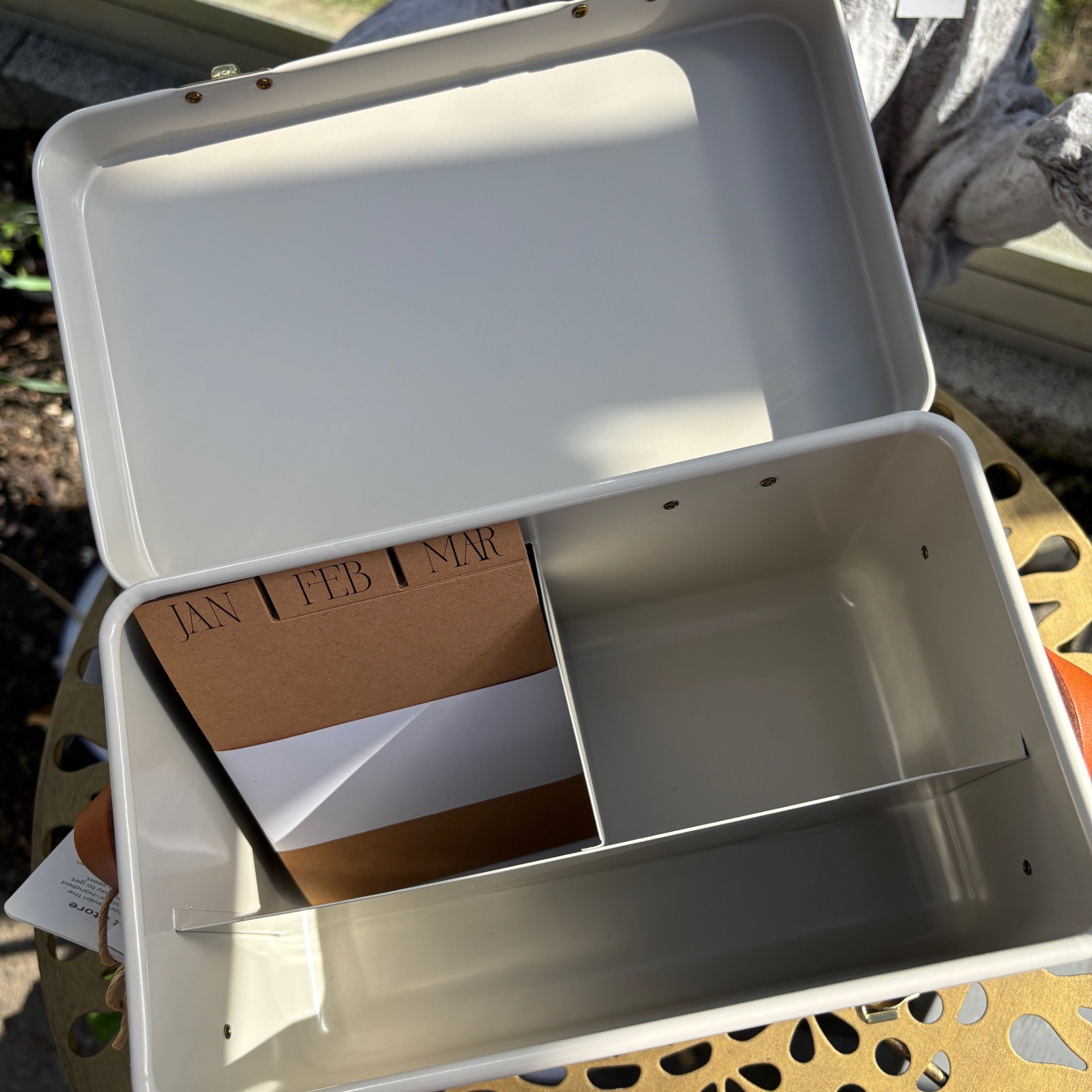 Boksen er laget under en unik støpeprosess som gir et feilfritt frinish helt uten sømmer. To sterke metallspenner holder det hengslede lokket sikkert lukket. Utsiden er av pulverlakkert stål og er svært slitesterk – denne vil du ha stor glede av i årevis. Vanskelig å slite ut denne, vil jeg tro :-)