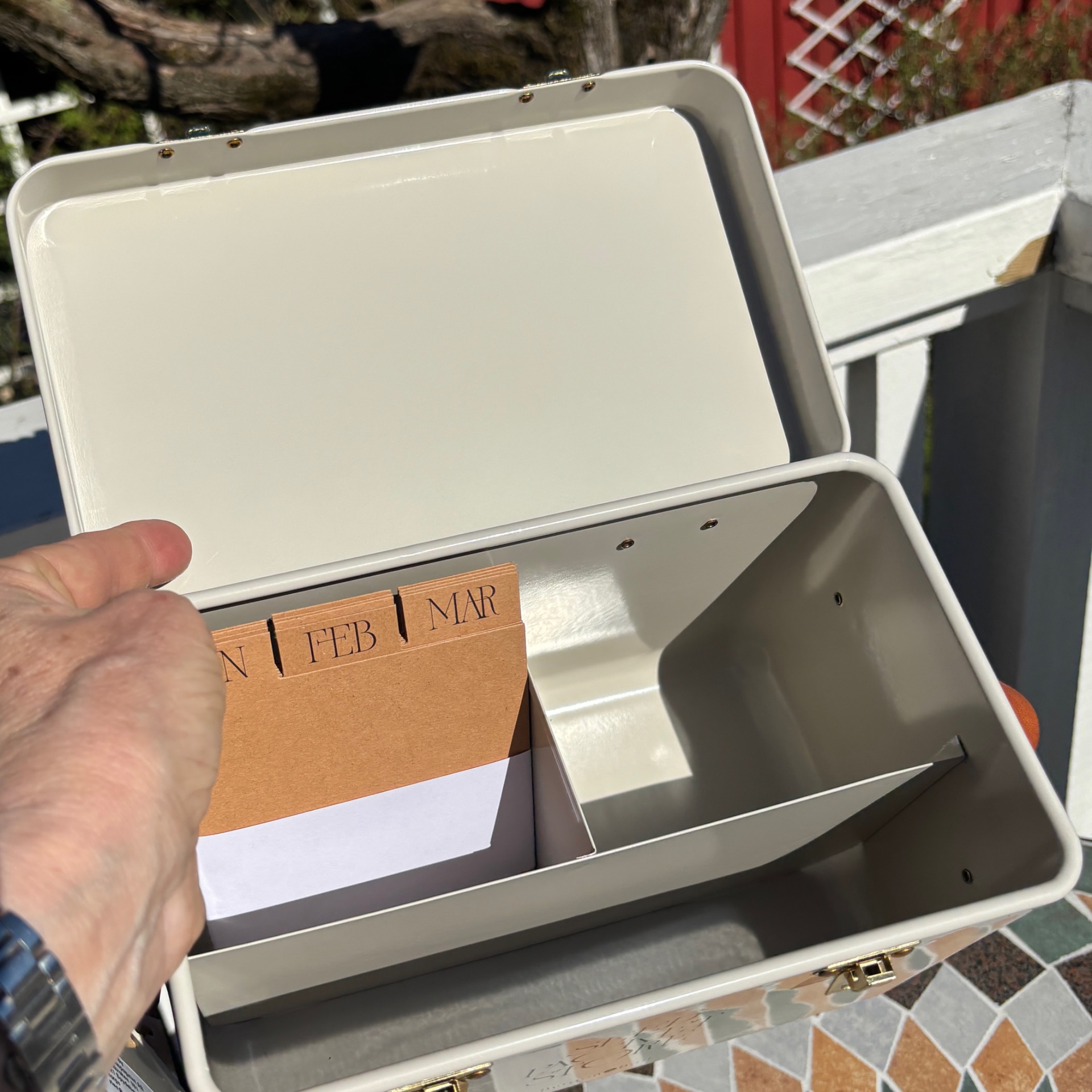 Ved å oppbevare frø i en boks slik som denne sikrer du deg at kvaliteten på frøene holder seg. Boksen holder pakkene tørre og mørke – to viktige faktorer for at holdbarheten på frøet skal beholdes.