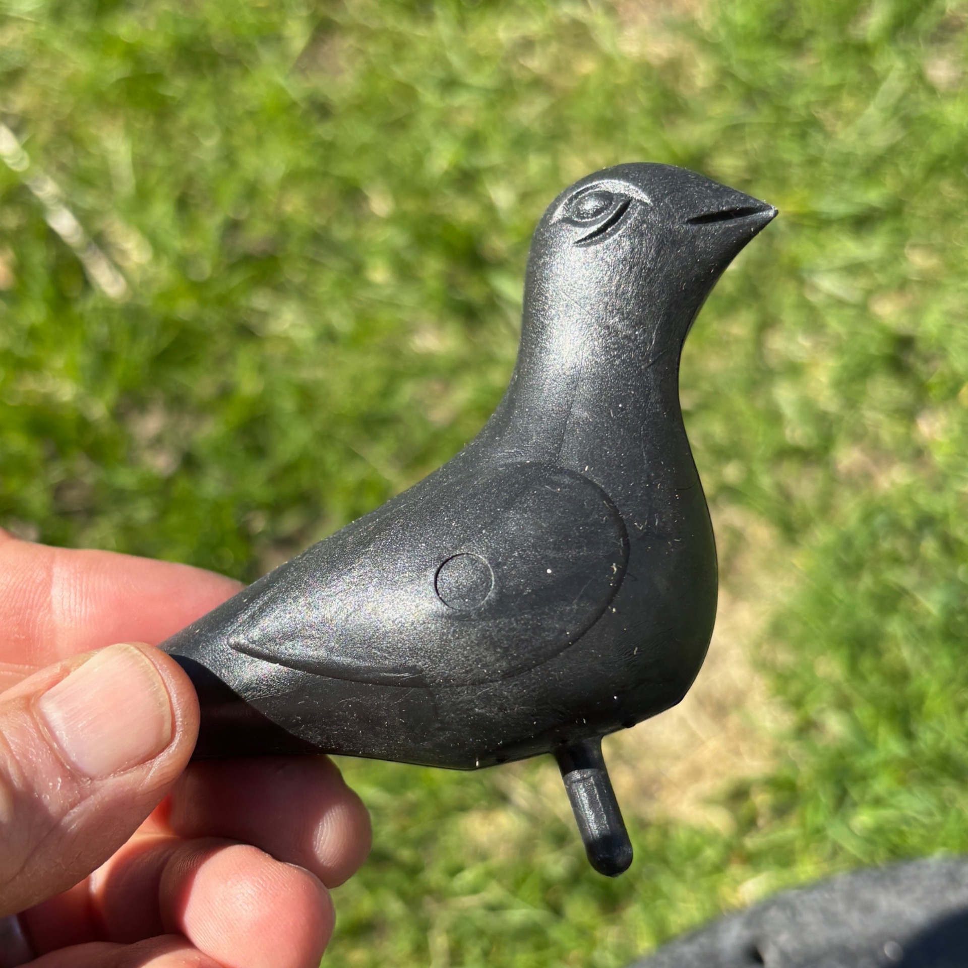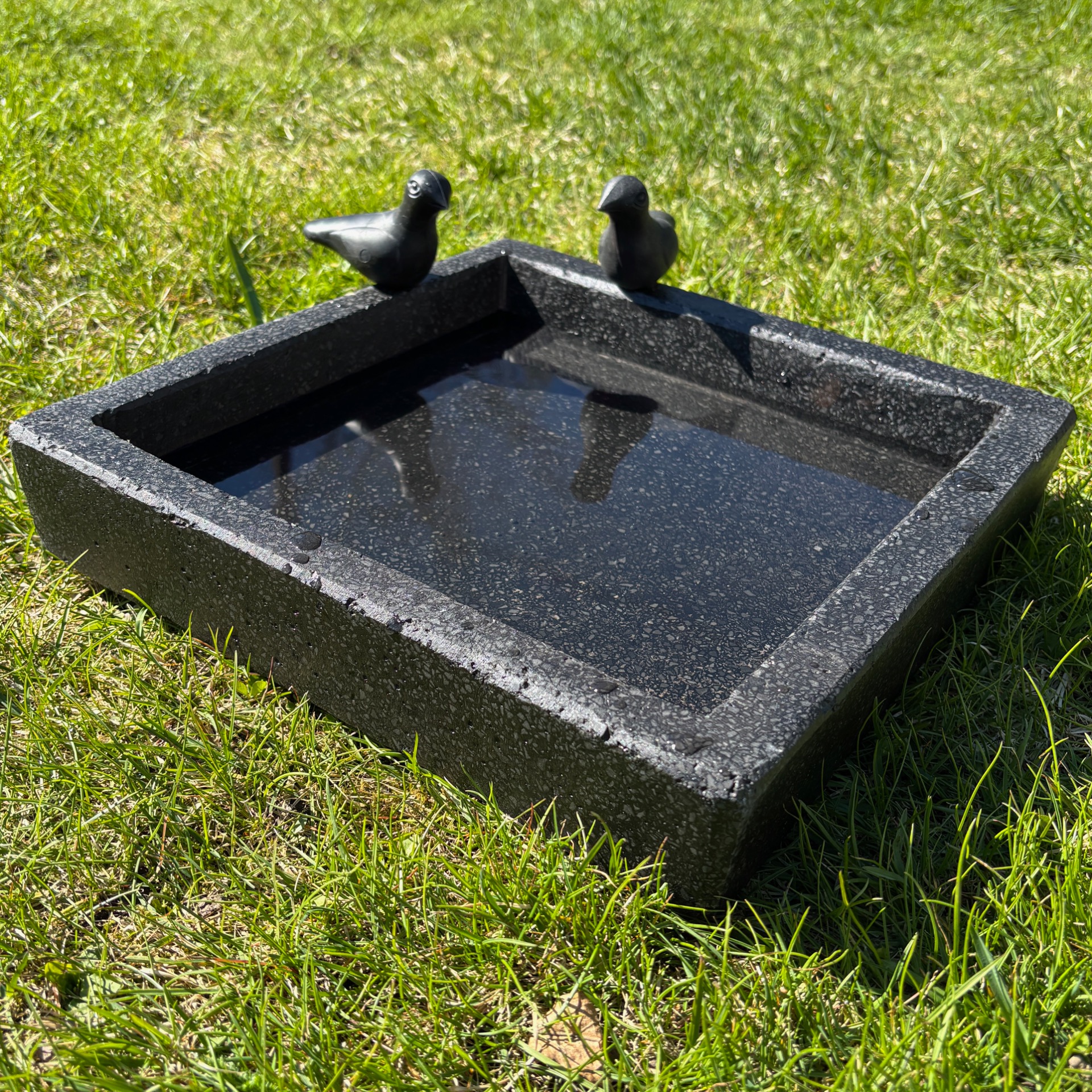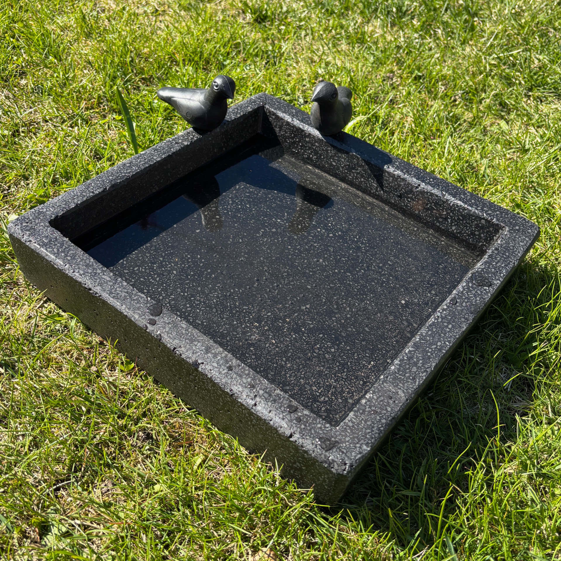 Firkantet helsort fuglebad med to fugler på kanten. Disse kan lett tas av (praktisk ved lagring etc). Fuglene er i kompakt plast og står på pinne.