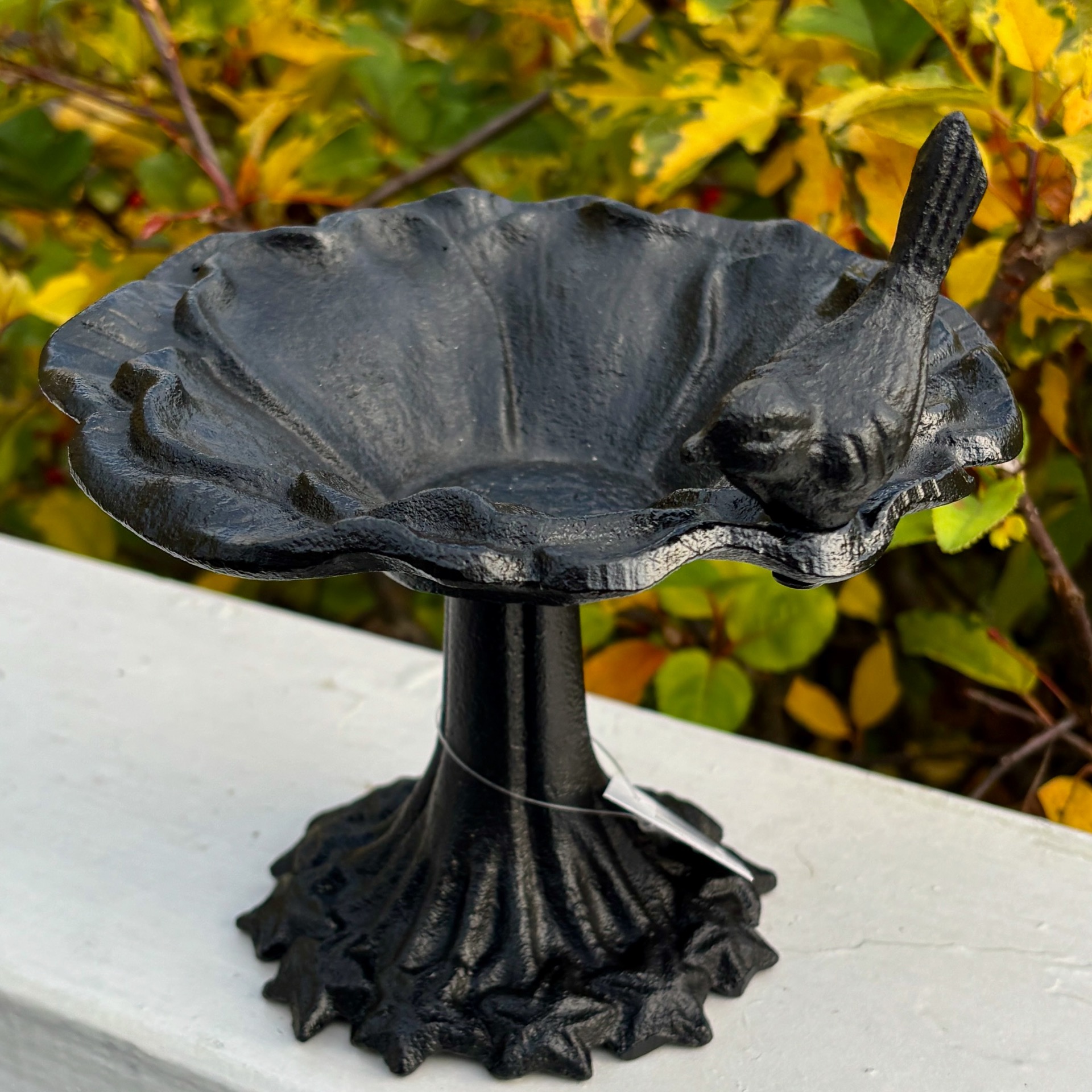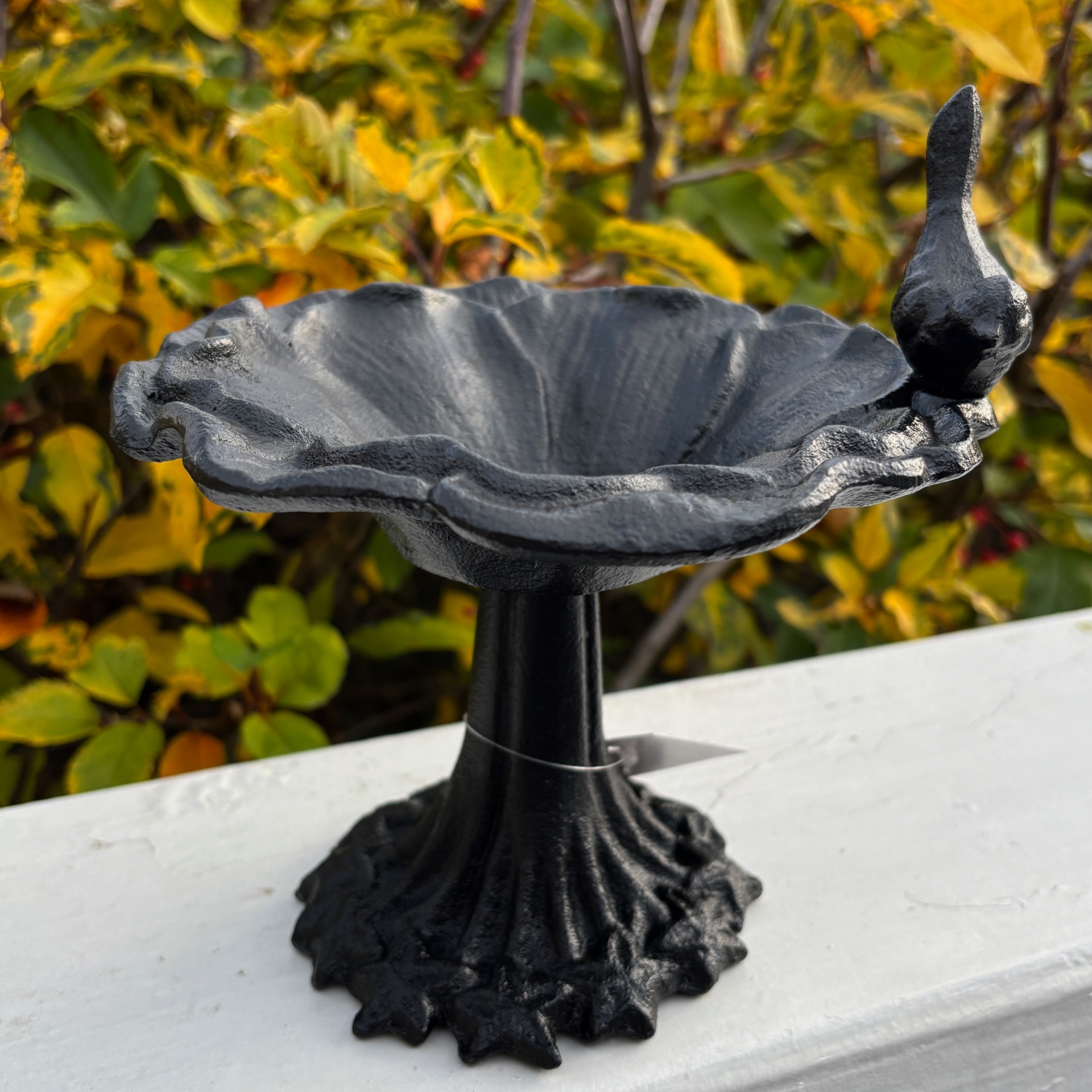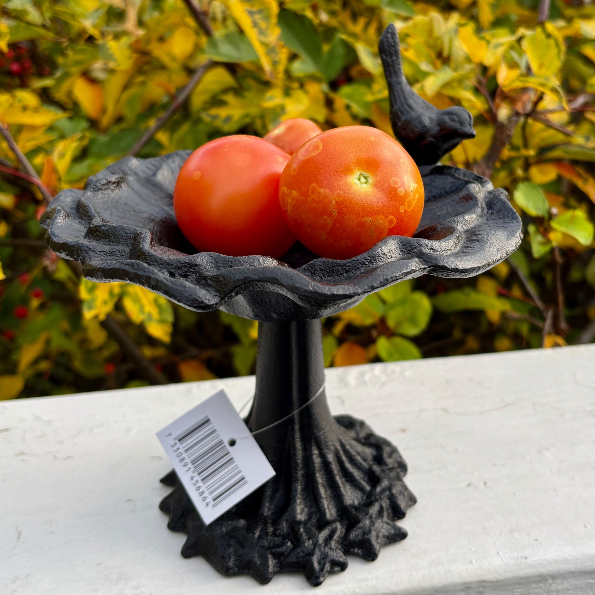 Et lite støpejerns fuglebad eller fuglemater (fint å legge litt mat til småfuglene feks). Den kan utmerket godt brukes inne - slik det er gjort på ene bildet: tomater i helsort fat er vakkert!