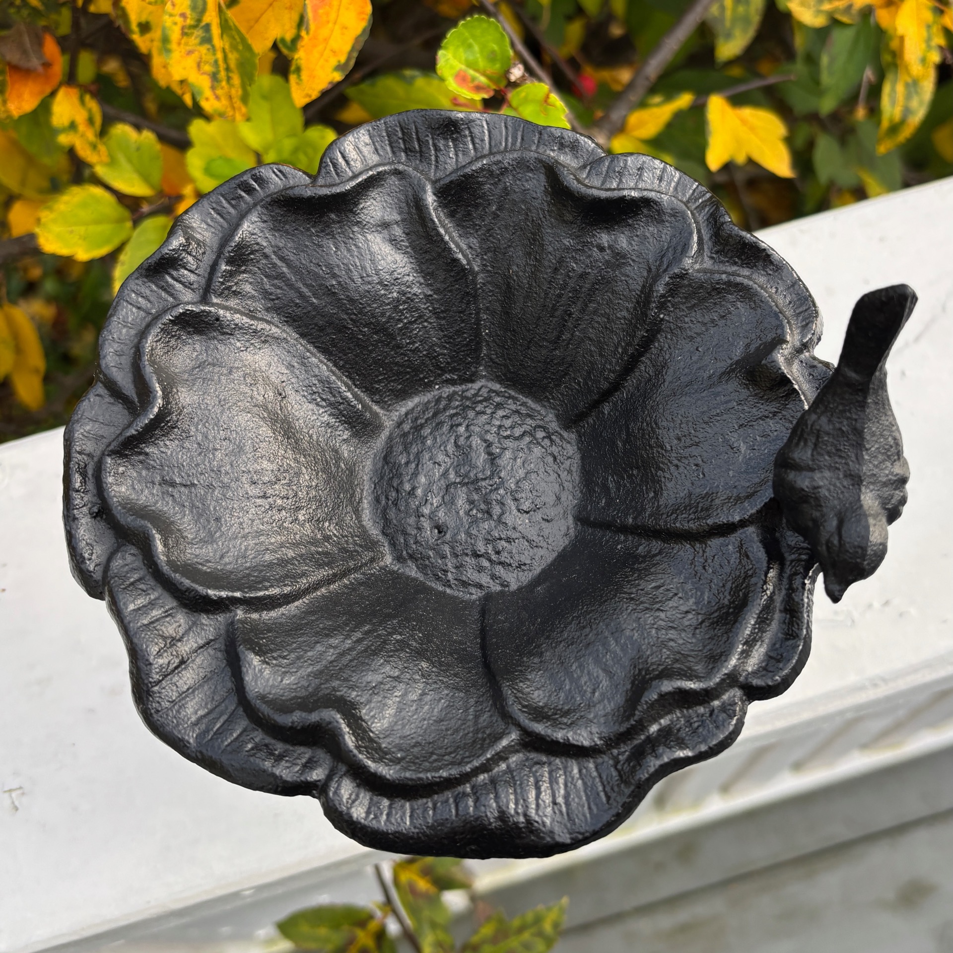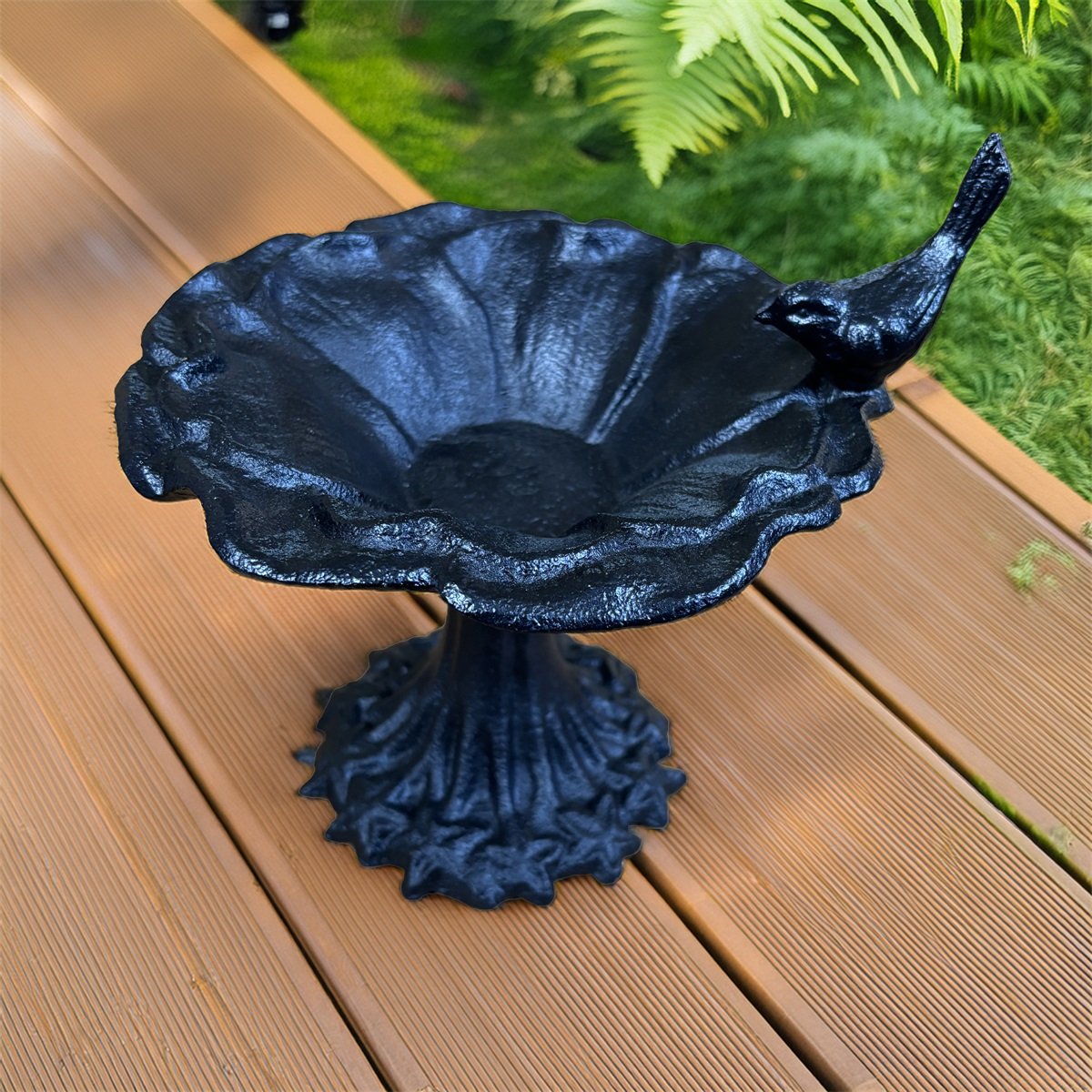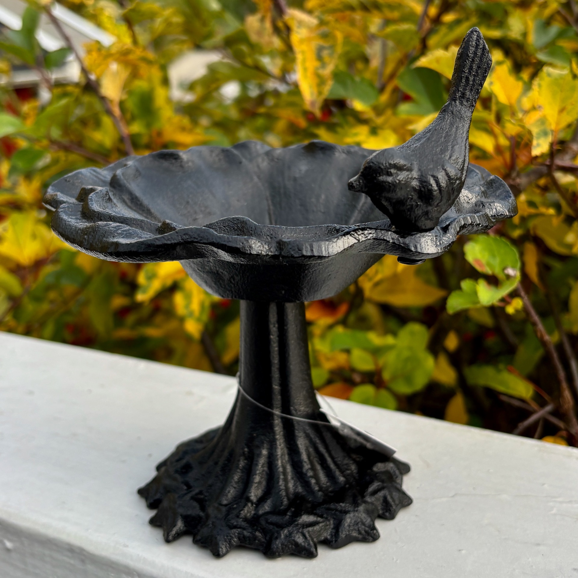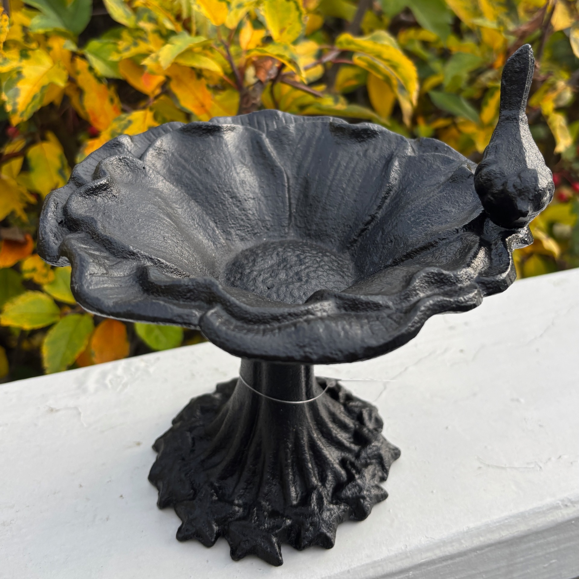 Et lite støpejerns fuglebad eller fuglemater (fint å legge litt mat til småfuglene feks). Den kan utmerket godt brukes inne - slik det er gjort på ene bildet: tomater i helsort fat er vakkert!