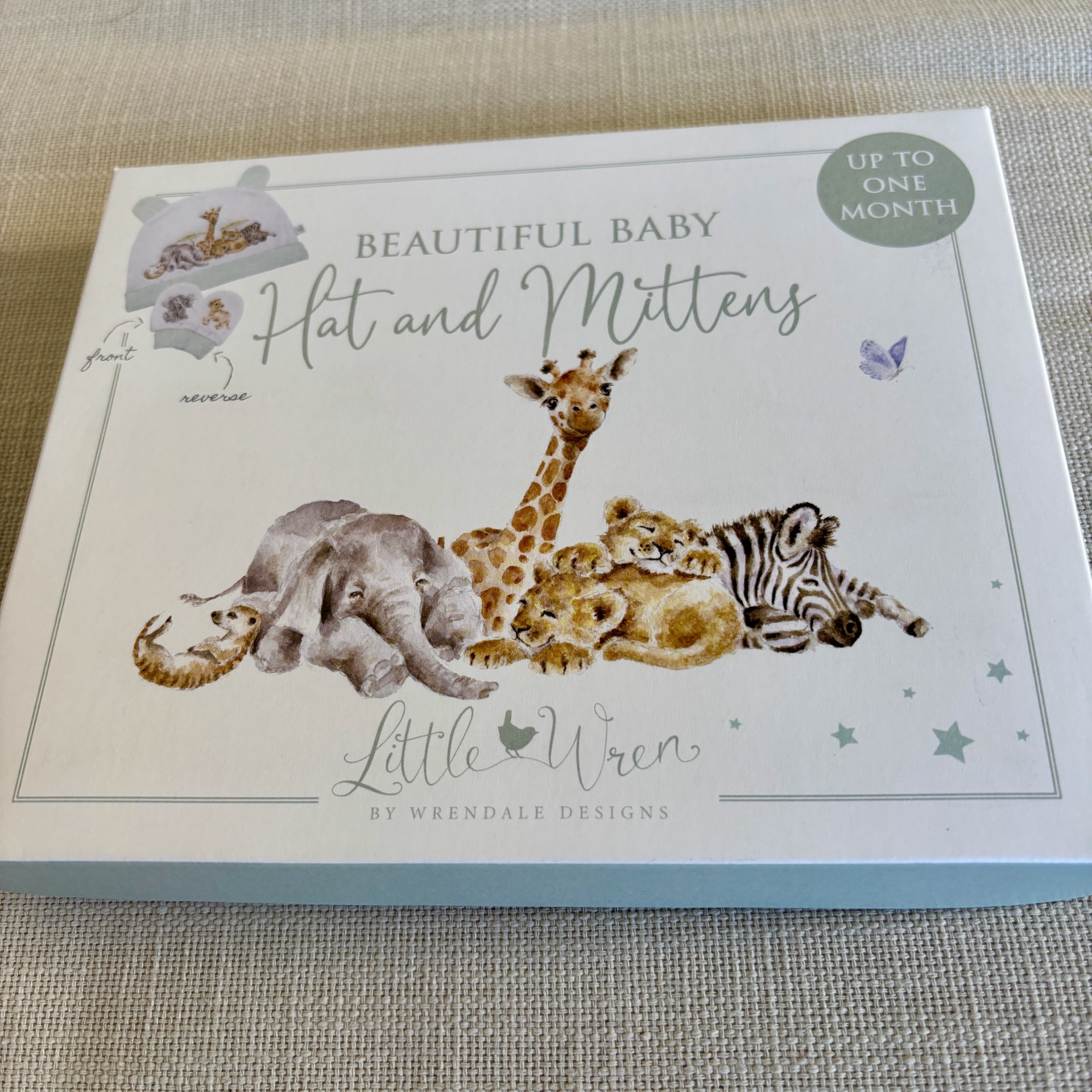 Settet består av en hvit og mintgrønn lue med Afrikas dyr på fronten og mintgrønne "ører". Vottene har ikke tomler (såkalte klorevotter) - de er i hvitt og samme mintgrønne fargen som på luen selvsagt. På ene siden: en elefantunge. På andre siden er det en løveunge.