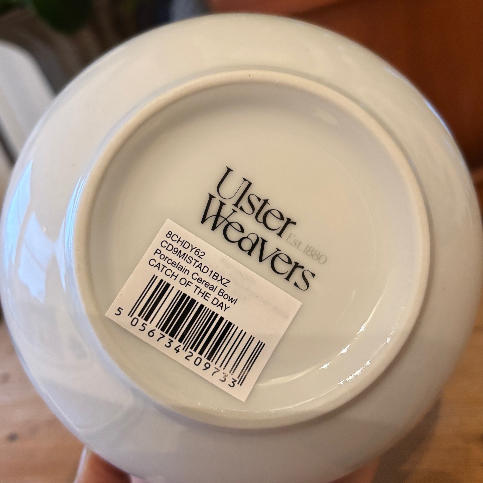 Herlig godteskål i hvit porselen med bord på utsiden og stilisert, blå fisk i bunn. :-) Produsent er irske Ulsters Weavers. Skålen er laget i porselen.