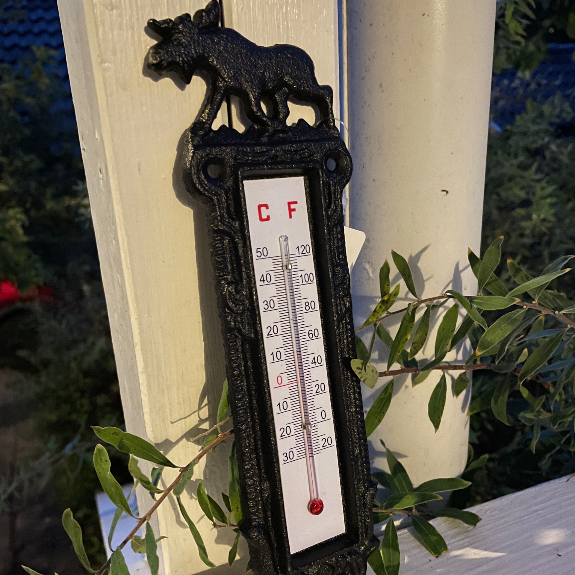 Den er laget i støpejern og viser både celsius og fahrenheit.