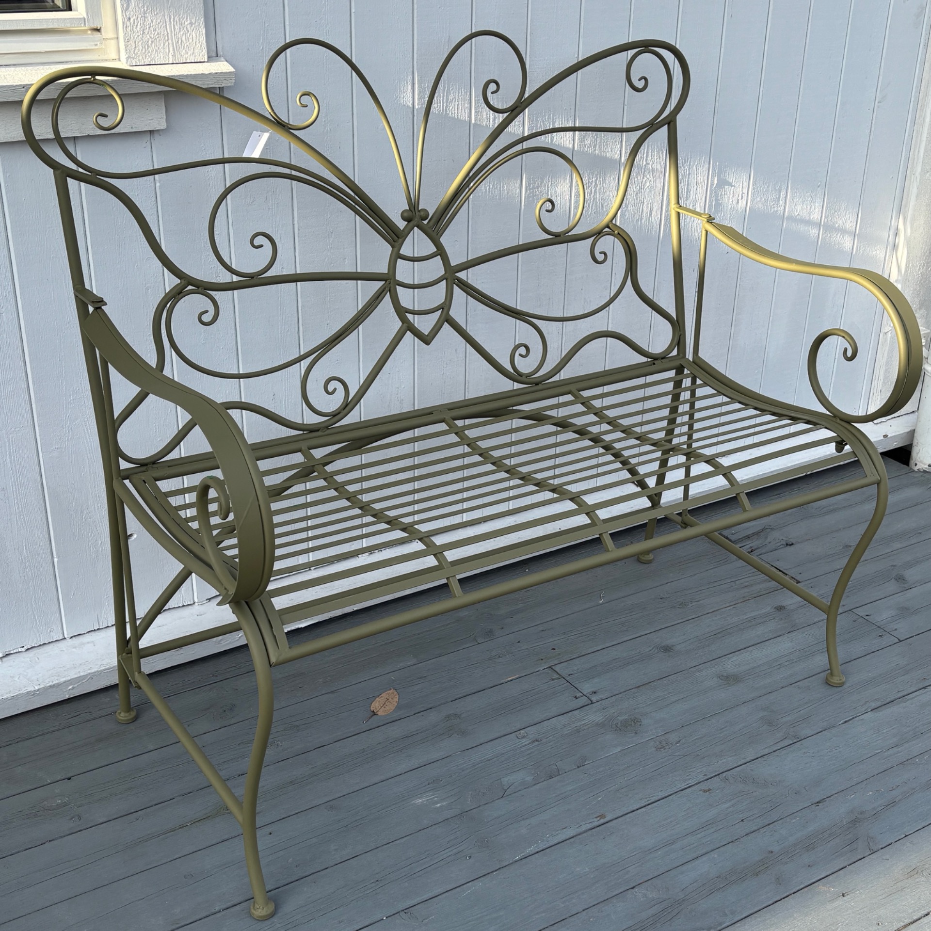 Sjarmerende hagebenk i metall med sommerfugl-motiv i ryggen. Sober grønnfarge, som passer godt inn både i hagen, terrassen og også i drivhus - hvis du har plass da :-)