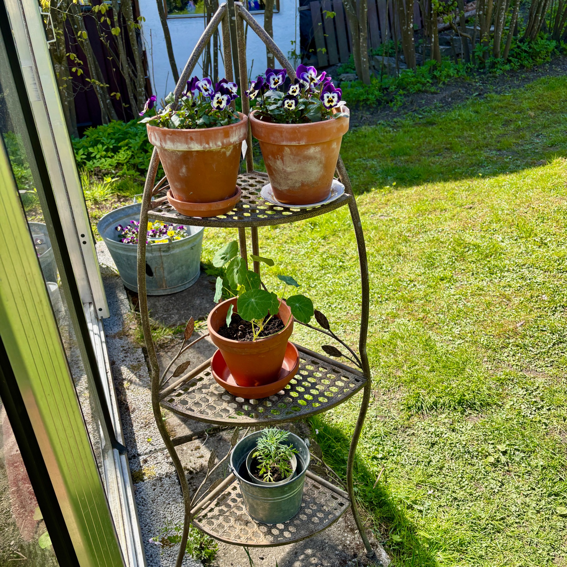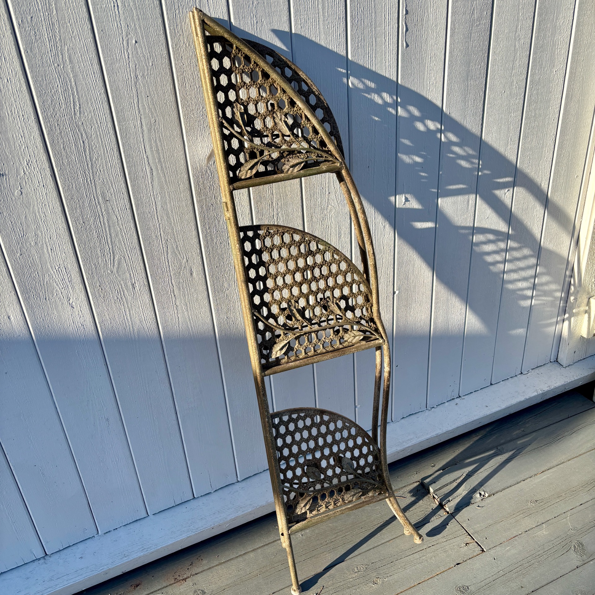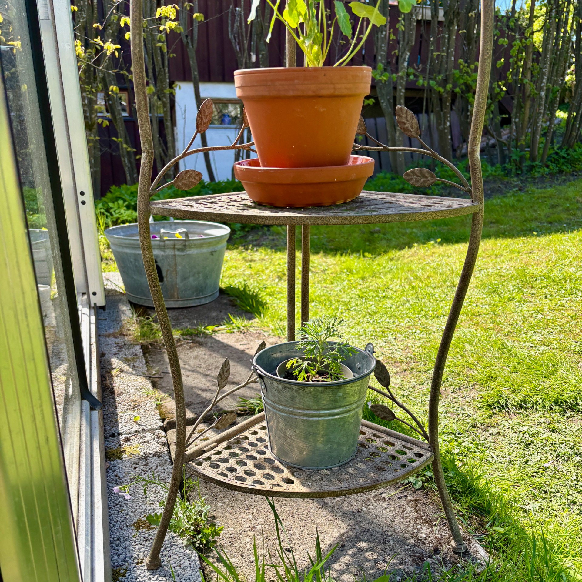 Hagehylle - beregnet for hjørne - i metall. Denne har en smart detalj: Den foldes bare sammen og kommer i ett stykke. Farge: antique green. Høyde er 112 cm og dybde og bredde 30x46 cm.