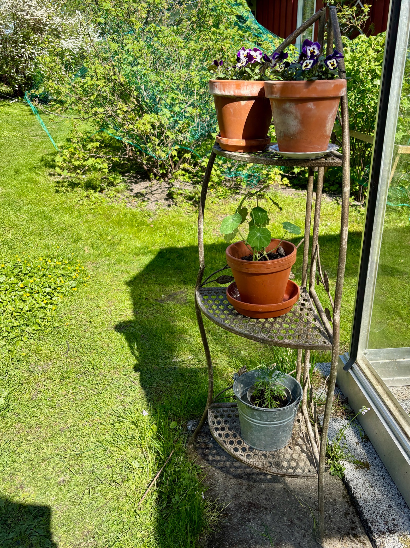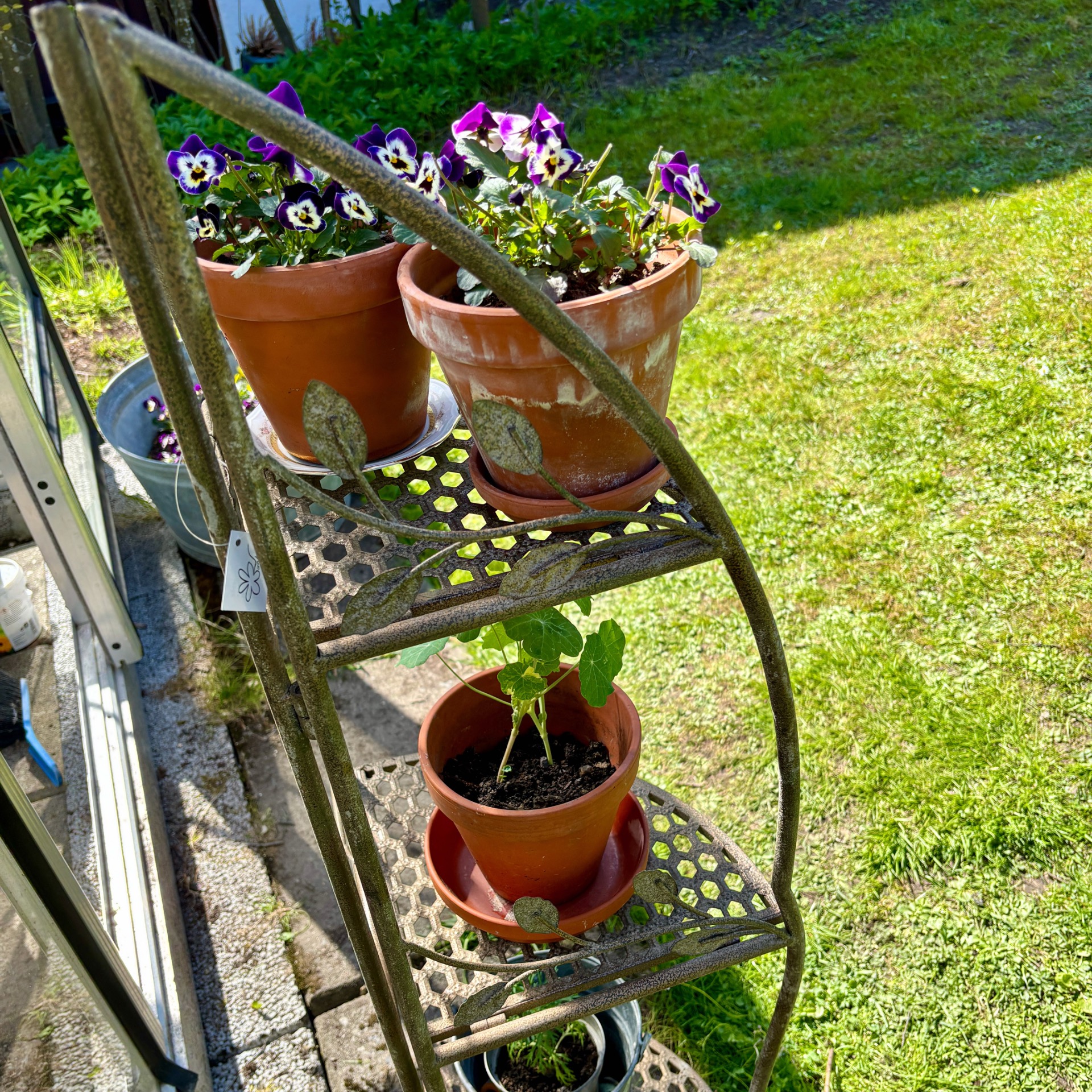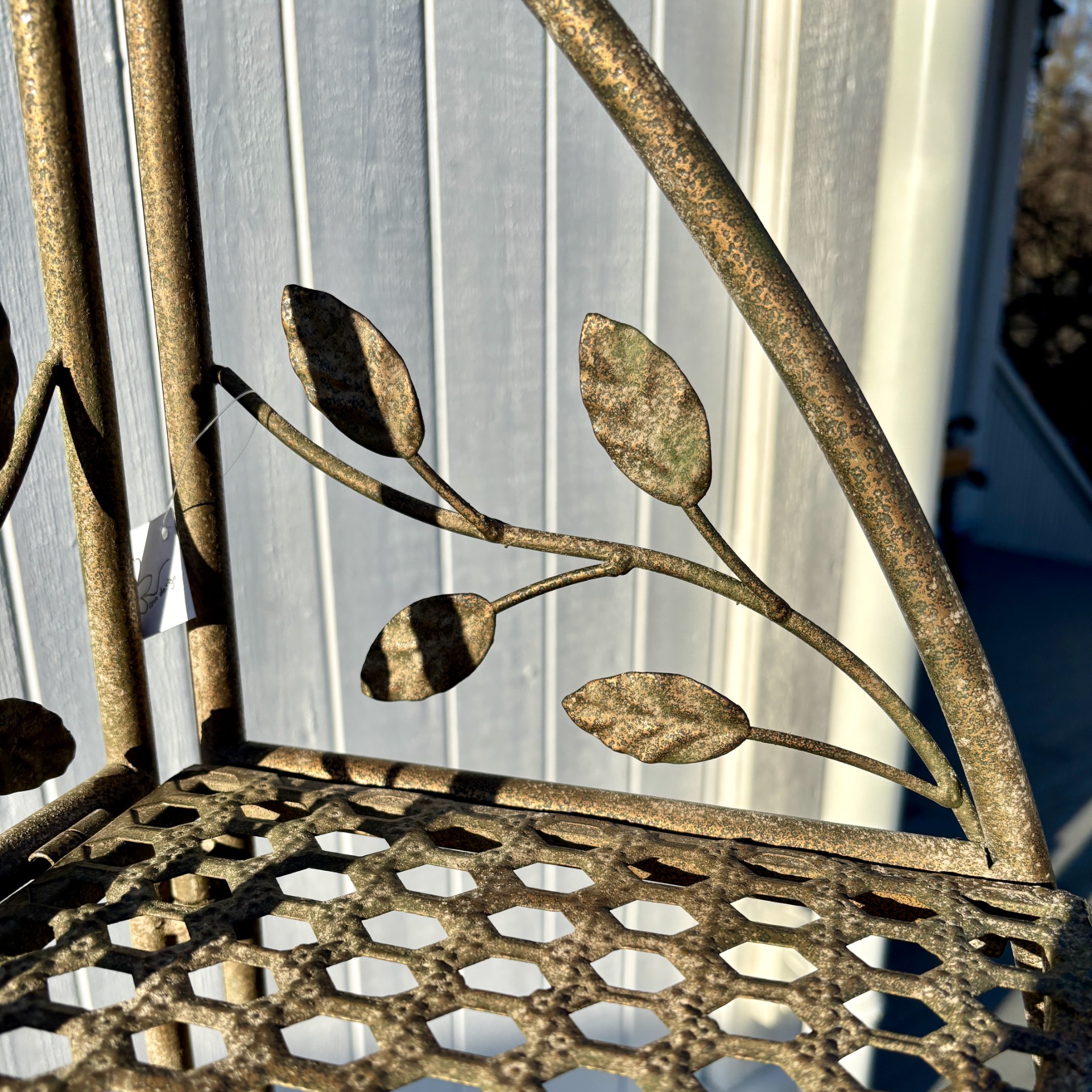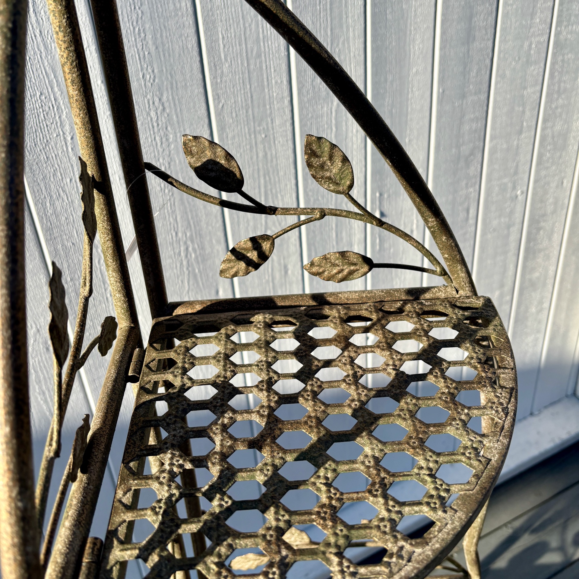 Hagehylle - beregnet for hjørne - i metall. Denne har en smart detalj: Den foldes bare sammen og kommer i ett stykke. Farge: antique green. Høyde er 112 cm og dybde og bredde 30x46 cm.