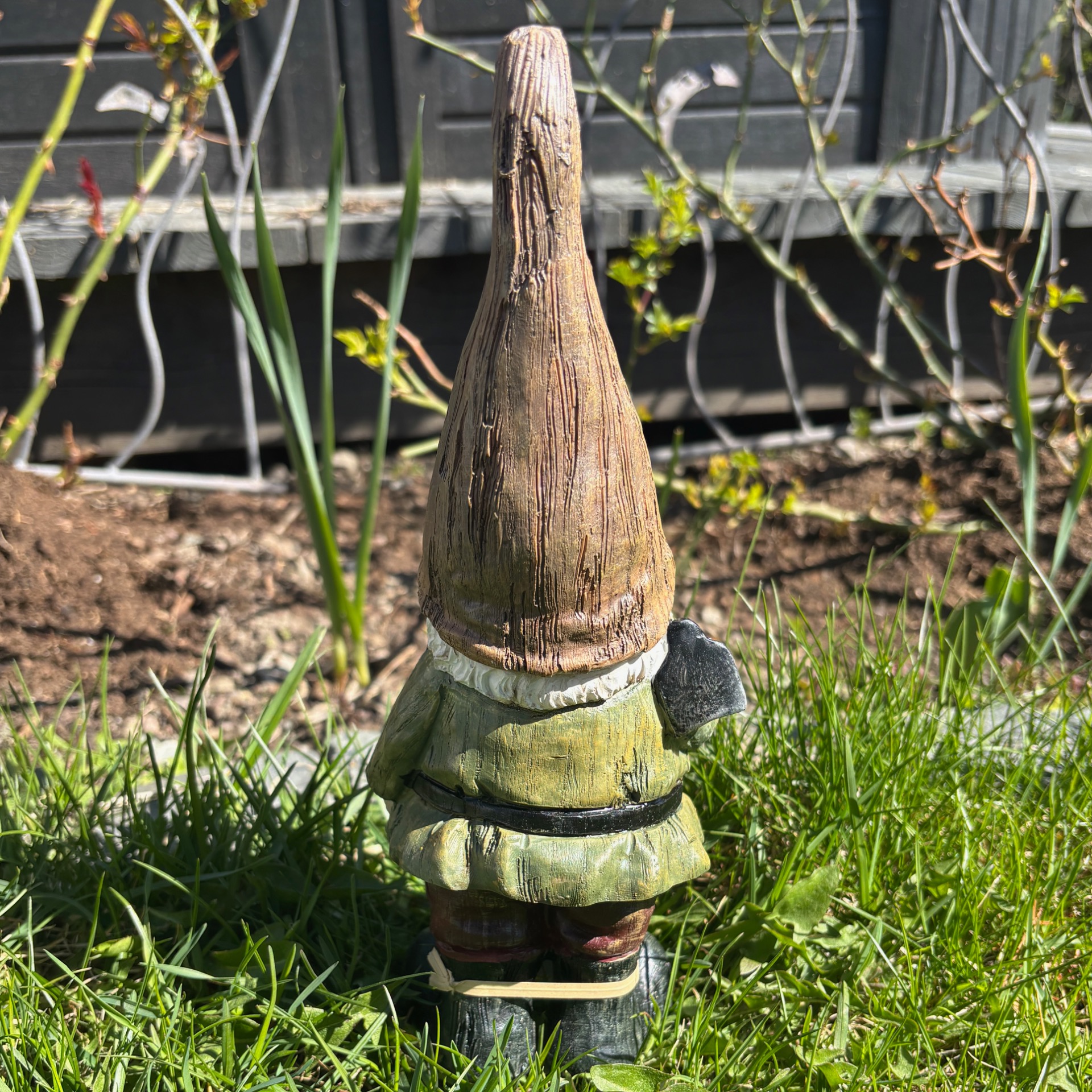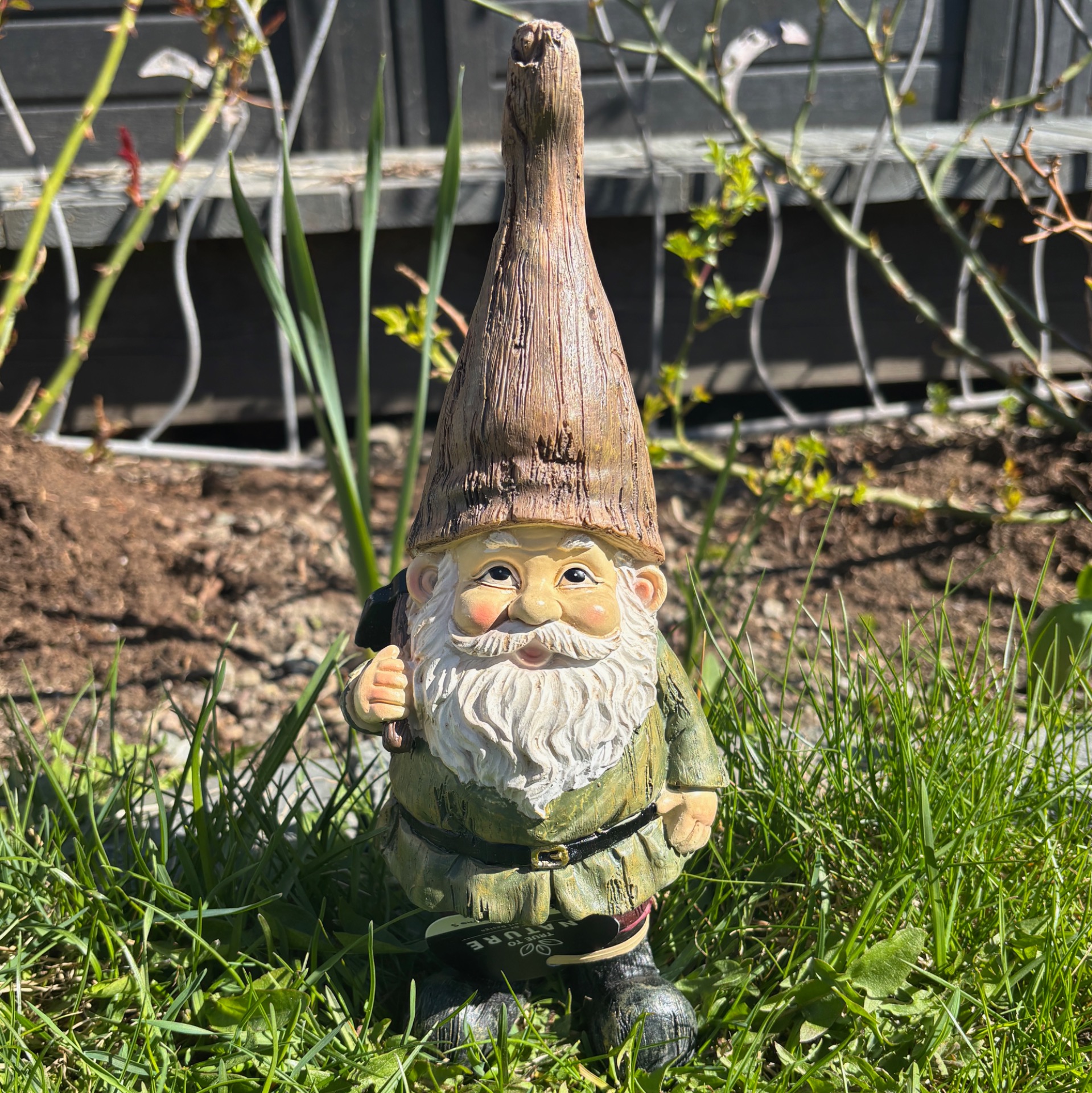 Hagenisse tenker du? Joda - alle fortjener vel en hagenisse i hagen sin - eller kanskje du kjenner noen som samler på det? :-) Denne lystige fyren har lys grønn jakke, brun lue og han er laget i polyresin. Liker godt å slippe dagevis med regn, vil jeg tro og når det stunder mot kaldere tider - ja, da vil han inn i boden. :-)