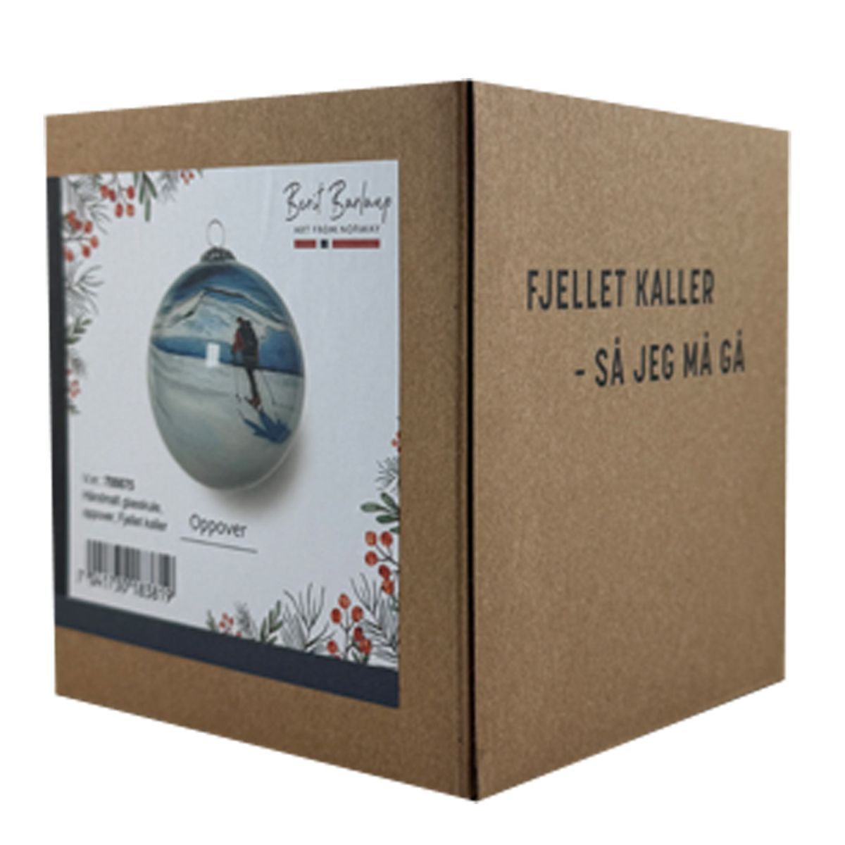 Julekulen er malt for hånd på innsiden av glasset gjennom det lille hullet i toppen med motivet Oppover fra serien Fjellet kaller. Tenk det! Malt for hånd fra det lille hullet! Utrolig godt gjort. Det er akvarellkunstner Berit Barlaup som har malt dette motivet, som heter "Oppover" (Nettbutikken har også en kule med motiv "bortover").