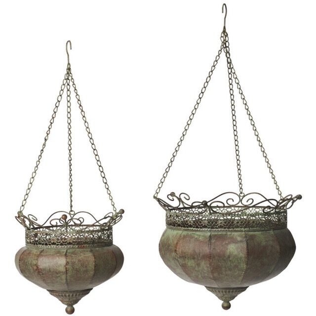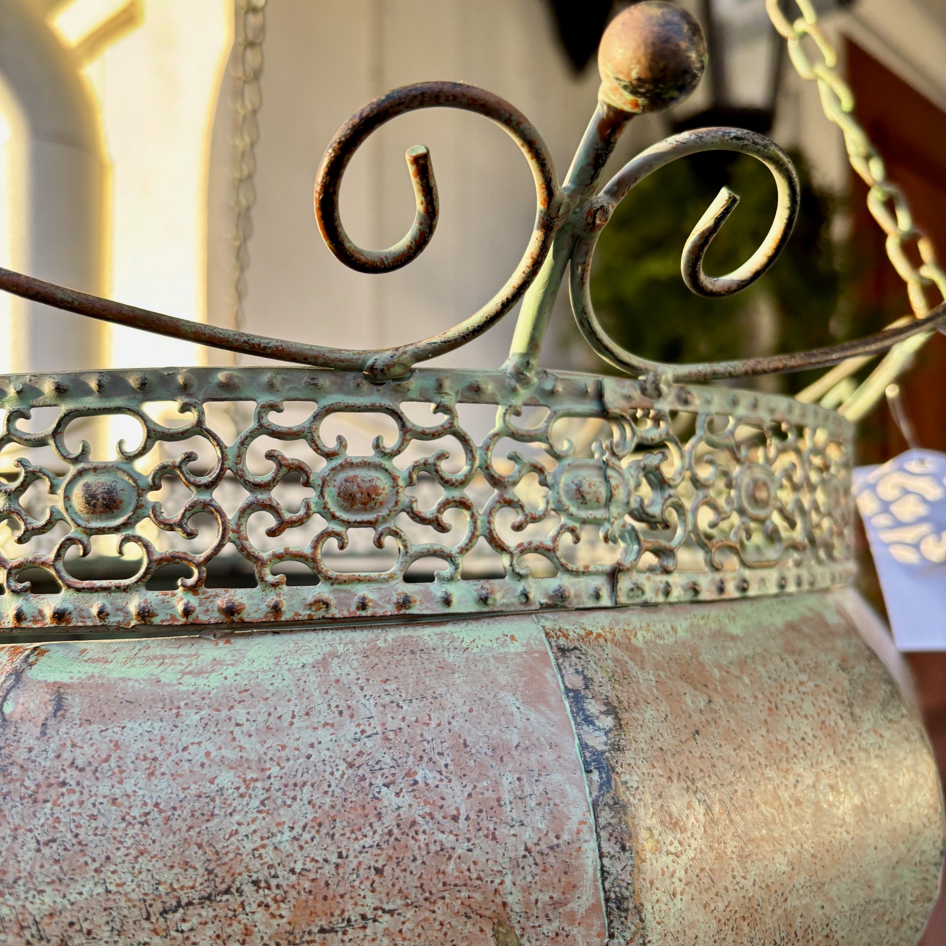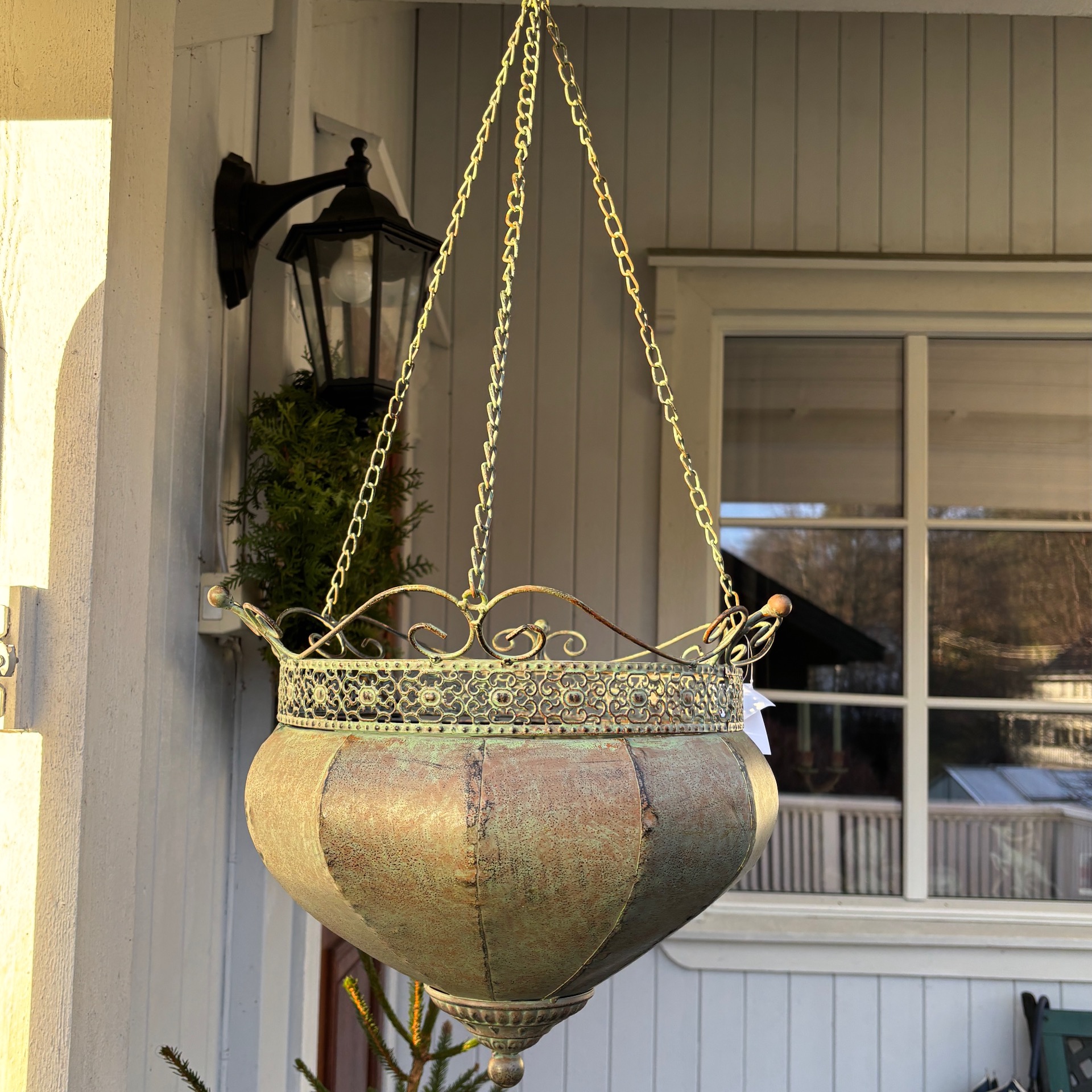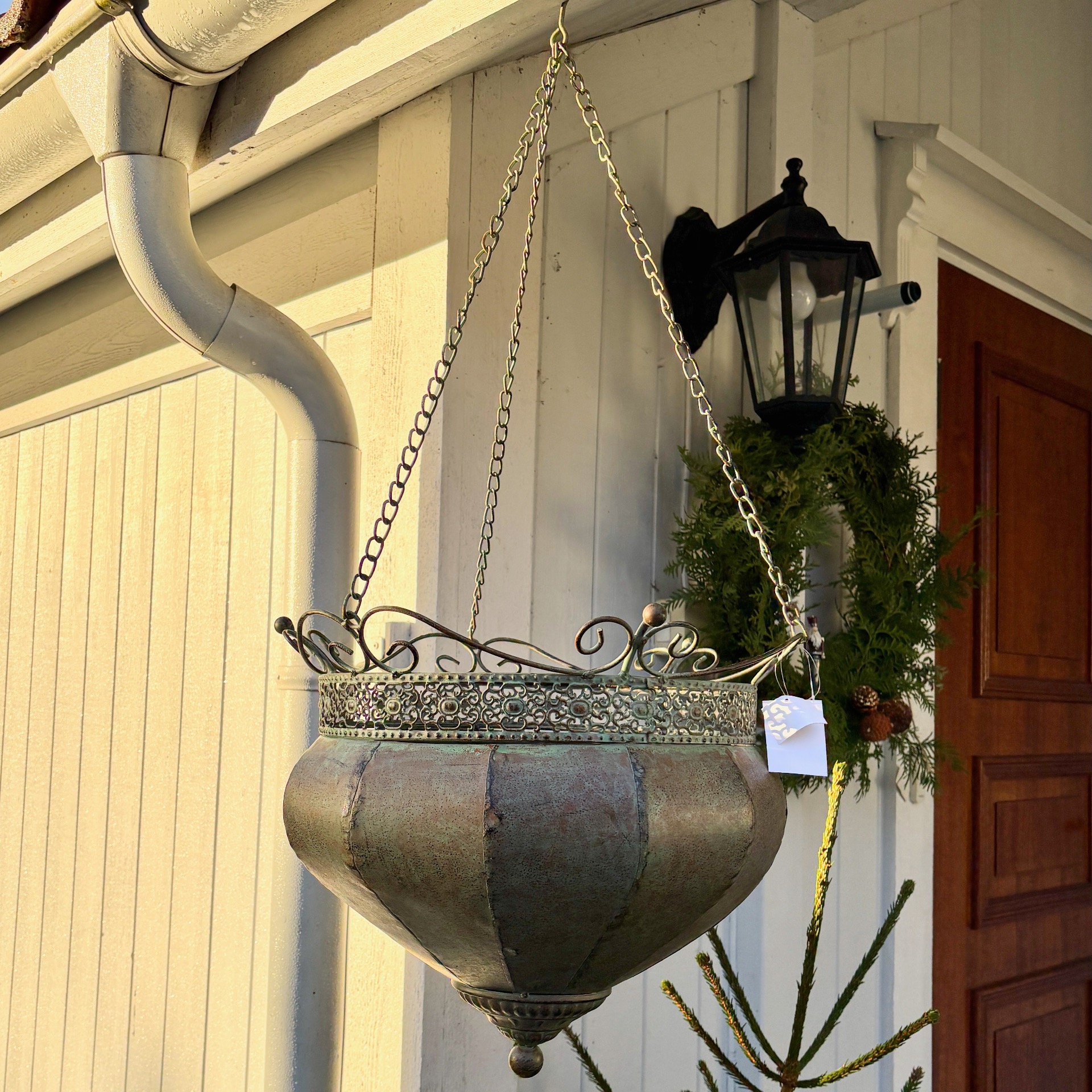 Er du ute etter en ampel som virkelig synes og i tillegg er vakker, så se her: Denne her er laget i metall, er i fargen antikk grønn og har en nydelig kant. Den henger i tre lenker med en god krok.