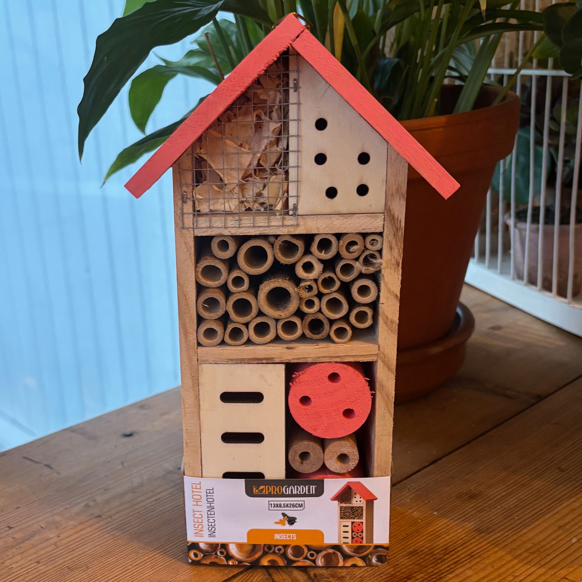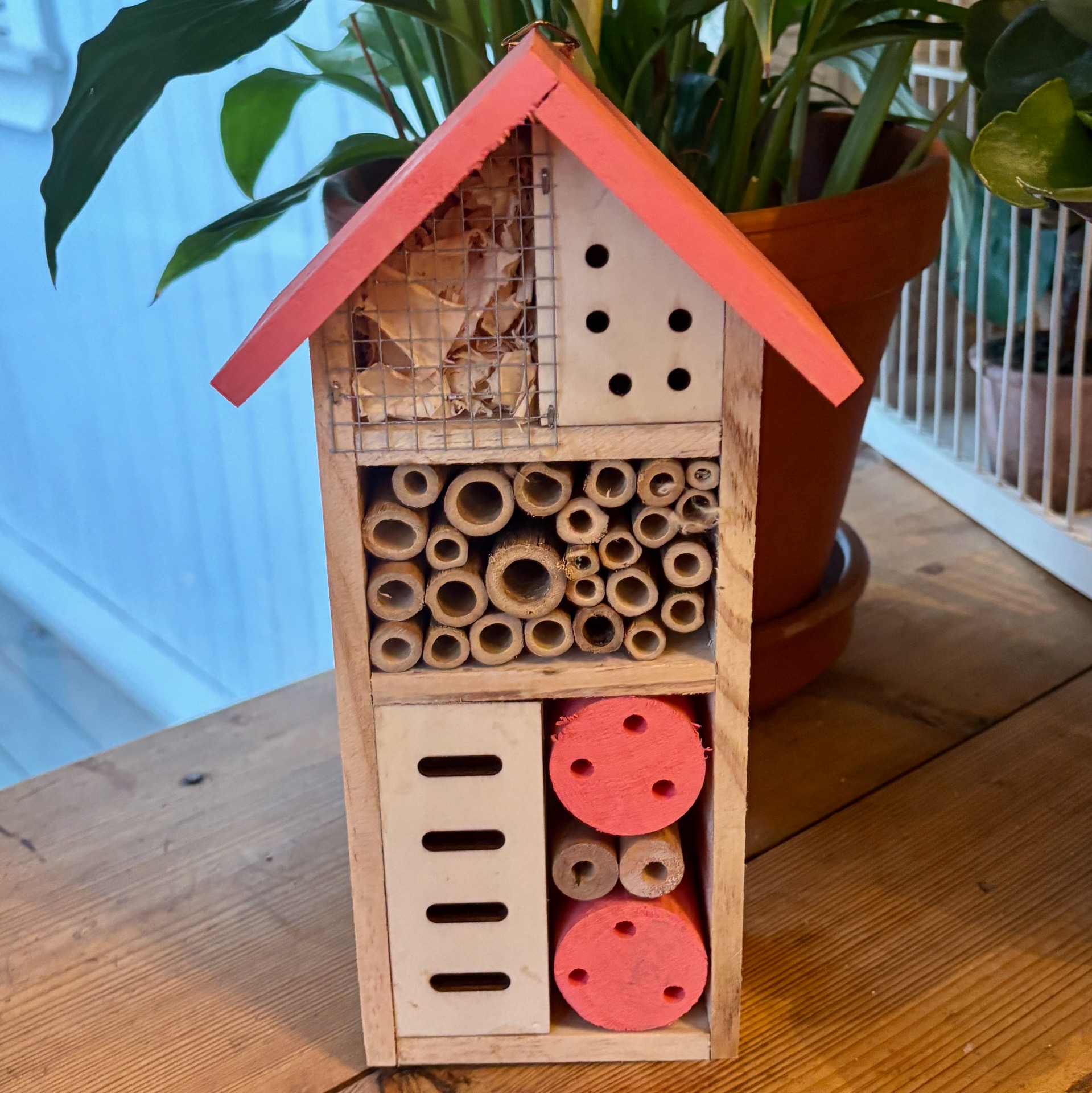 Insektene liker godt insektshotell selvsagt og dette her har flere bekvemmeligheter for de små :-) Fargen på taket og to rundinger er rosa. Bak er det krok til oppheng.