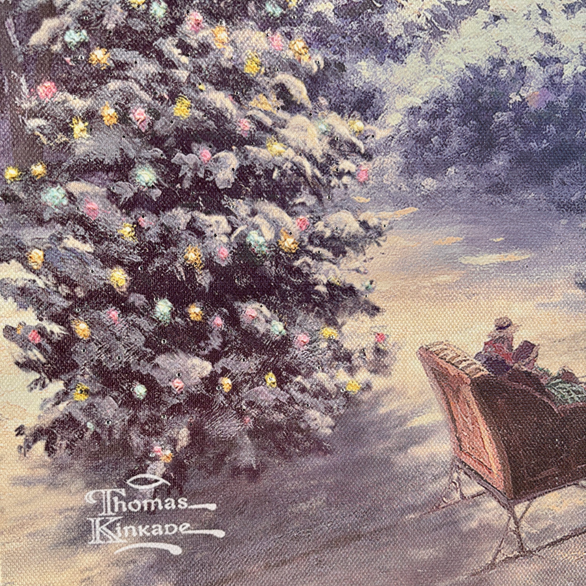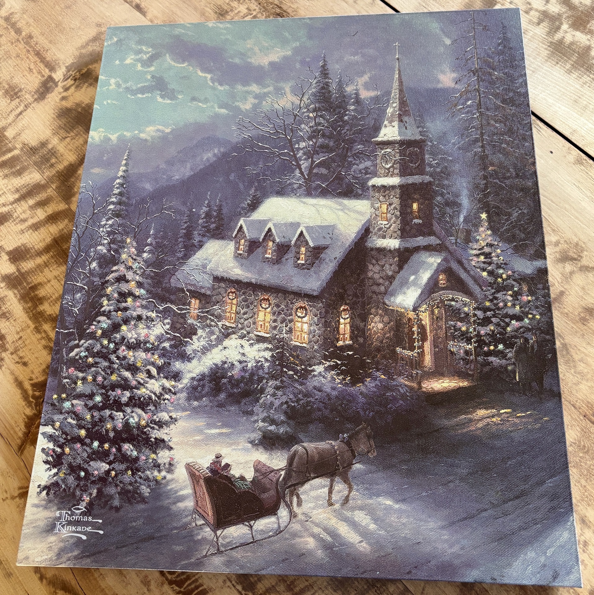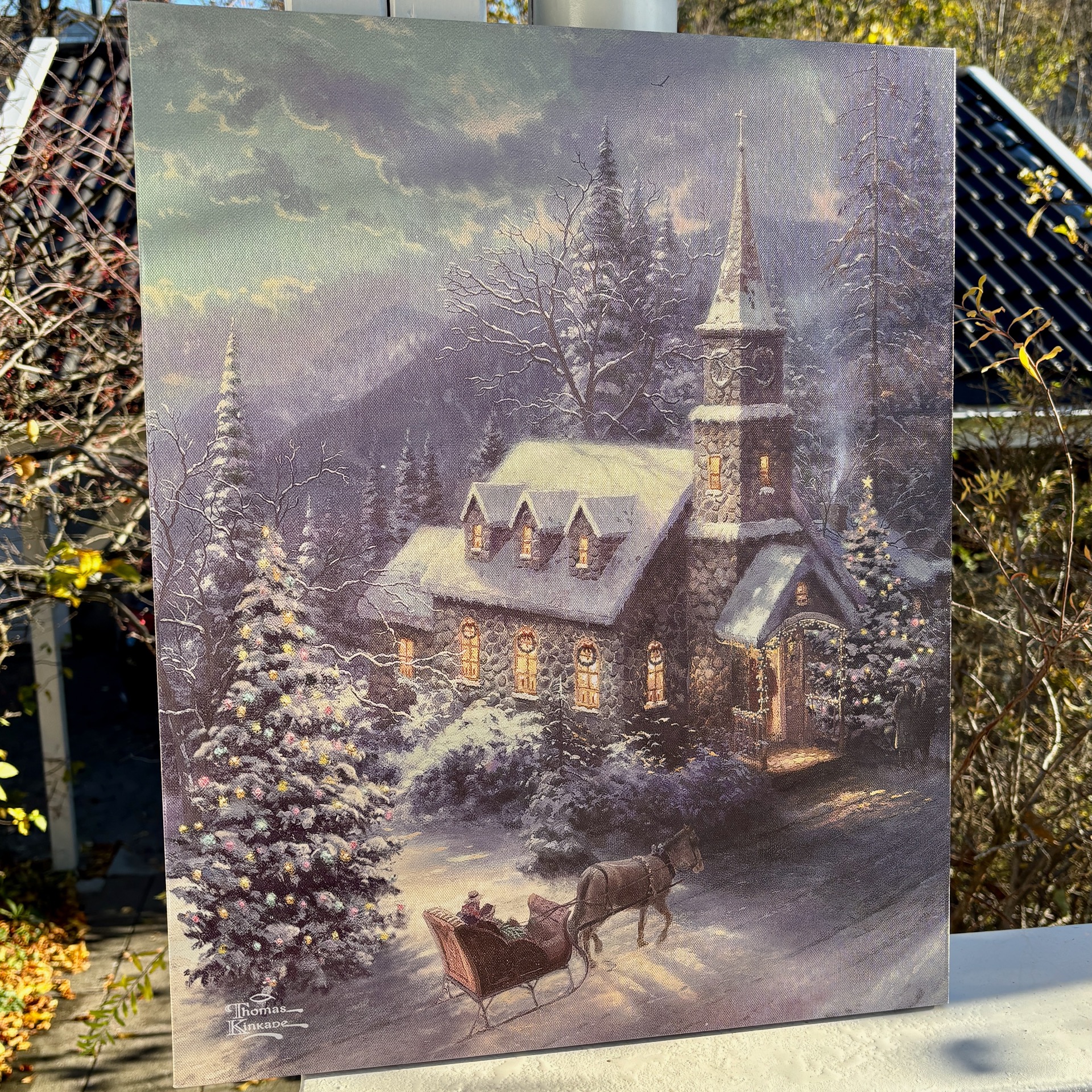Thomas Kinkade (amerikansk billedkunstner) har laget denne stemningsfulle tegningen av en kirke med kirkefolket på vei med hest og slede. Bildet er utstyrt med LED-lys. Når lyset kommer på, blir det lys både i trærne og i vinduene. Det er 4 stk AA-batteri som driver lyset (følger ikke med) og det er også med en fjernkontroll. Det er også av-på-knapp bak i tillegg.