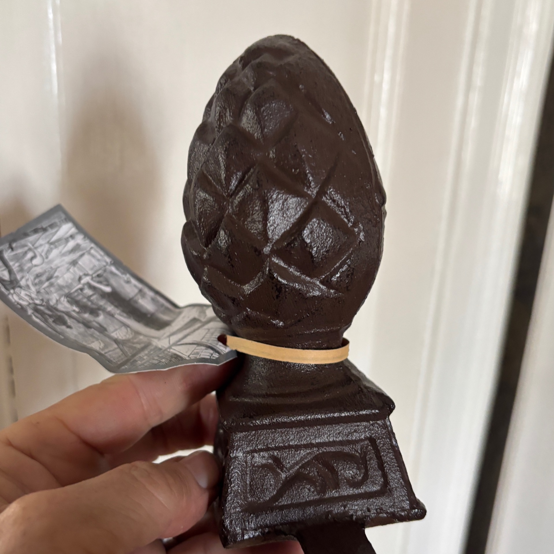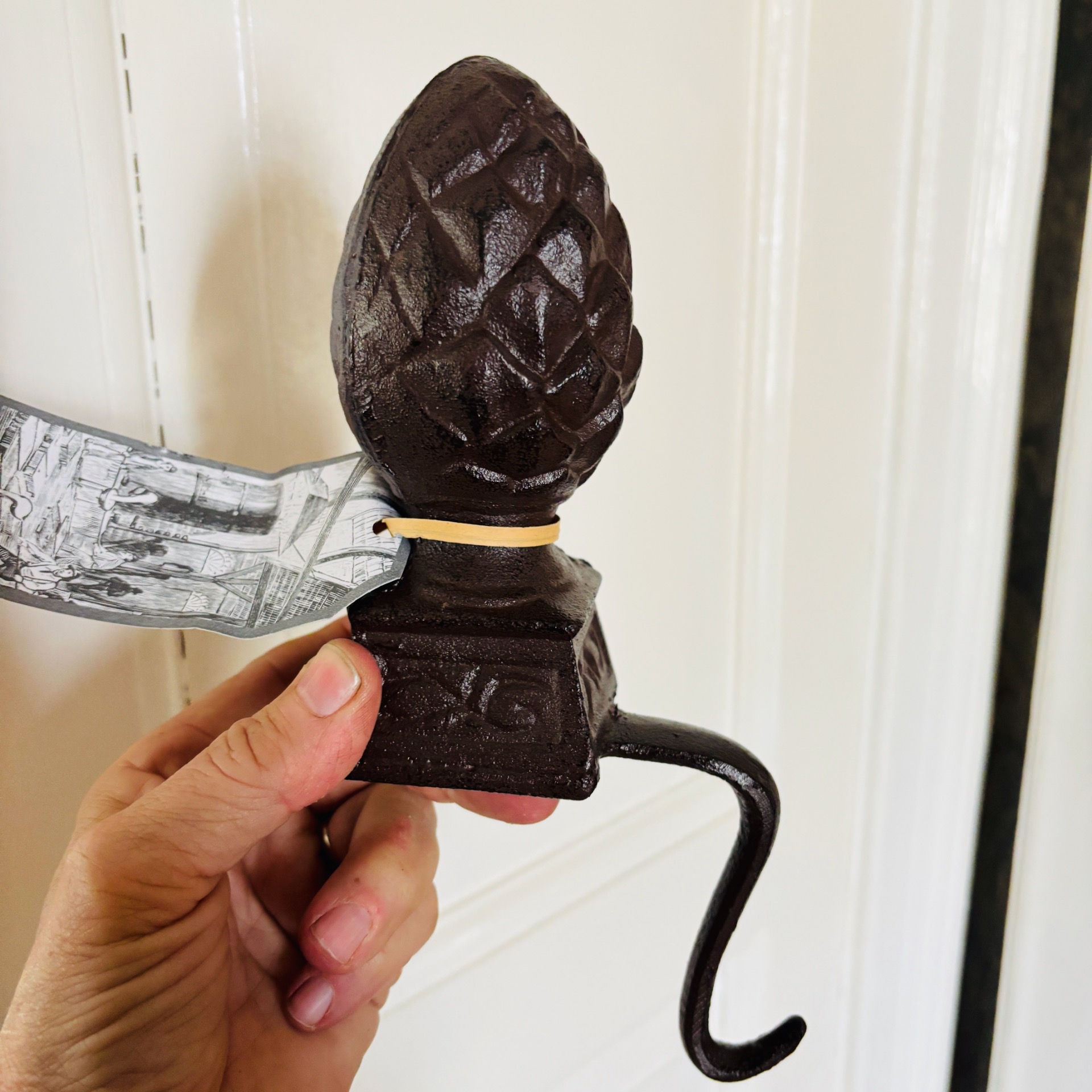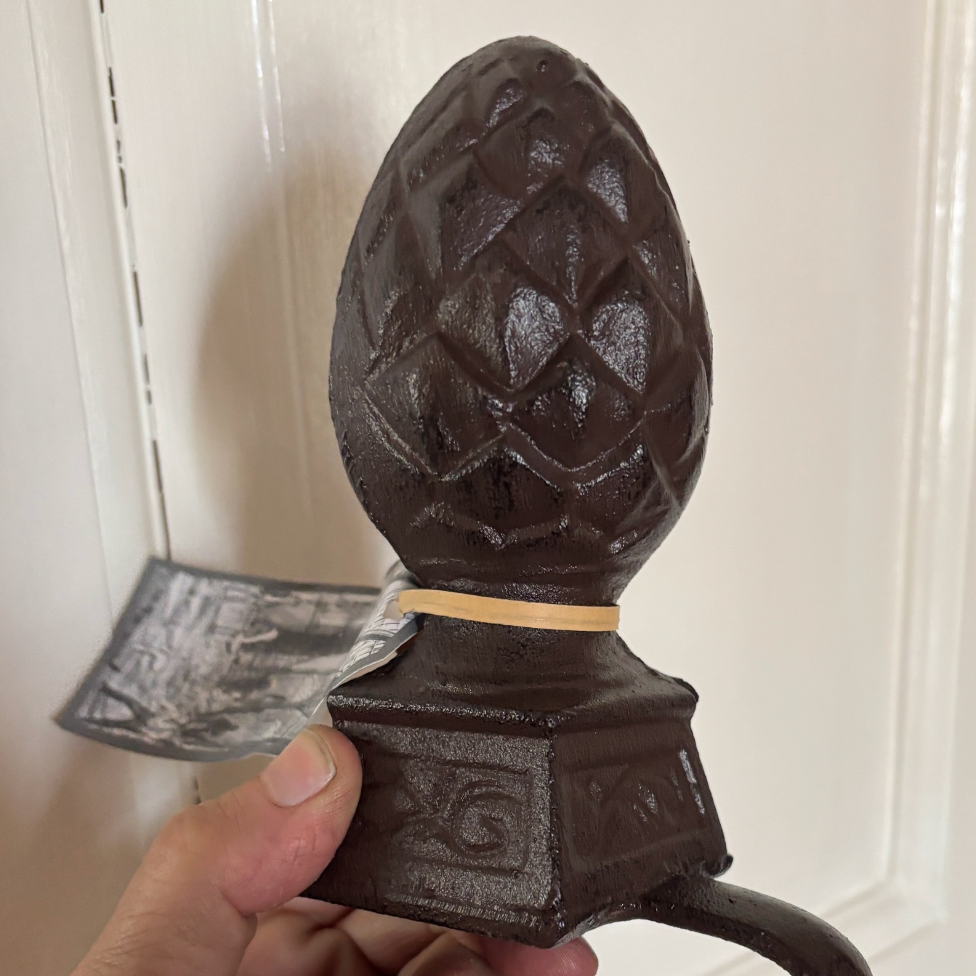 Tung mørk brun julestrømpe-holder i støpejern. Motivet er "lukket kongle". Nettbutikken har også en ganske lik - men da med "åpenkongle". :-)