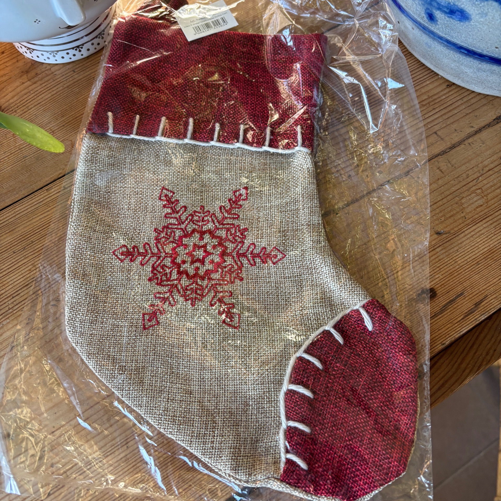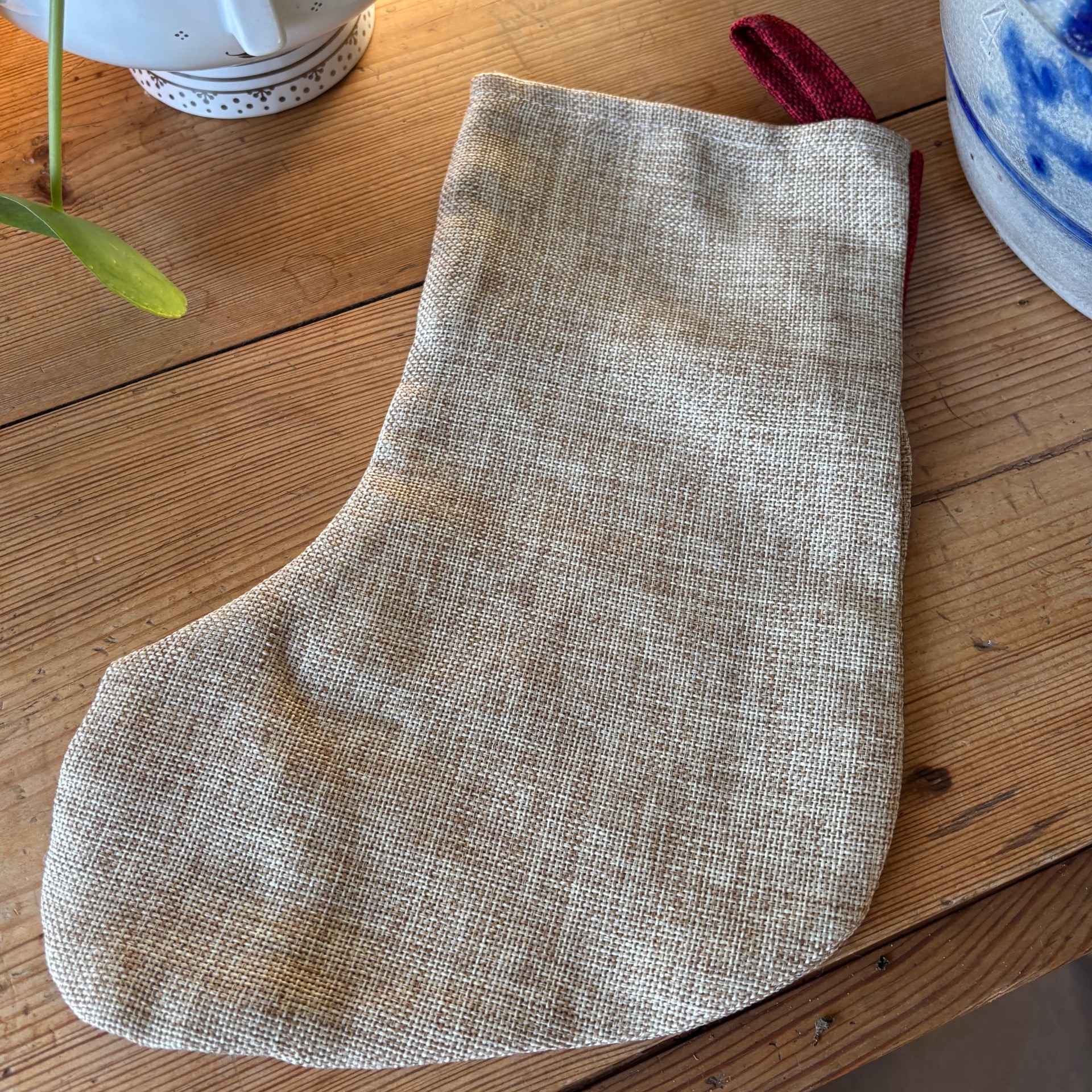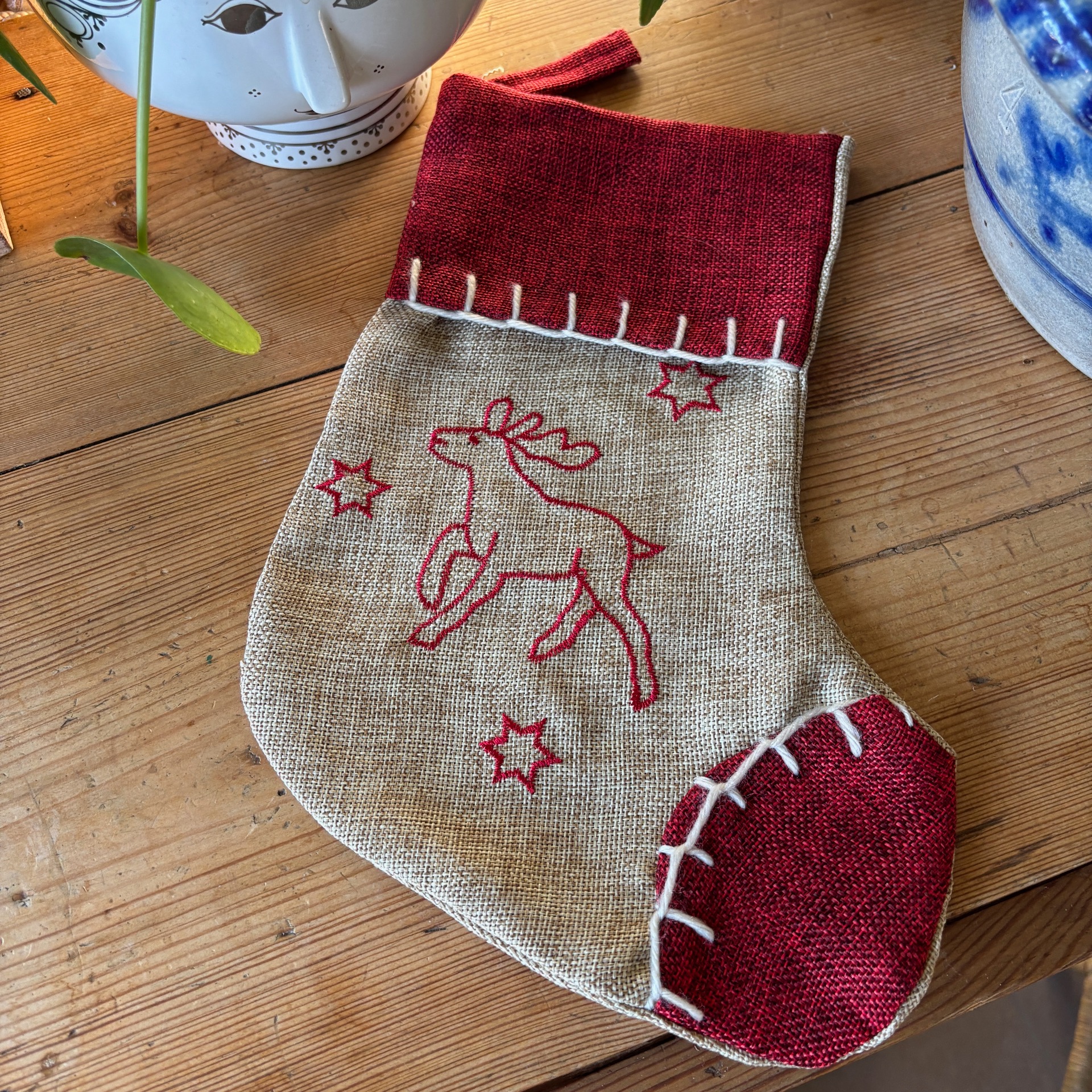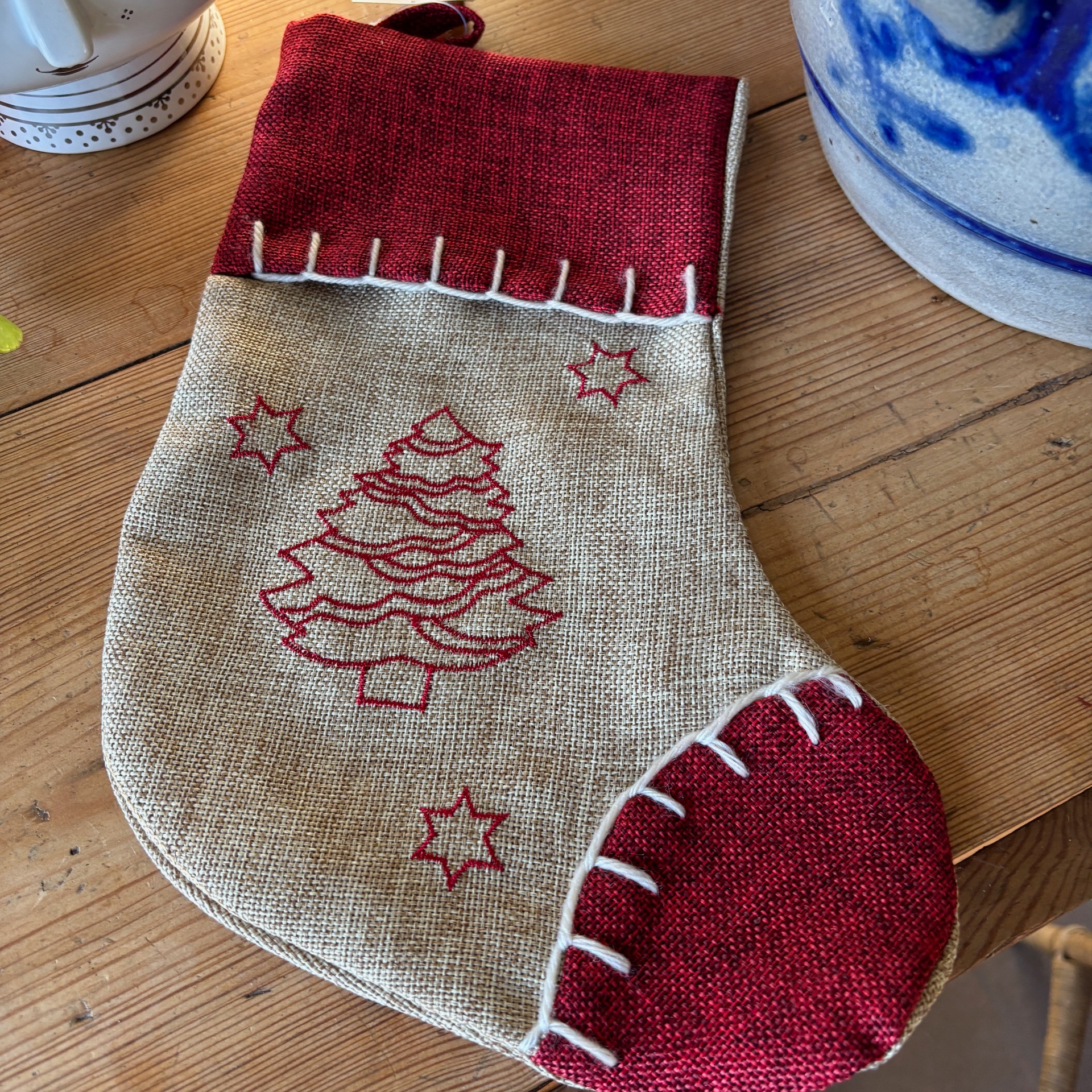 Ganske enkel julestrømpe i stramei og maskinbroderi. Høyde er 30 cm og hempe til oppheng, selvsagt.