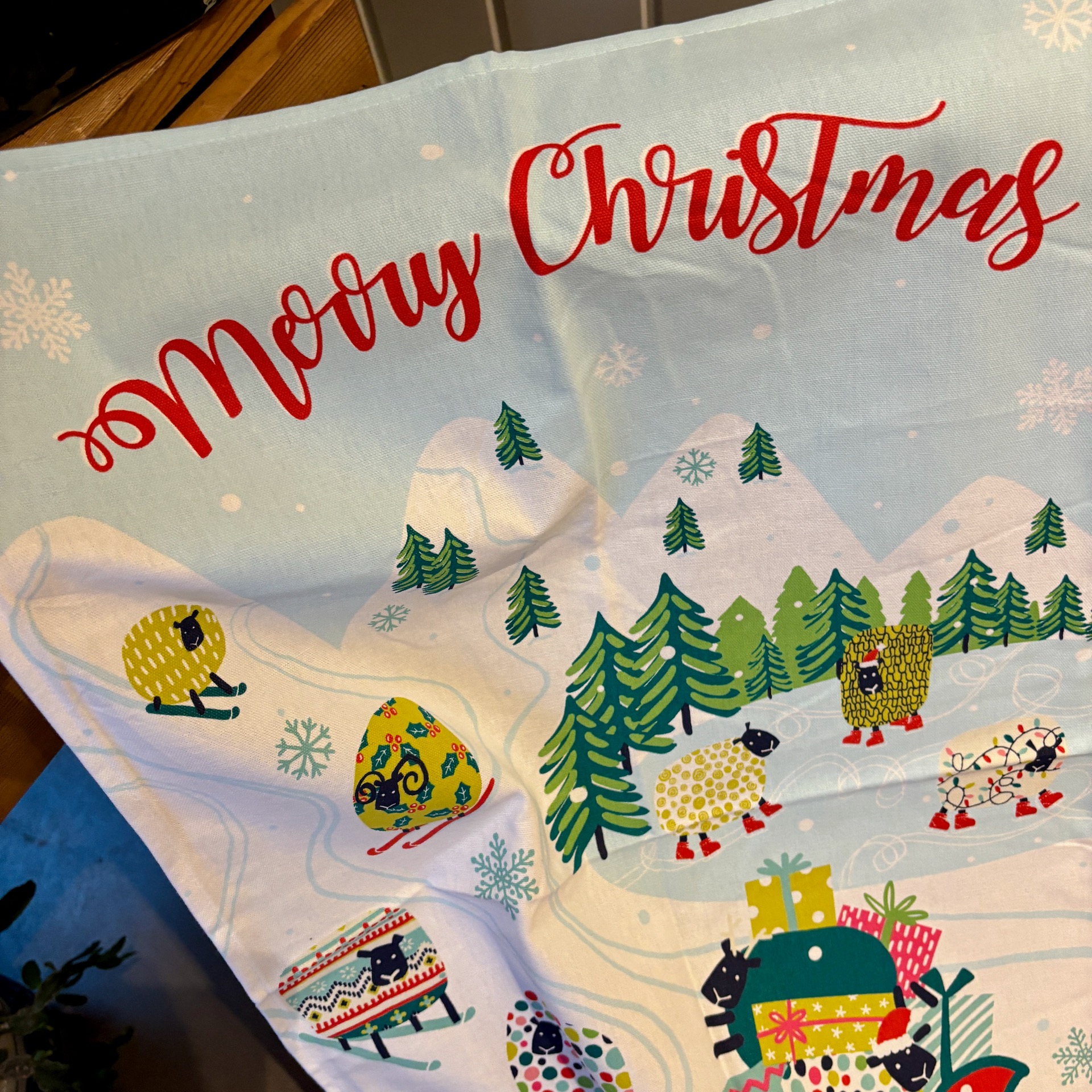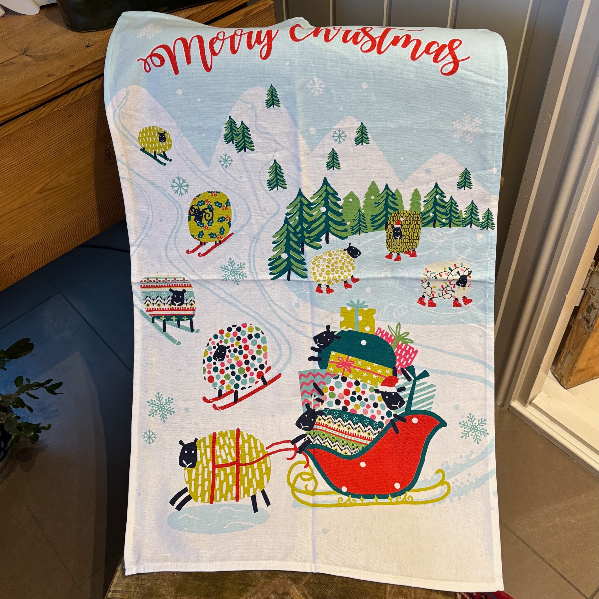 Julete oppvaskhåndkle med "Merry christmas" som tekst og vinterlig motiv. Det er laget i 100% bomull av irske Ulters Weavers. Størrelse er 46x77 cm.
