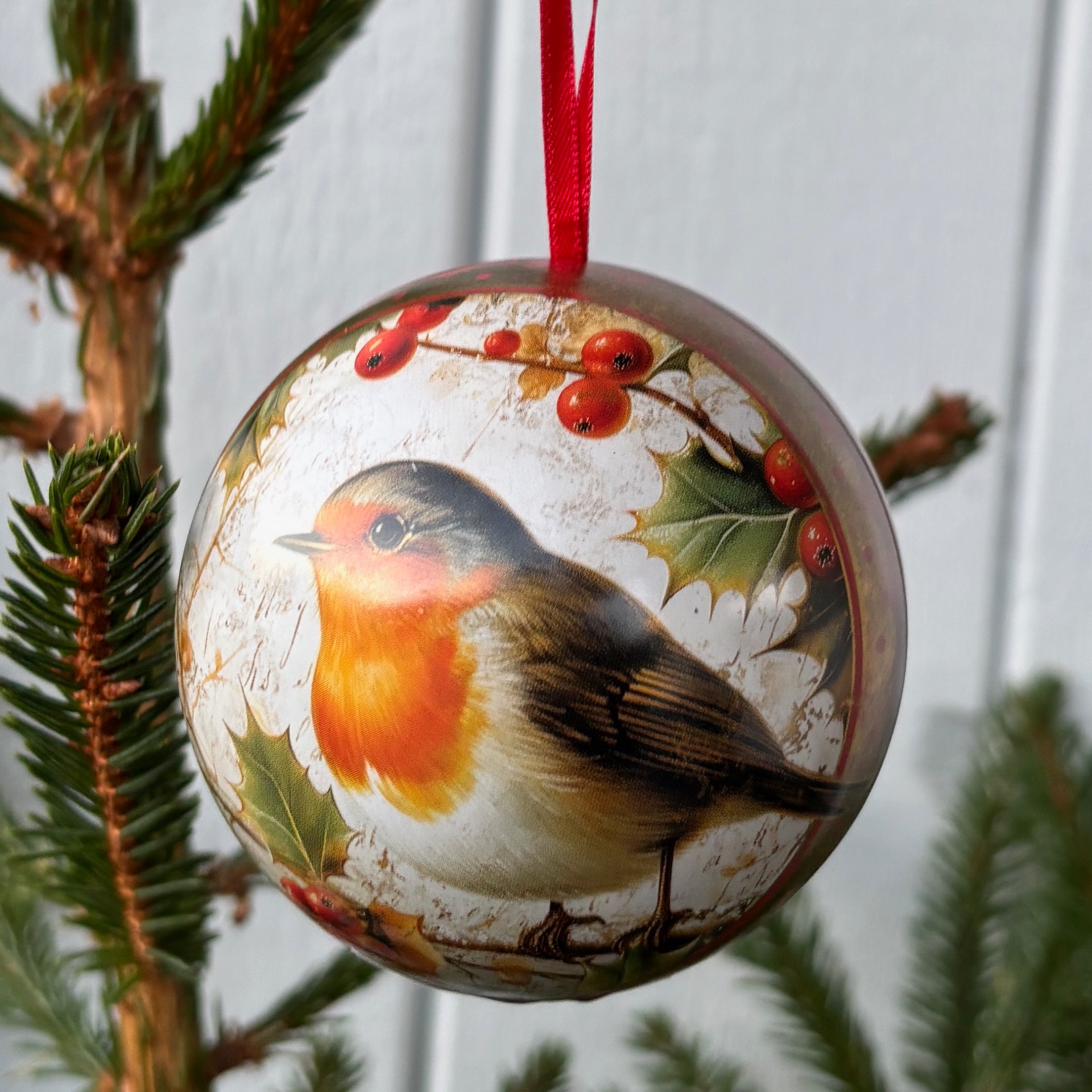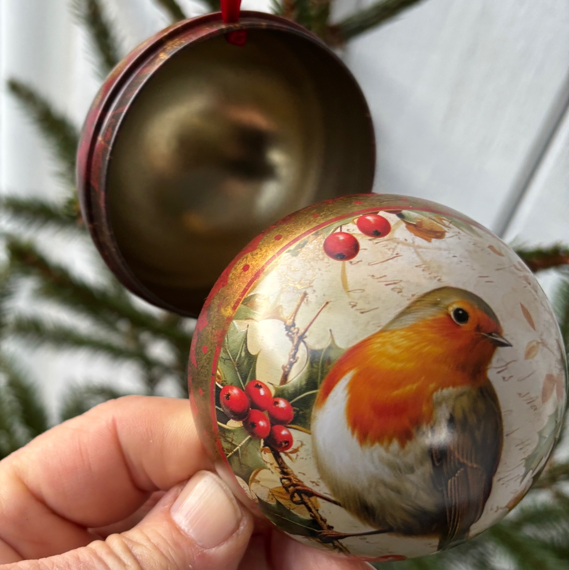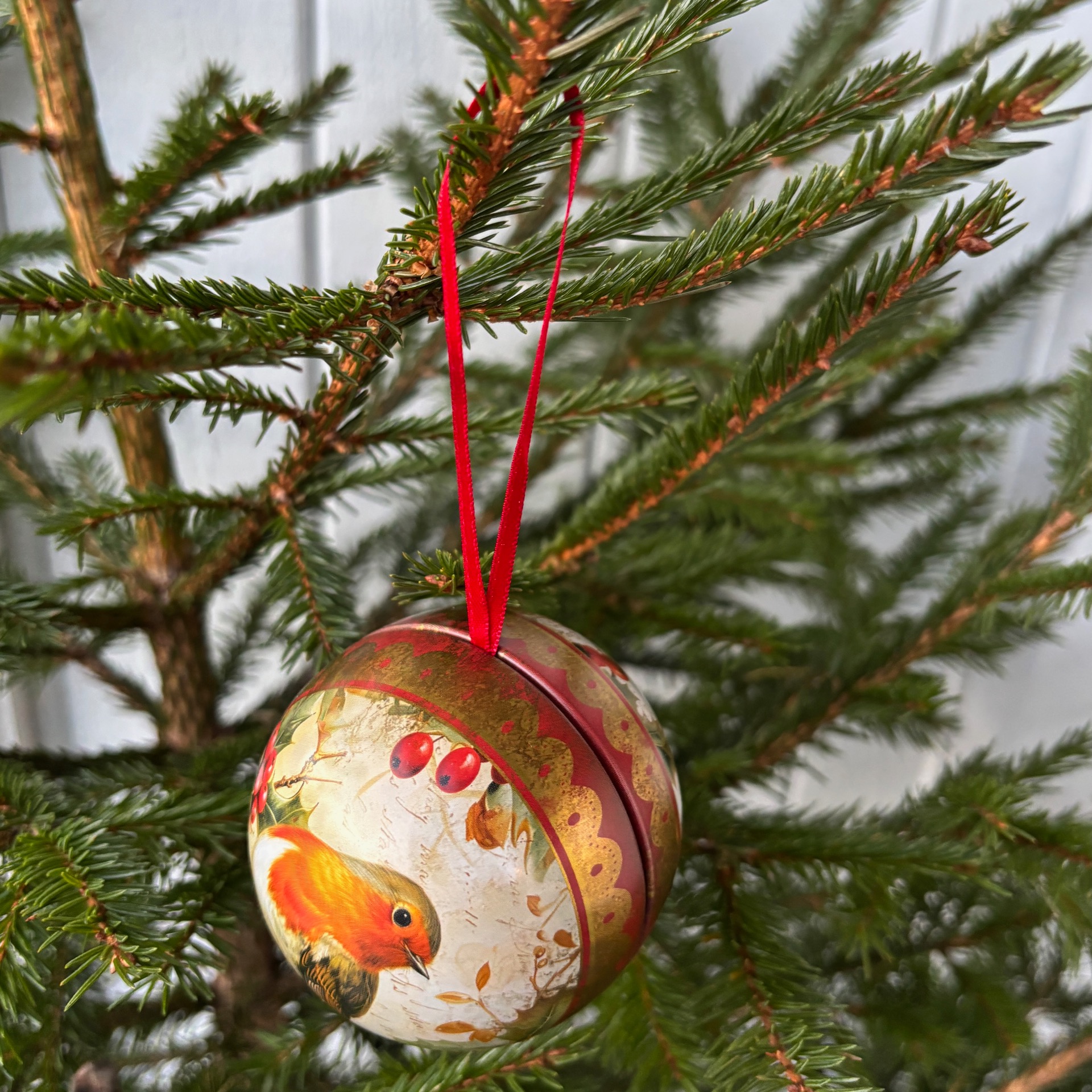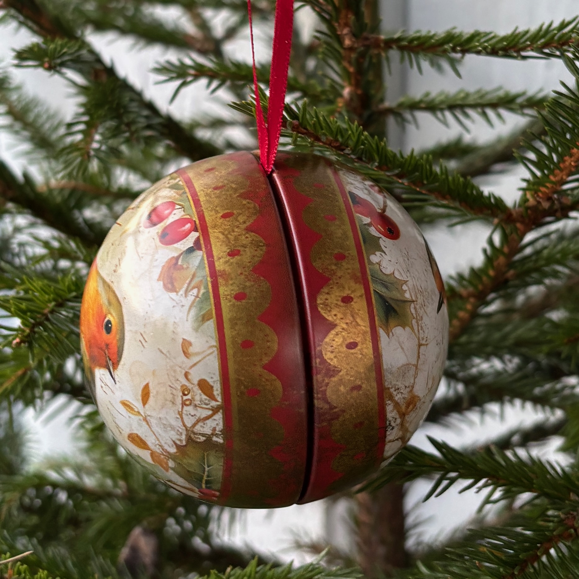 Vakker, rund julekule i metall med samme motiv på begge sider: Rødstrupe og kristtorn. Fin detalj: Kulen kan deles i to og du kan legge ett eller annet inni der, hvis du ønsker. Kan jo være en morsom sak å putte en bitteliten julegave inni (dyre små ting feks) :-)