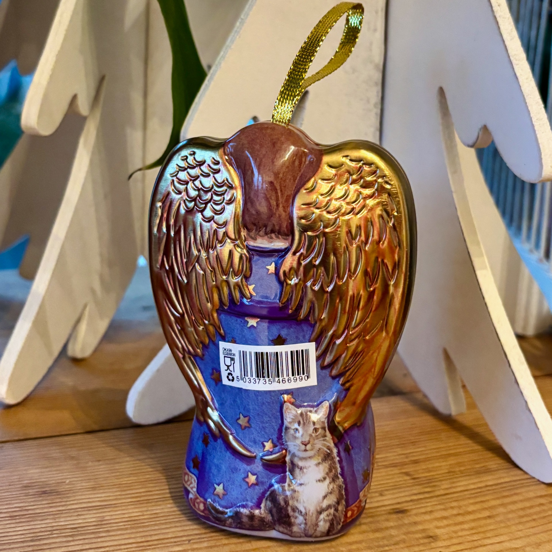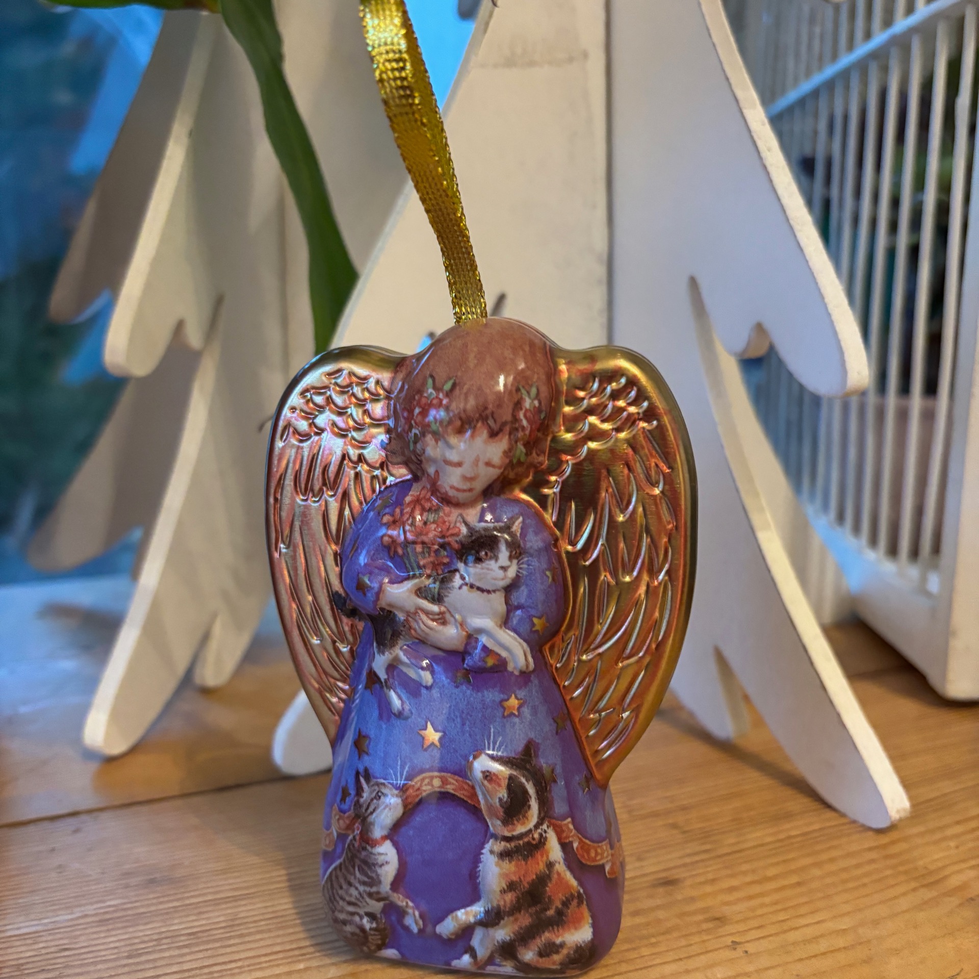 Søt juletrepynt i metall med motiv av en engel som holder katter. Den kan deles (på langs), så her er det mulig å legge inn noe godteri feks.