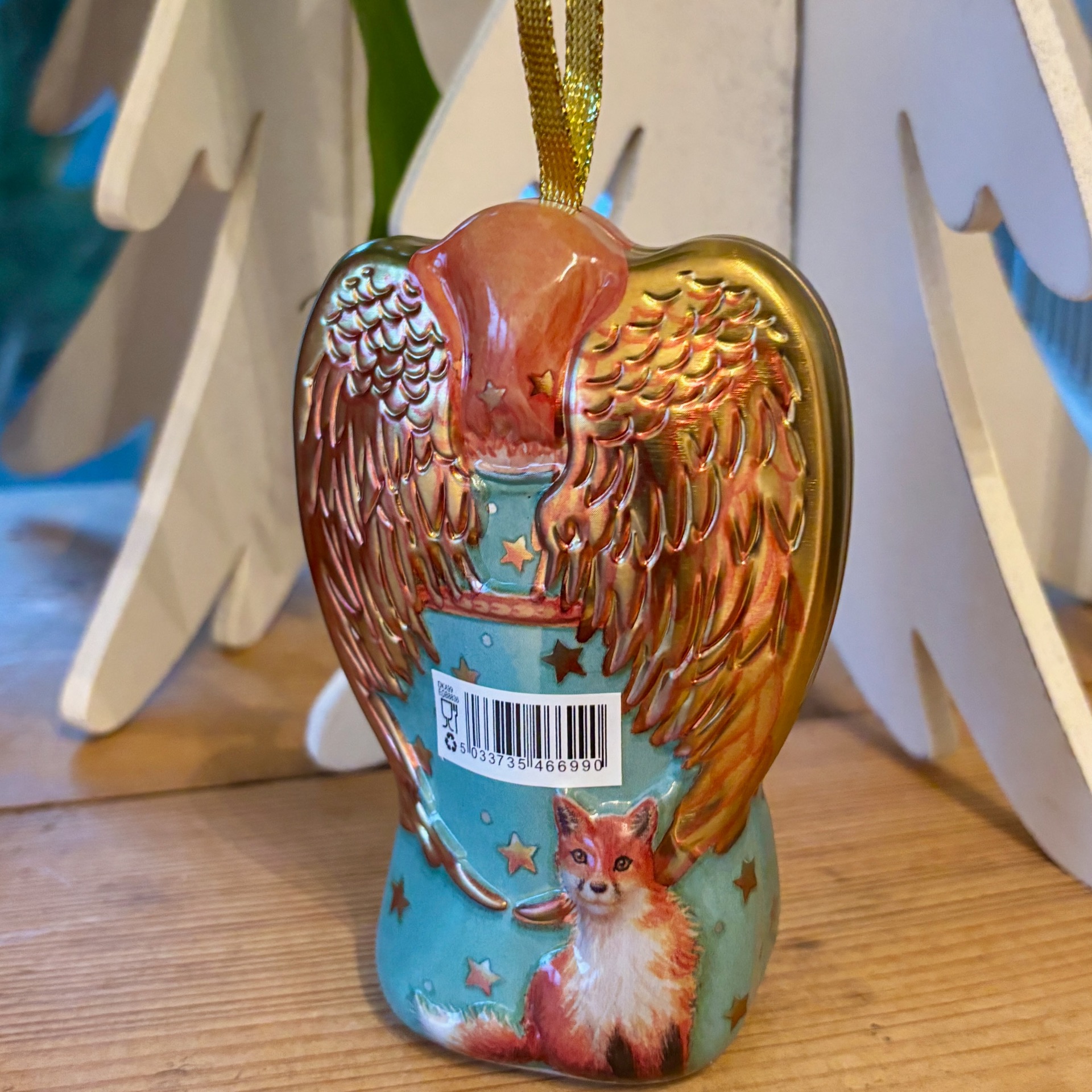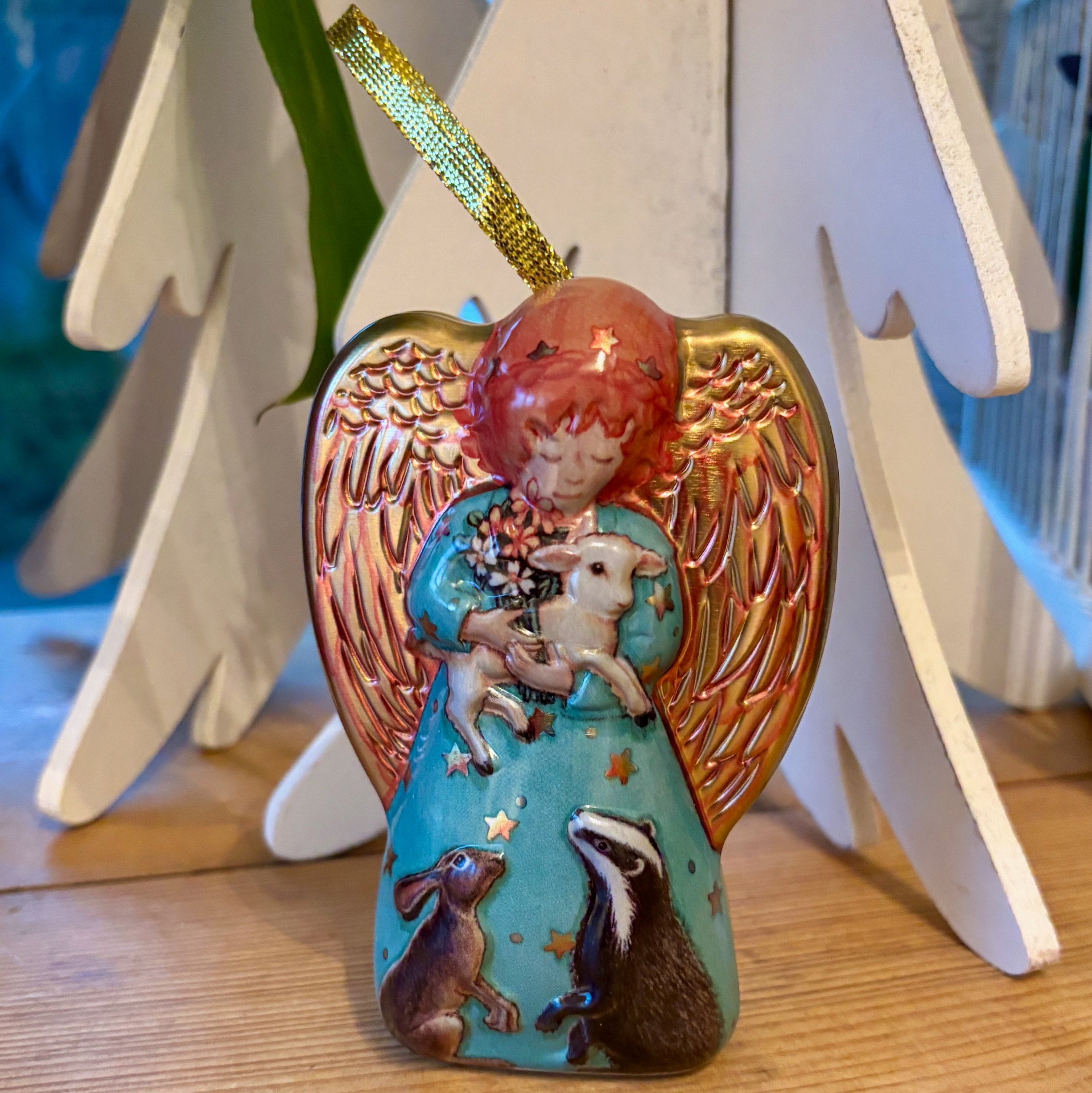 Søt juletrepynt i metall med motiv av en engel som holder et lam og en harepus og en grevling (!) er tilskuere. Den kan deles (på langs), så her er det mulig å legge inn noe godteri feks.