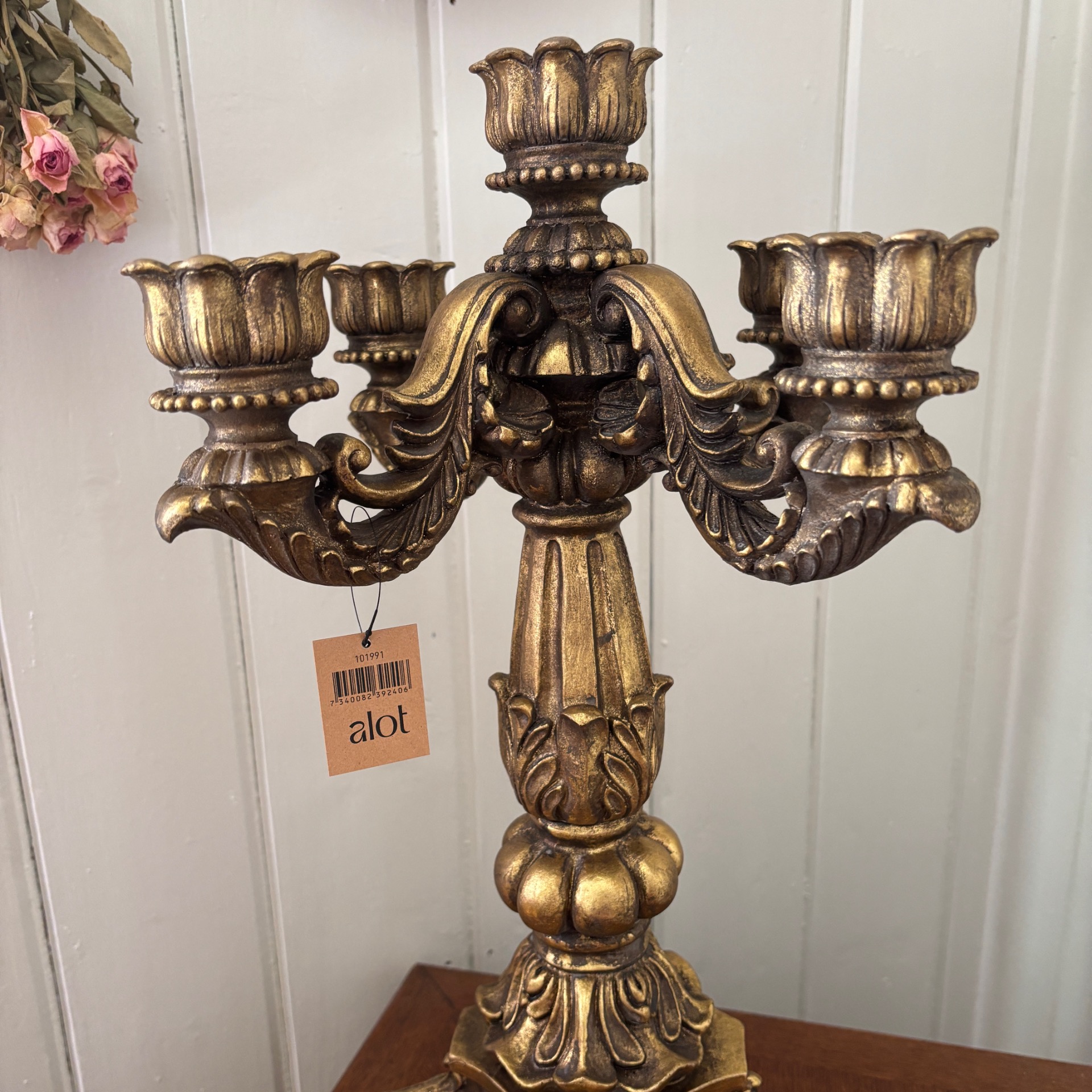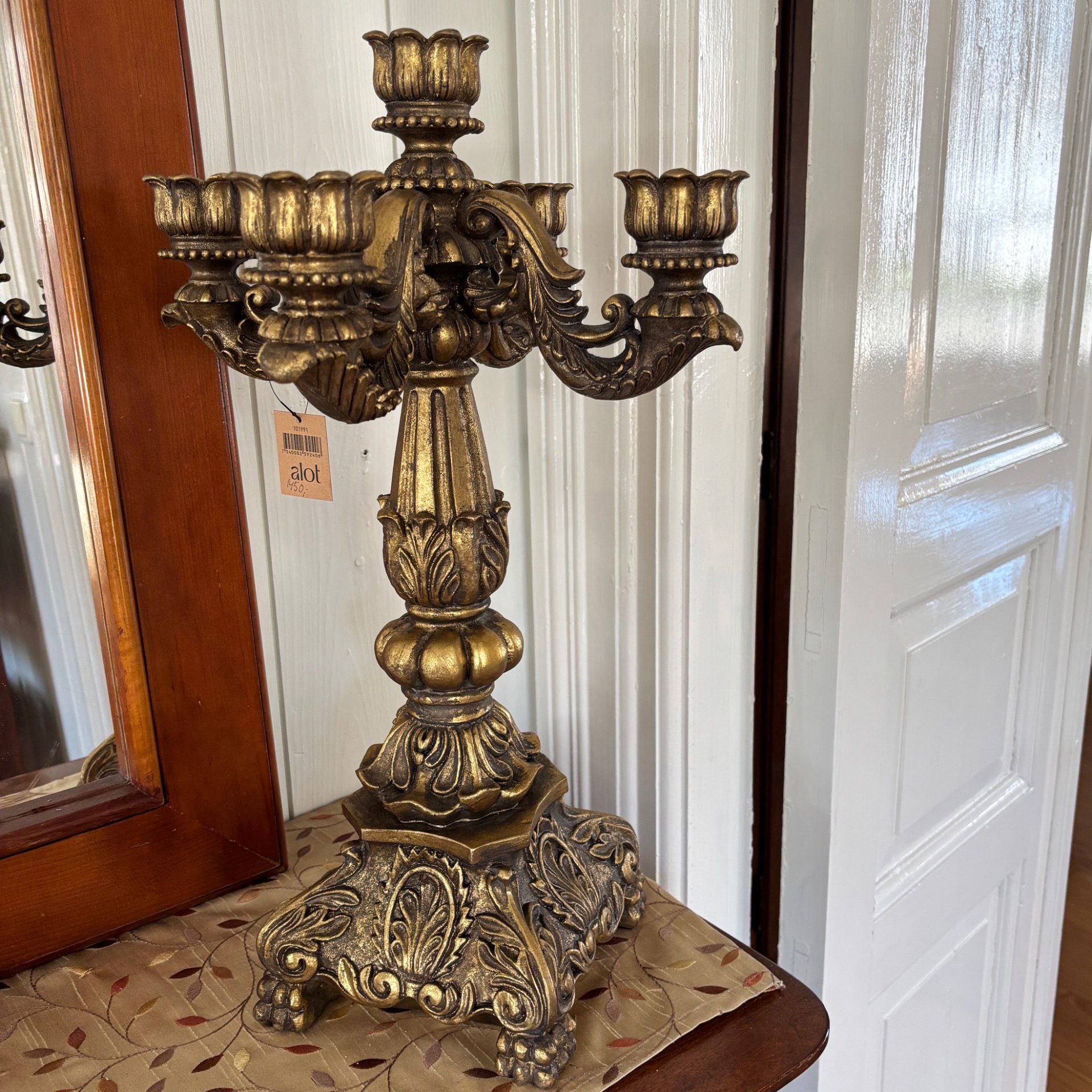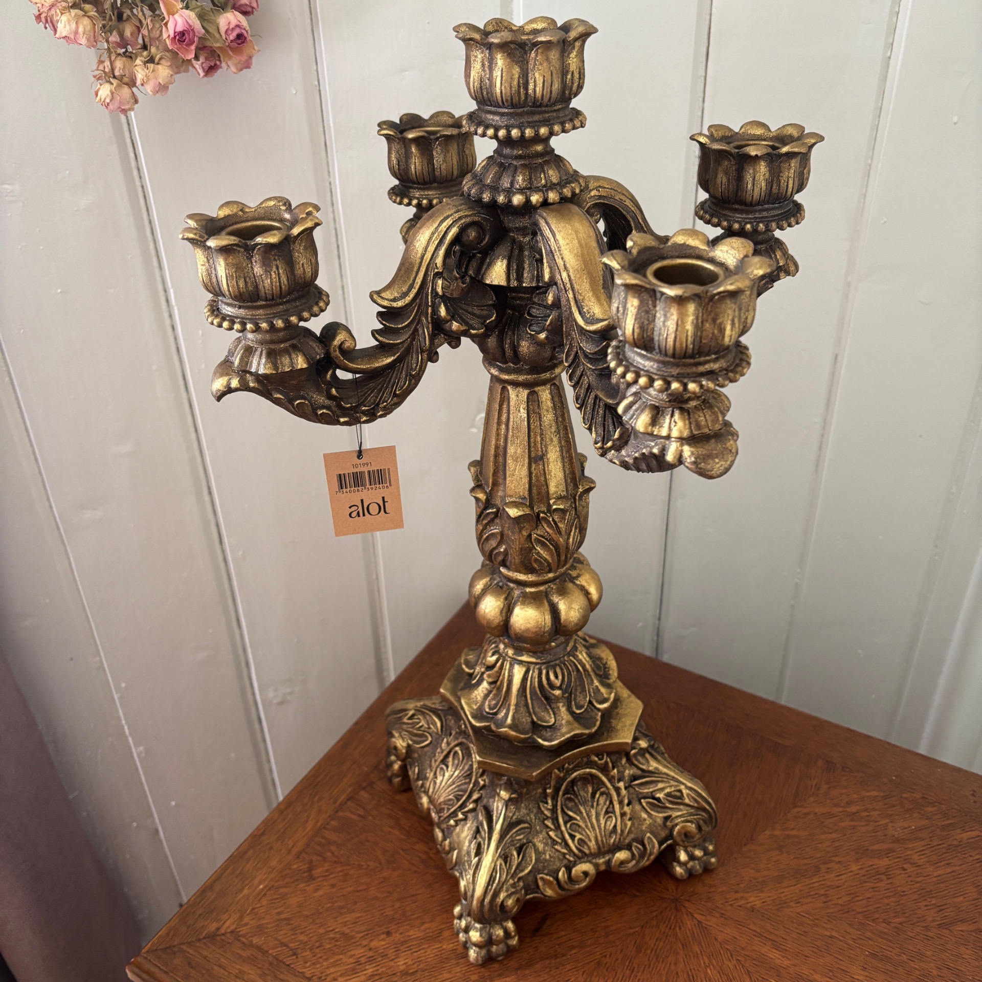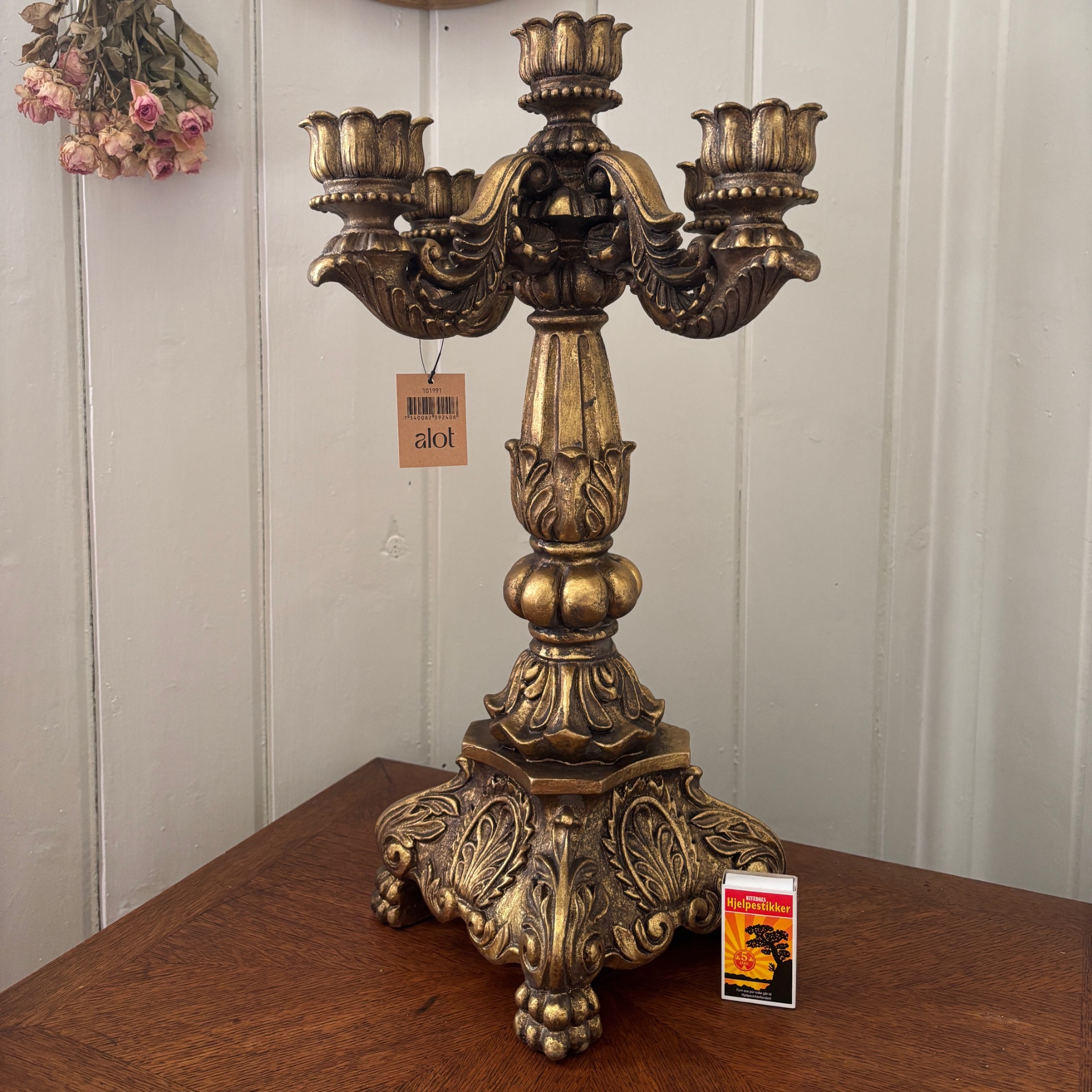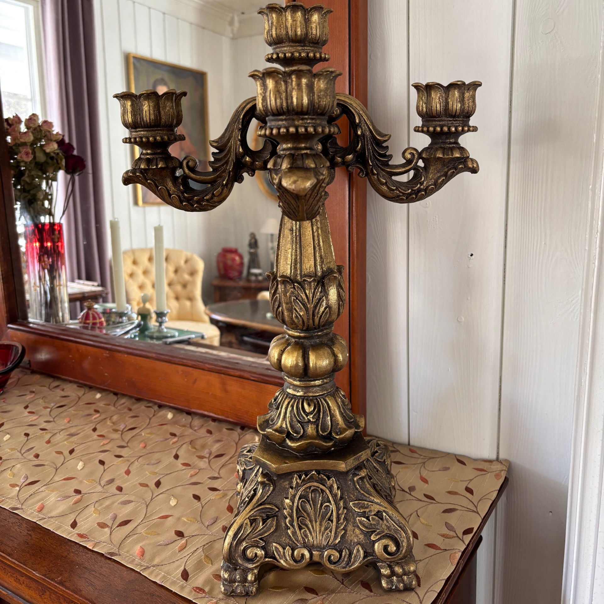 Stor og grandios kandelaber i gullfarge med et sterkt preg av barokk over seg. Den er hele 50 cm høy og 31 cm i omkrets. 5 armer. Vanlig stearinlys passer selvsagt her. Den er laget i polyresin. Med alt som er laget av polyresin: Her må ikke lysene IKKE brenne helt ned - da kan staken bli misformet.
