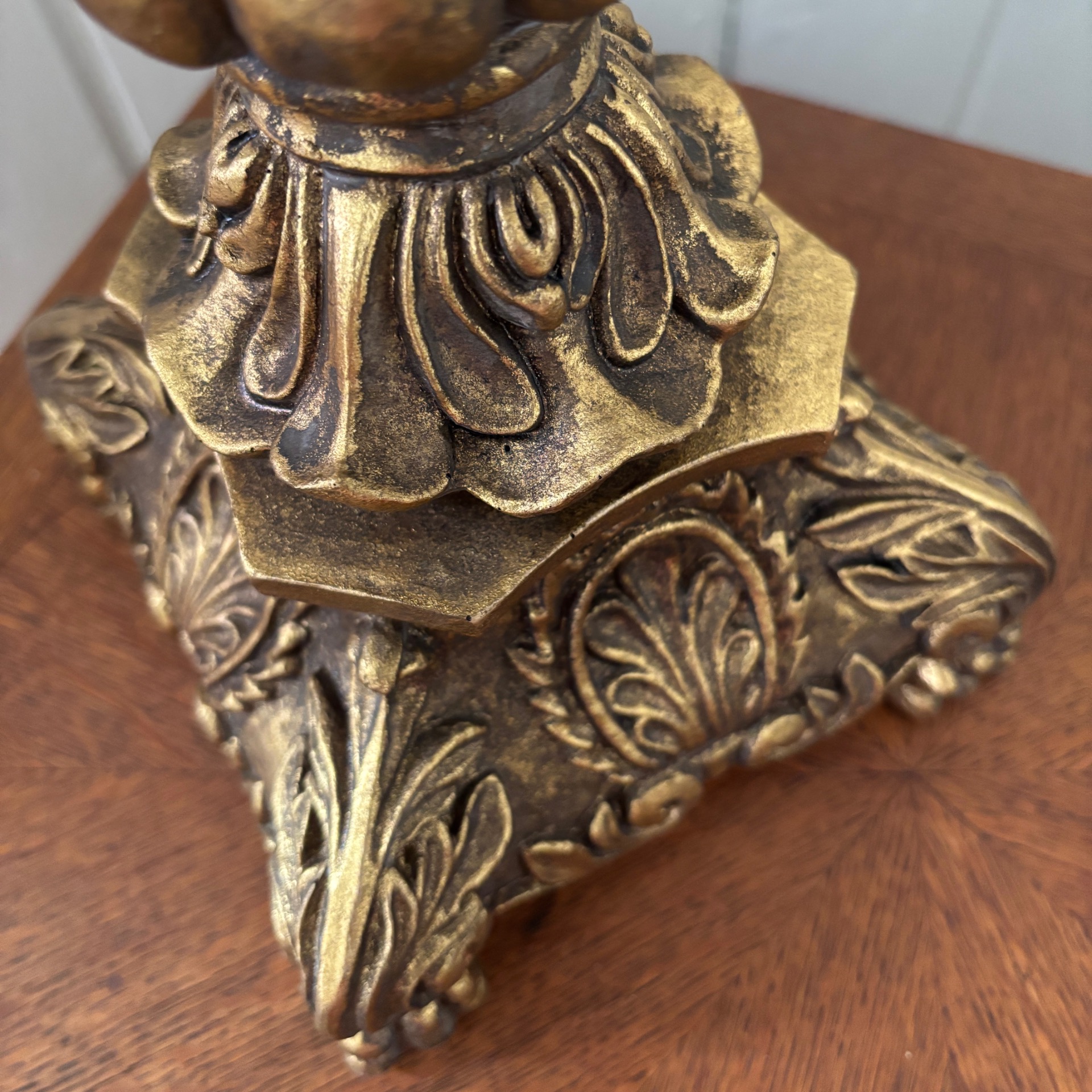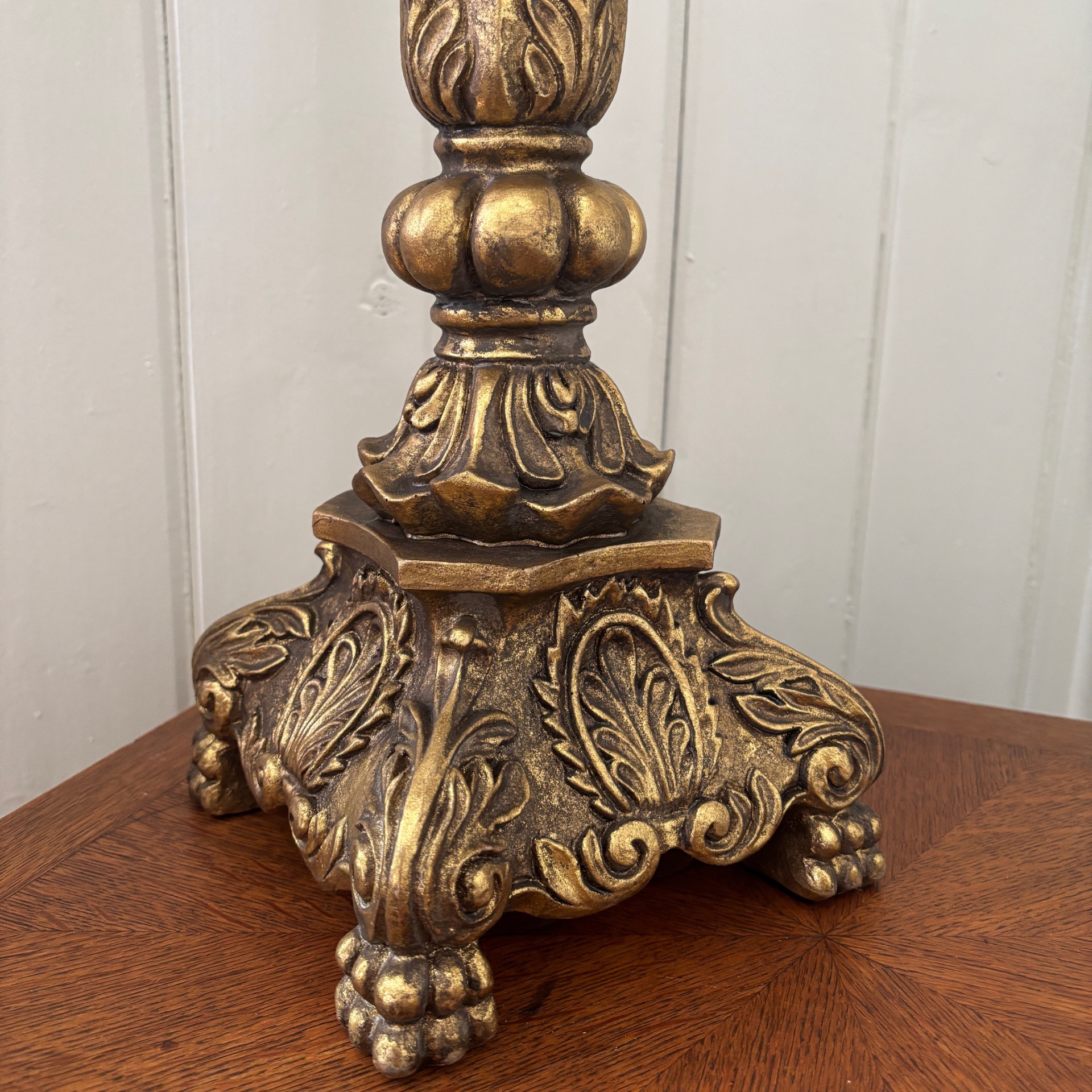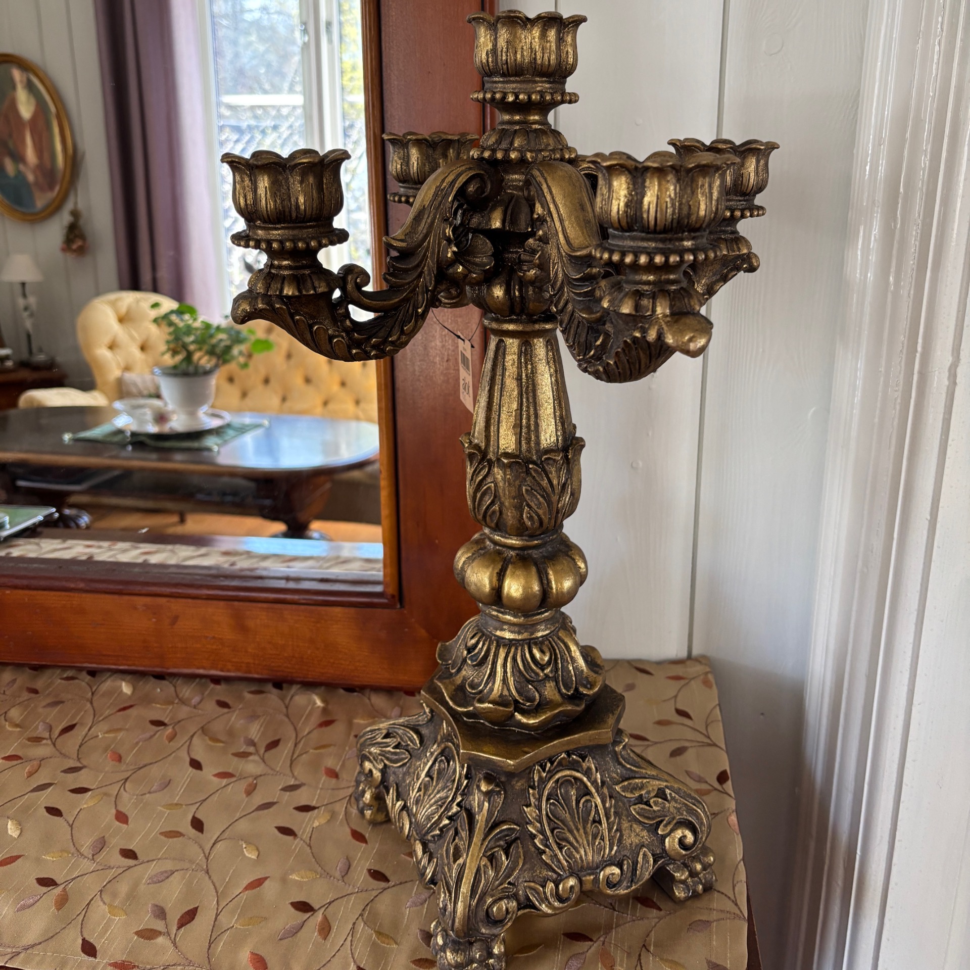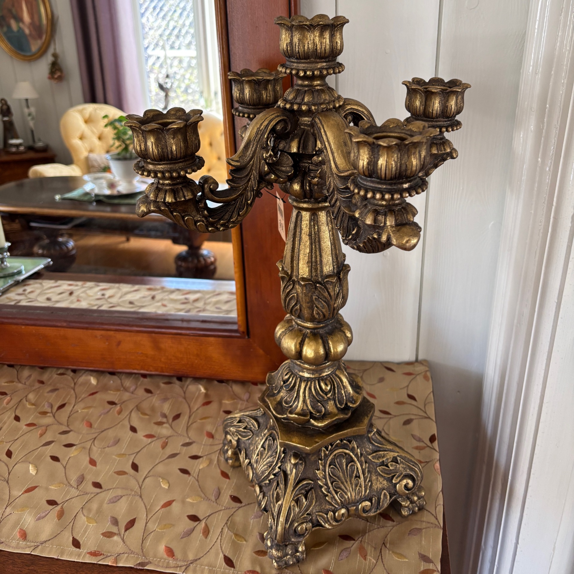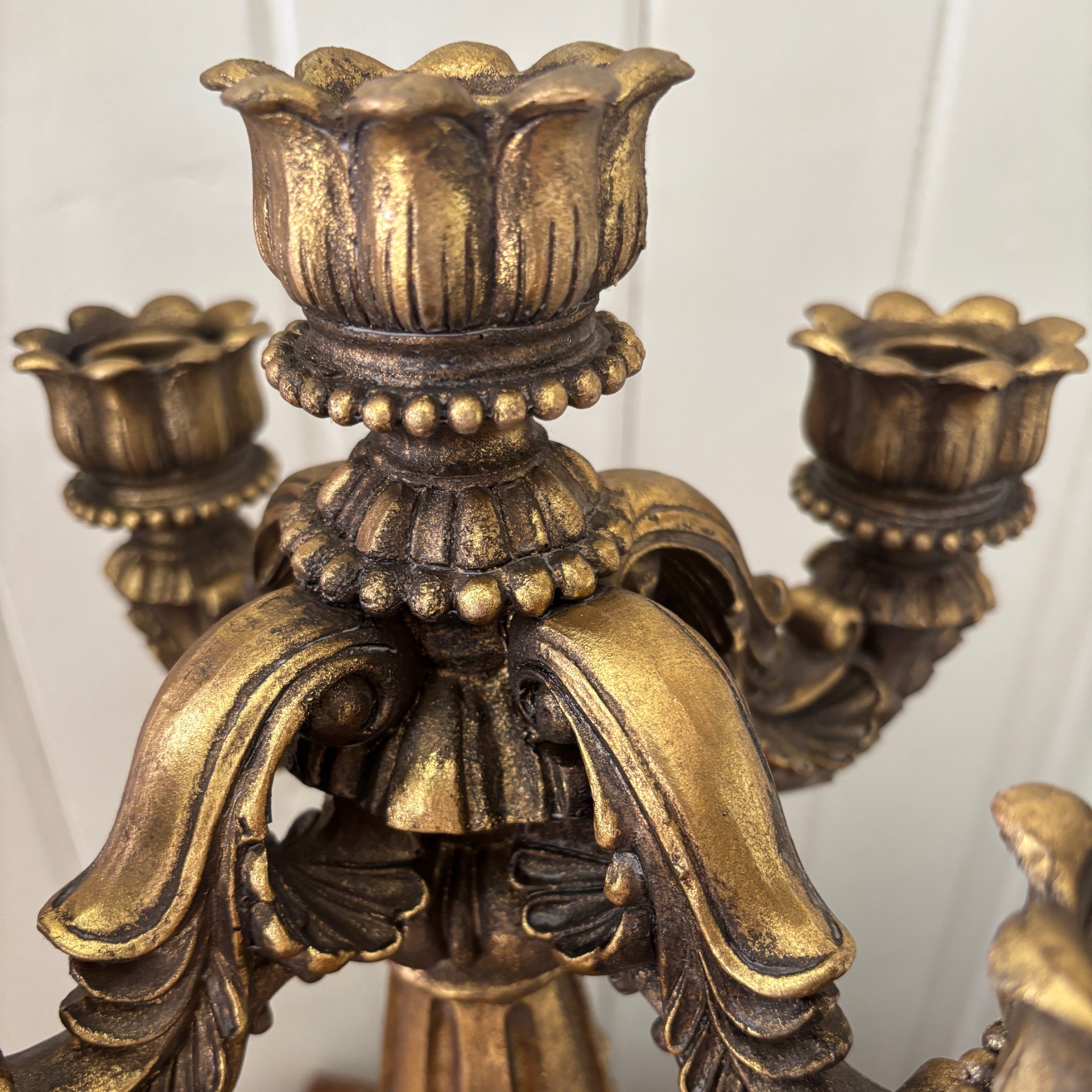 Stor og grandios kandelaber i gullfarge med et sterkt preg av barokk over seg. Den er hele 50 cm høy og 31 cm i omkrets. 5 armer. Vanlig stearinlys passer selvsagt her. Den er laget i polyresin. Med alt som er laget av polyresin: Her må ikke lysene IKKE brenne helt ned - da kan staken bli misformet.