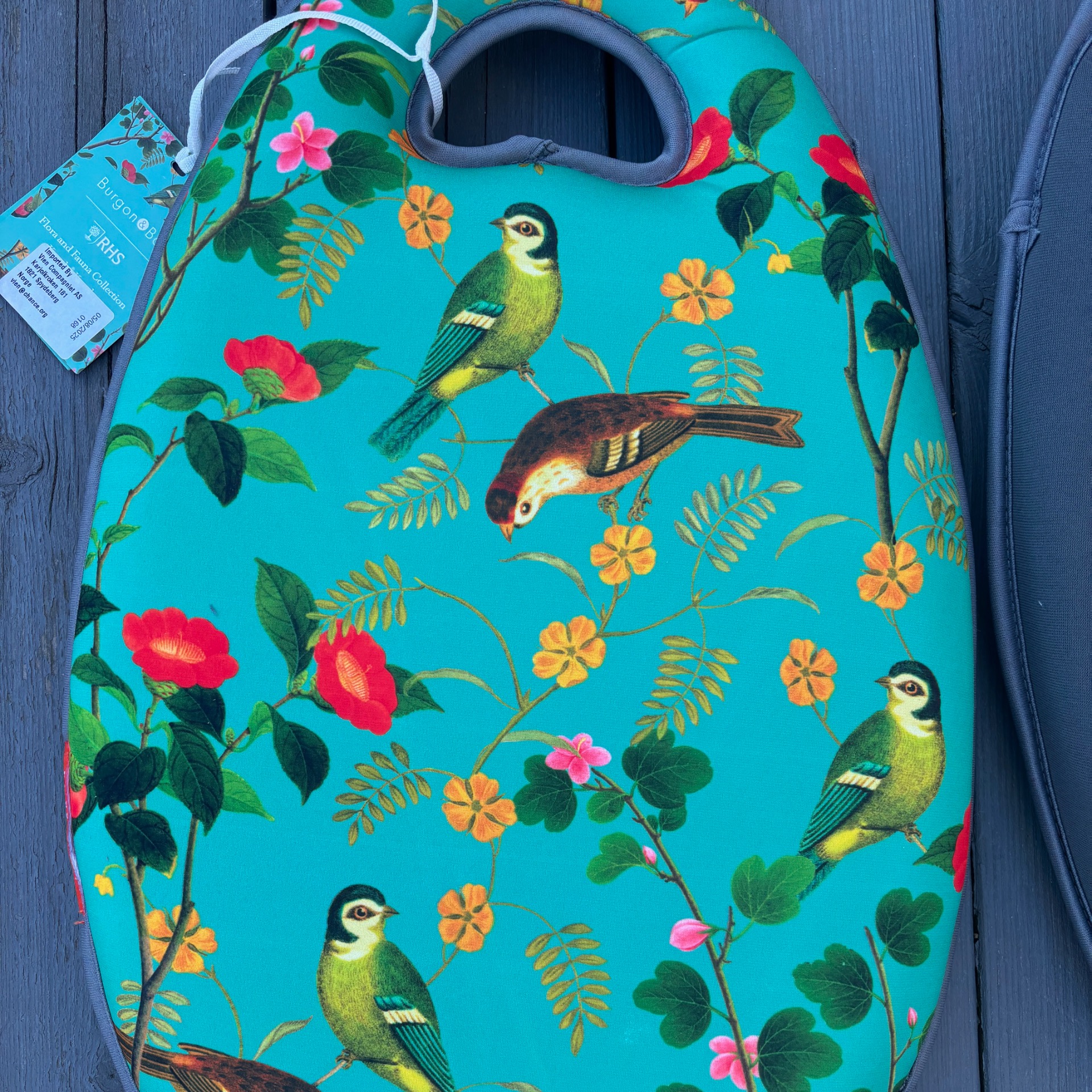 Det glade mønsteret med fugler og blomster i rødt og oransje på grønn bakgrunn er til å bli strålende glad av. :-) Jeg vil påstå at dette er et produkt som du vil gledes over når du arbeider i hagen - det er deilig å ha noe mykt å sette knærne på. Alle som har stått på knærne over litt tid, vet at det som regel ikke er spesielt godt.