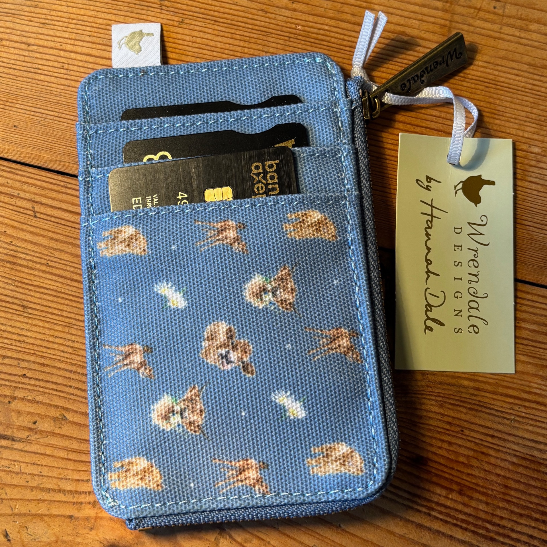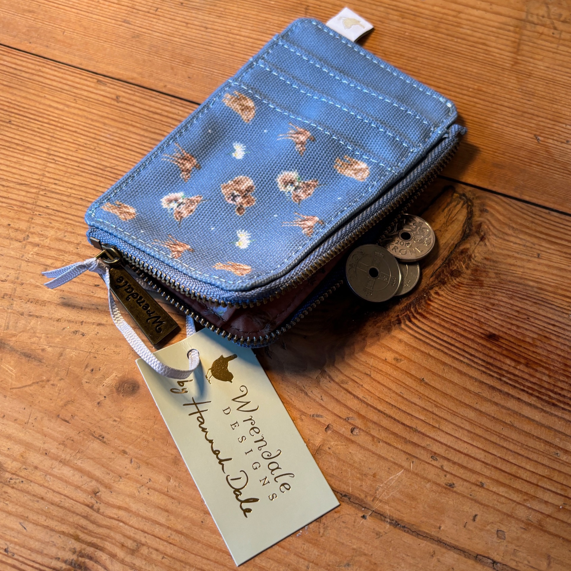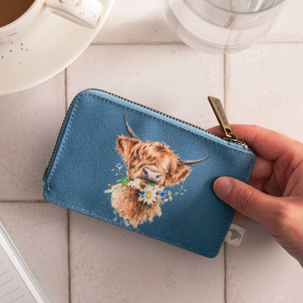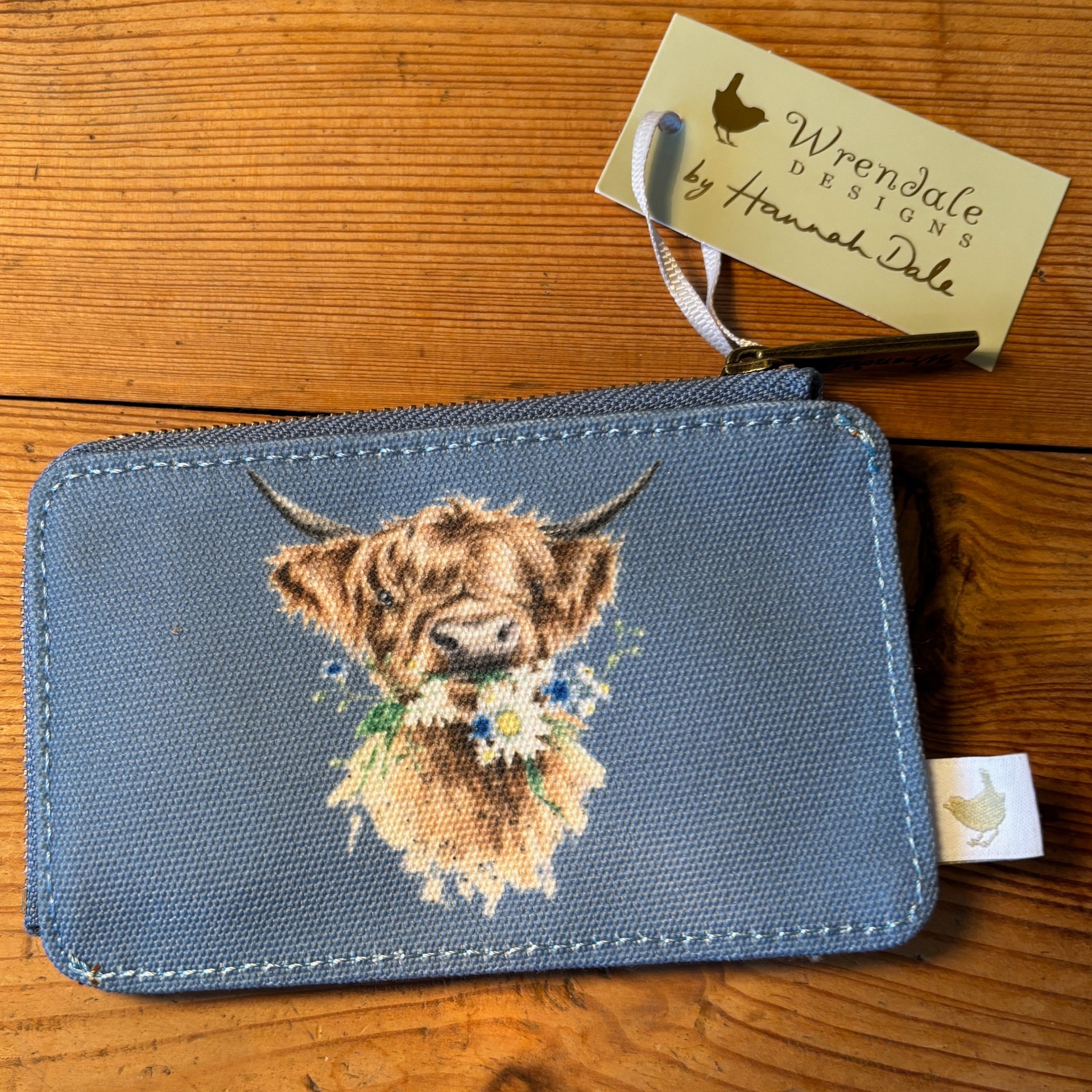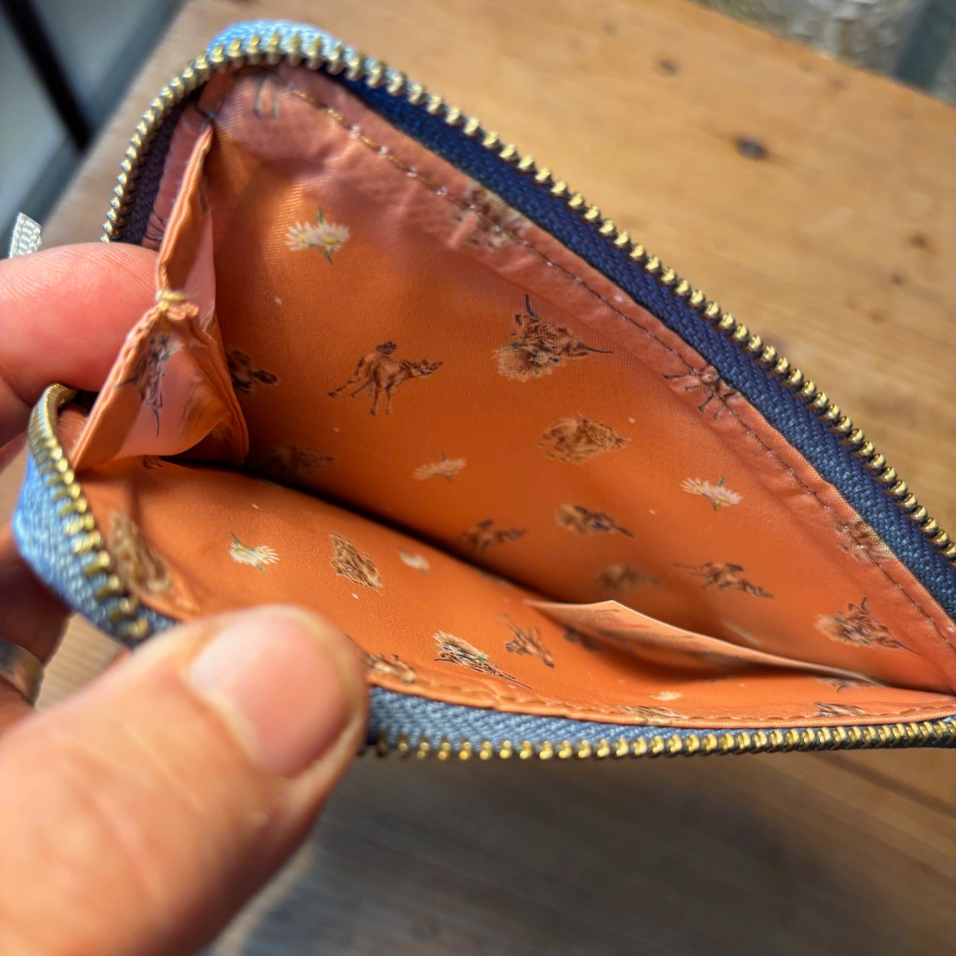 Kort- og myntholderen (kan selvsagt brukes til sedler også) er laget i 100% resirkulert polyester. På fronten er det maskinbrodert motiv av en temmelig staselig okse. Bak er det plass til kort. God glidelås som går over to sider. Inni er det rosa innside med dyretegninger.