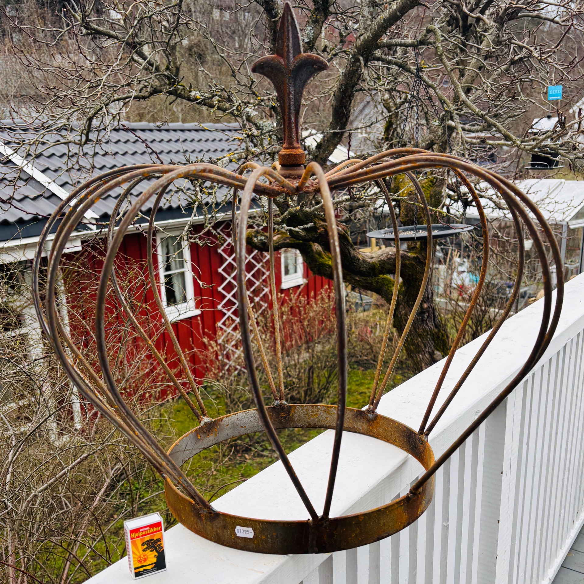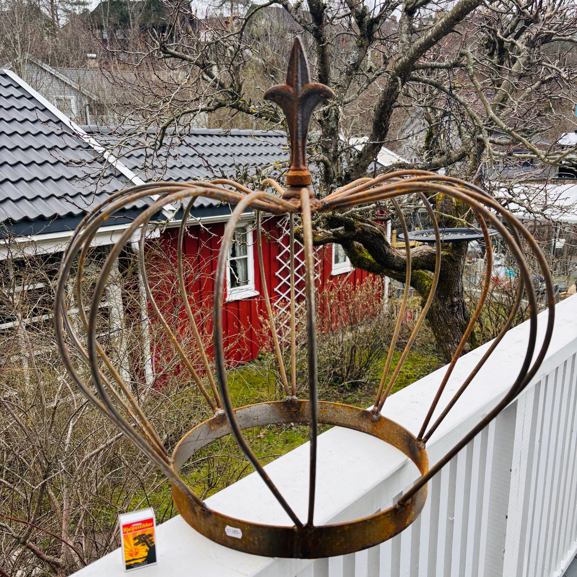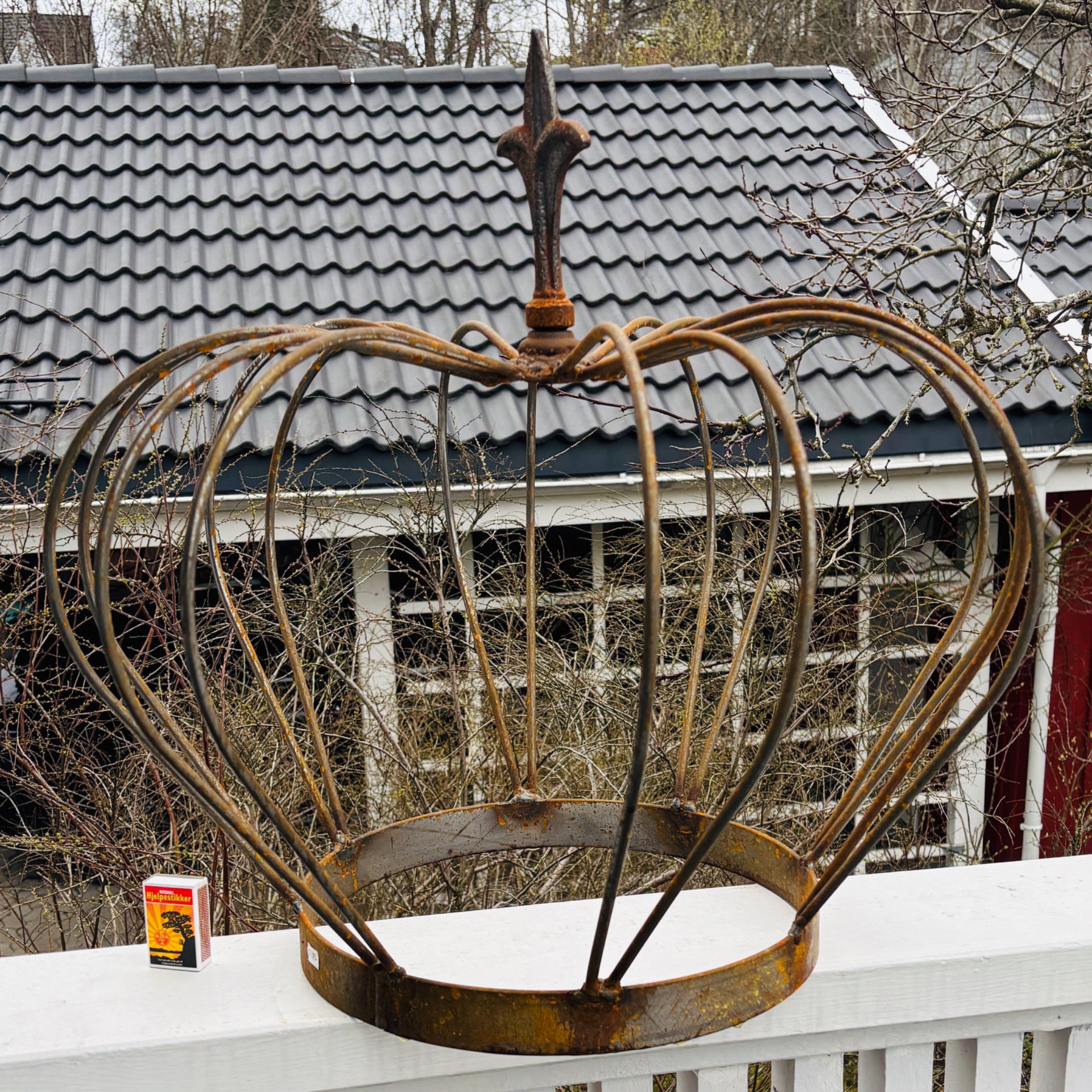 Stor, tung og ikke minst synlig krone i kraftig rustbehandlet metall. Denne er hele 54 cm høy og på det største er diameter 60 cm. Nederst er diameter 33,5 cm.